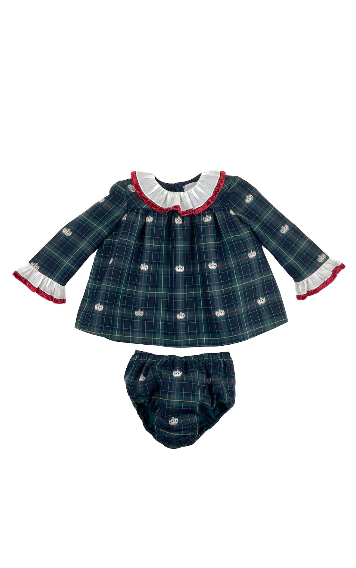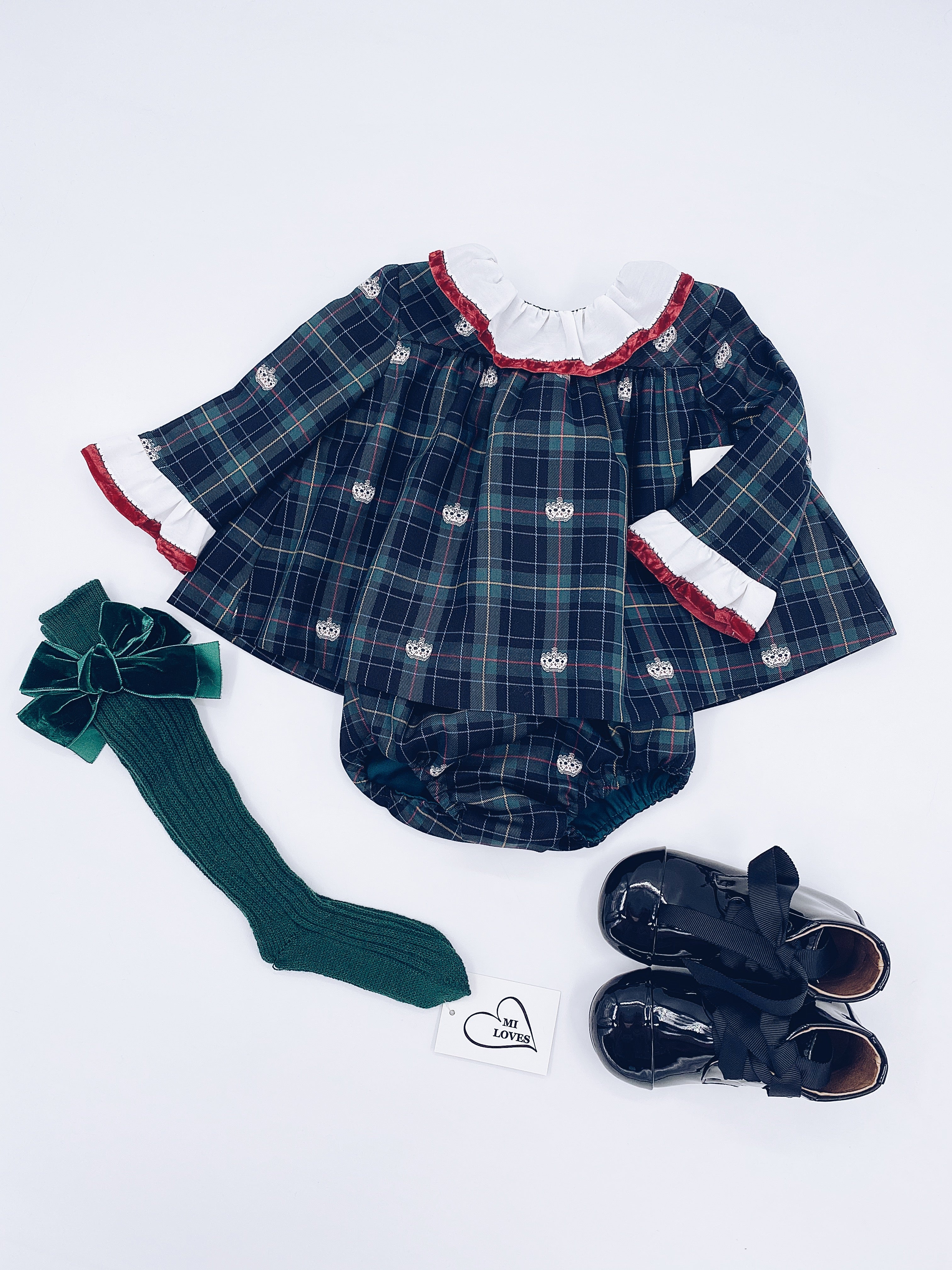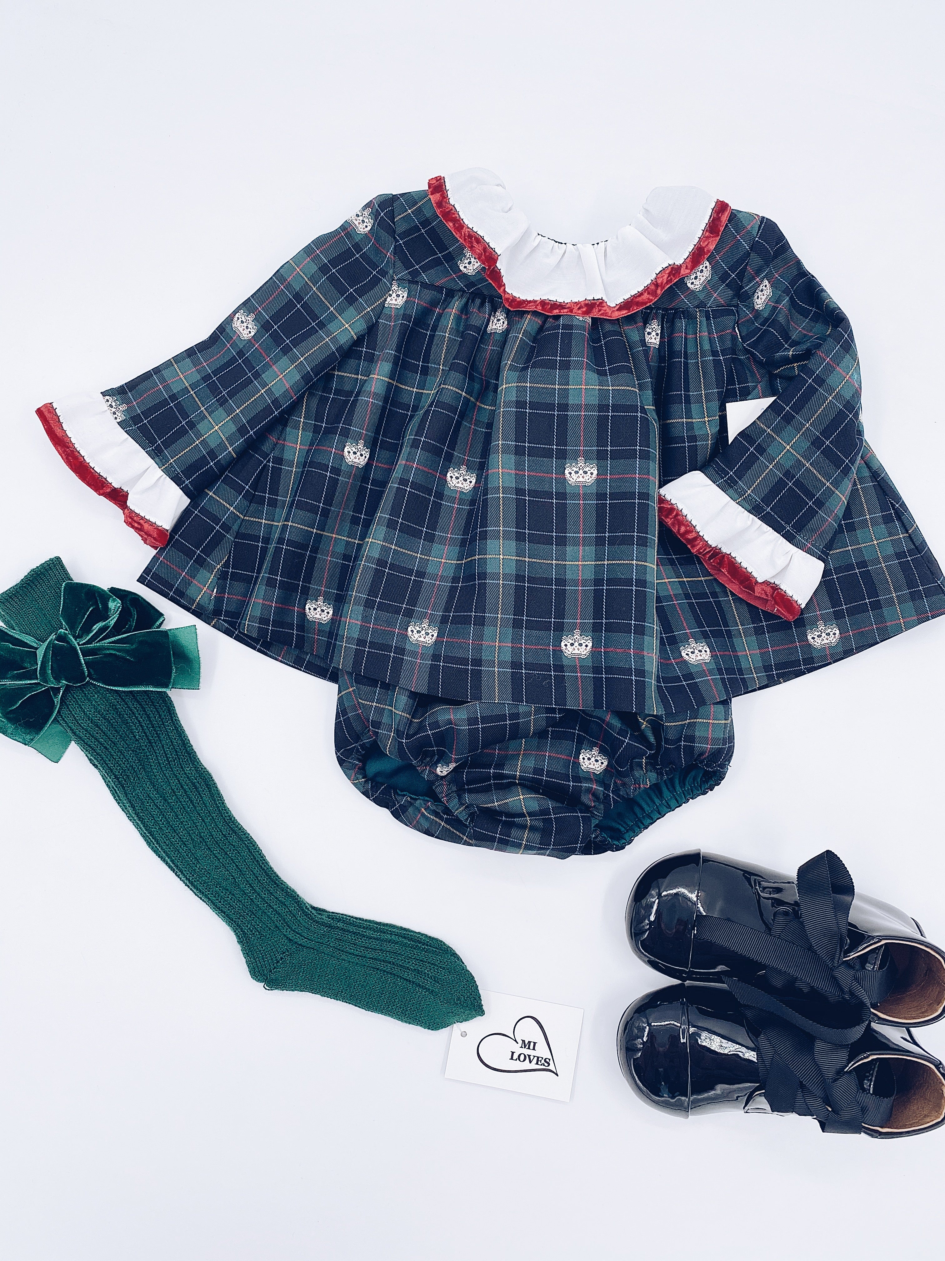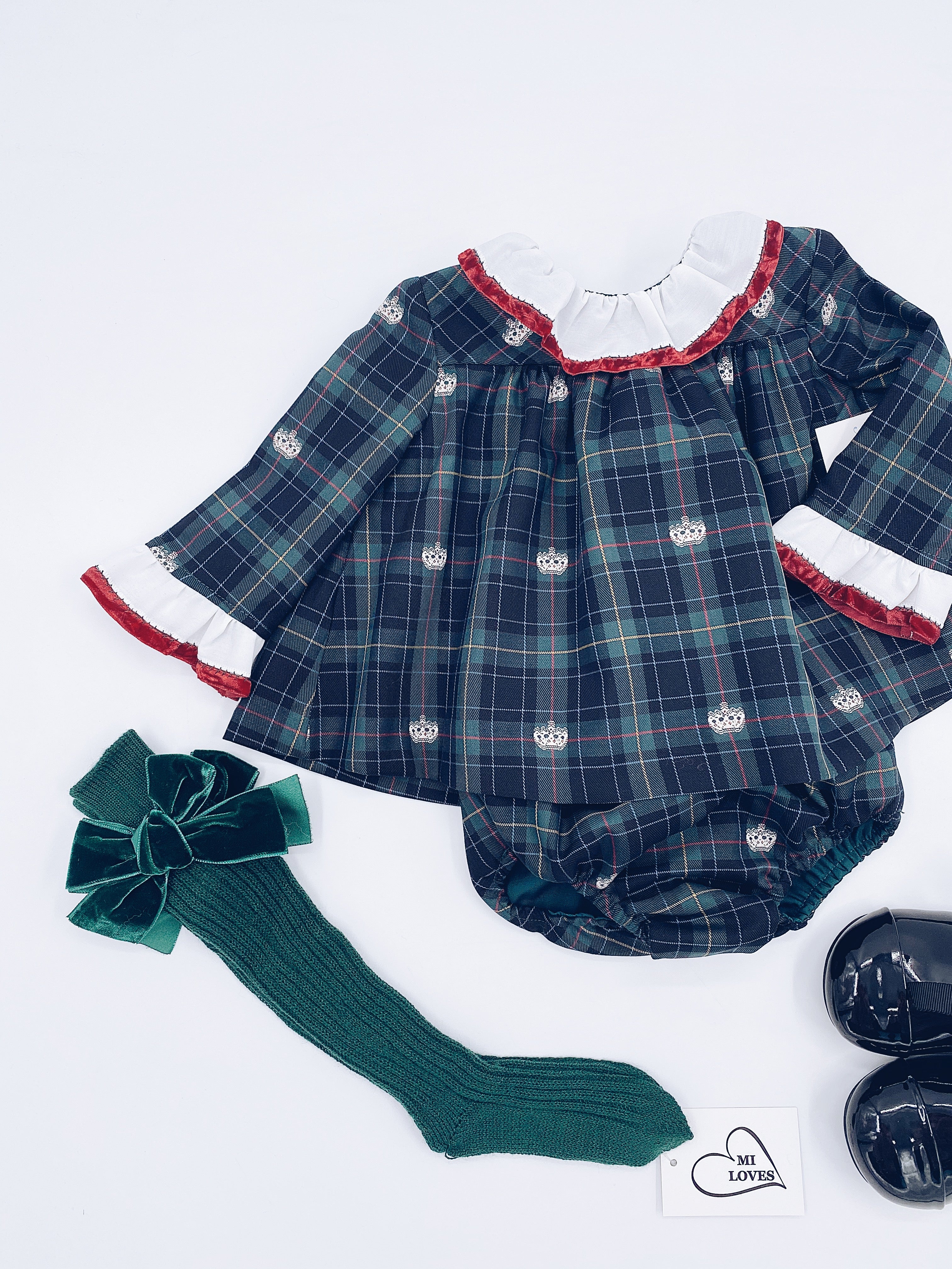 Beautiful Green tartan dress and bloomers 2 piece set with Crown details