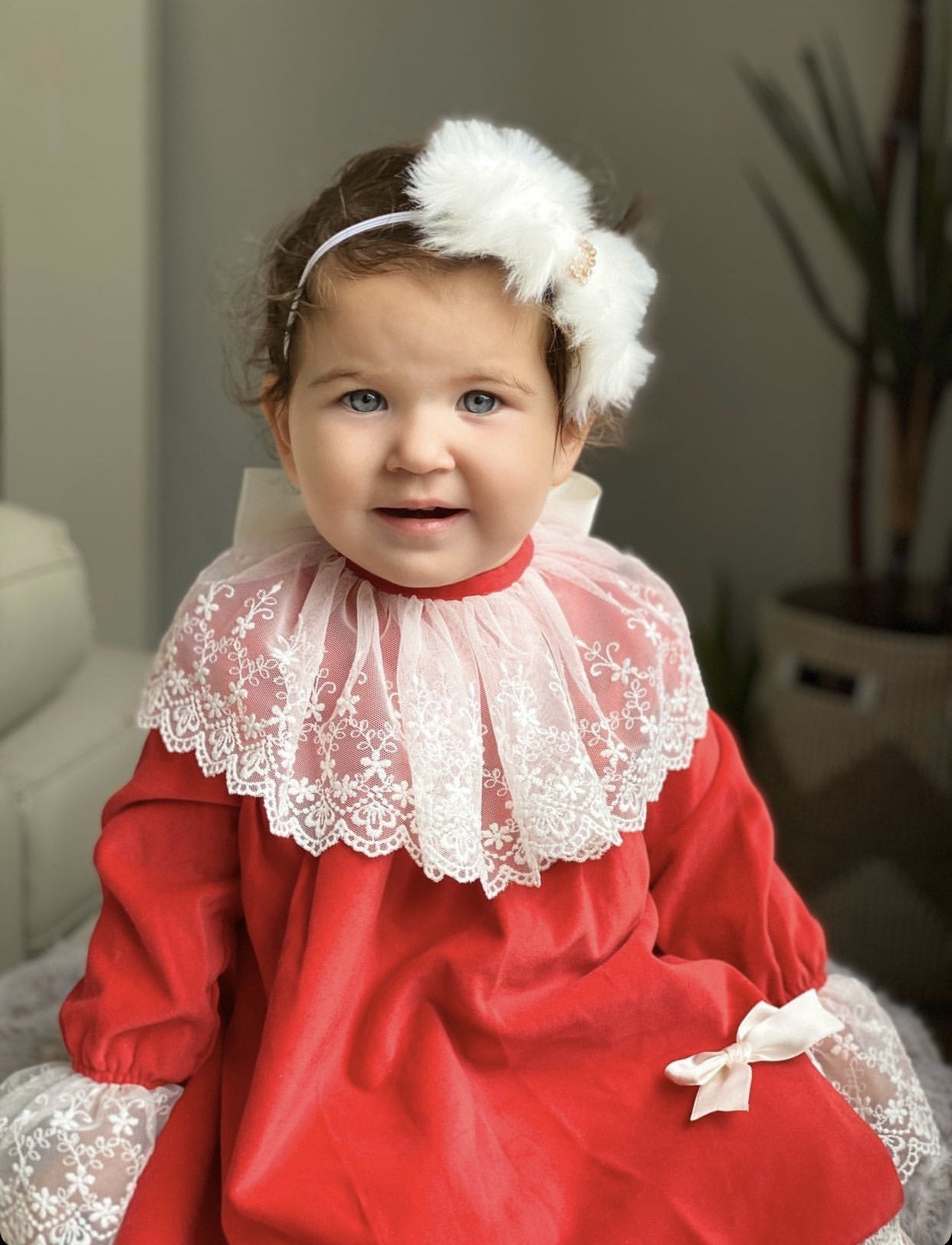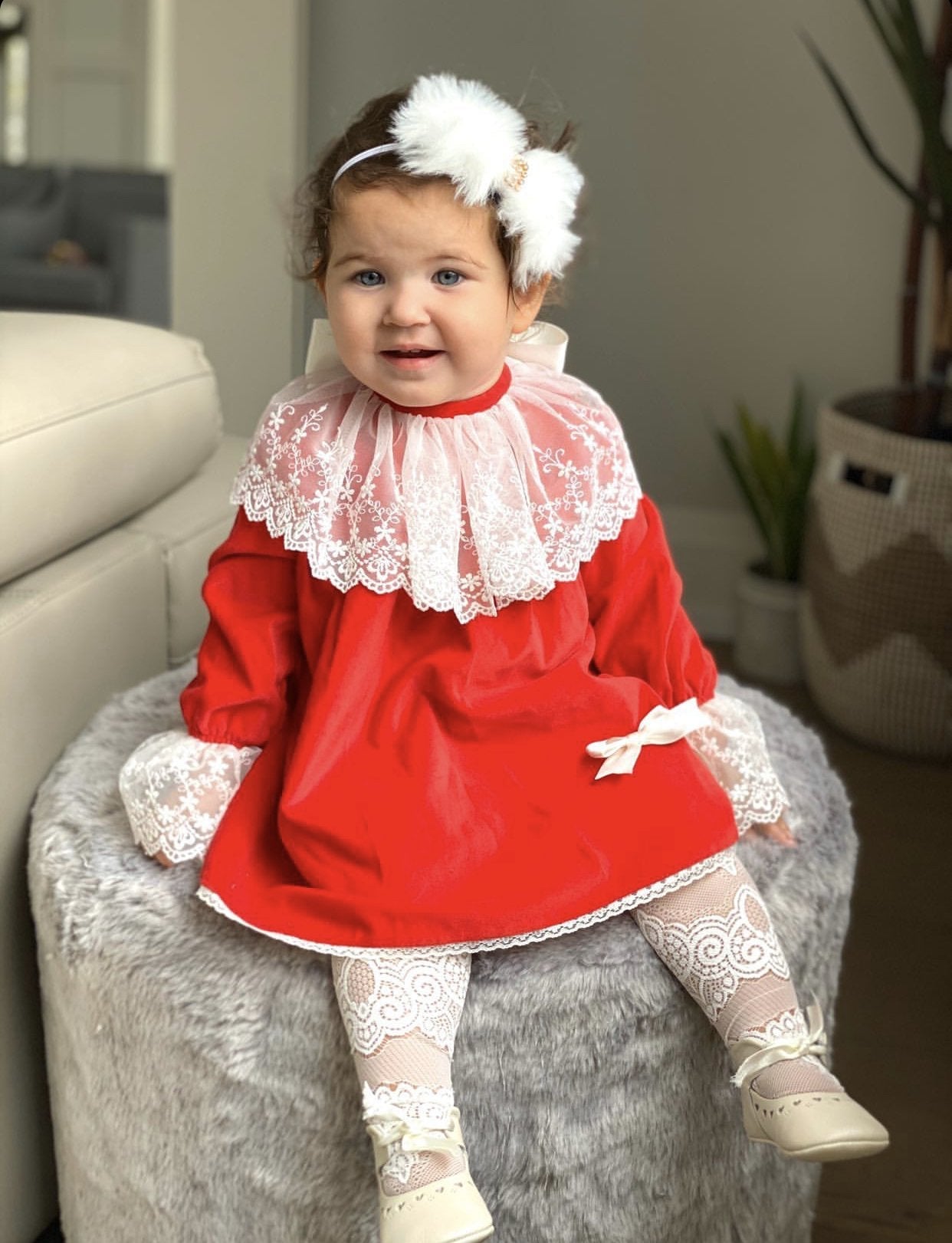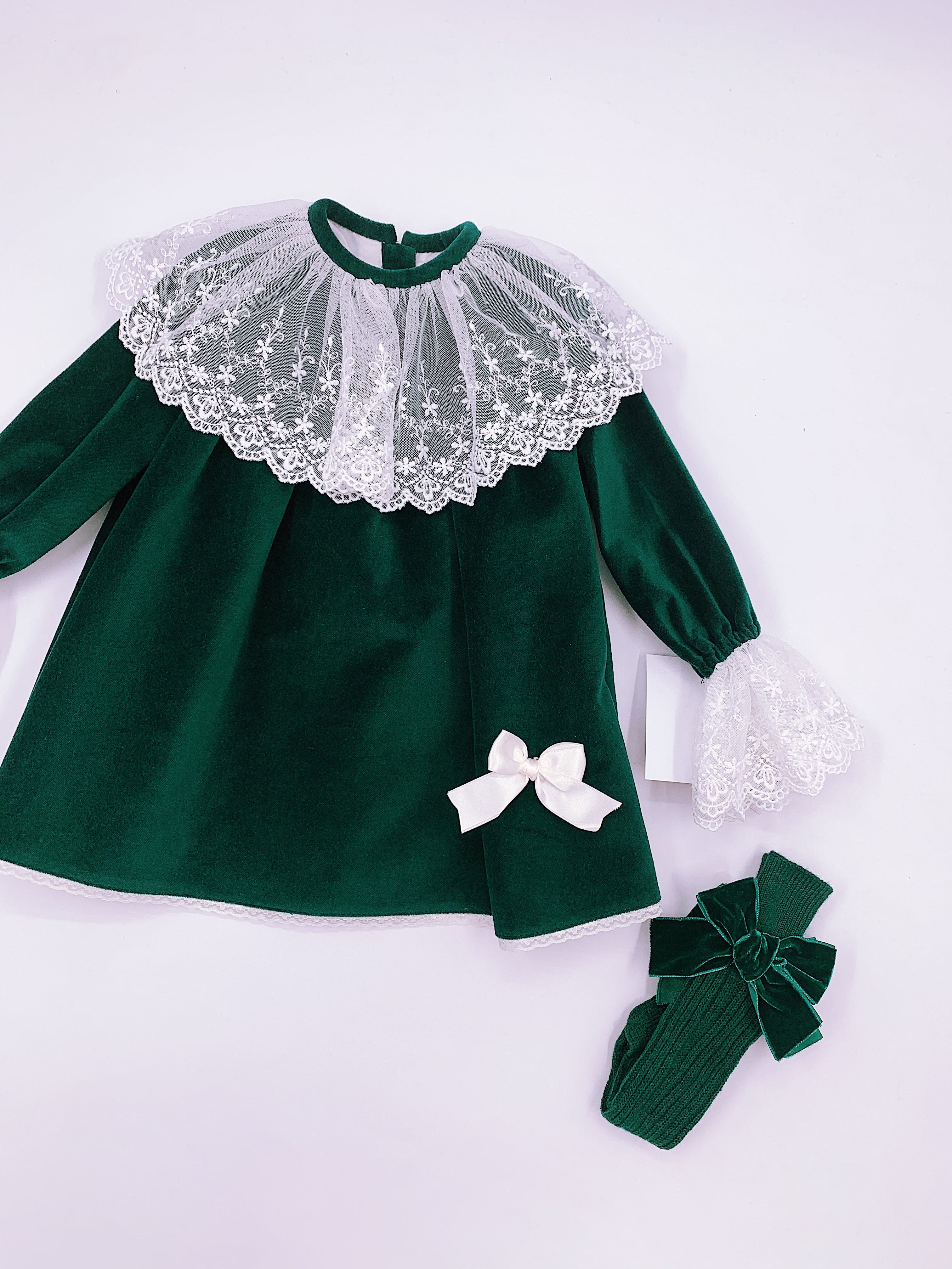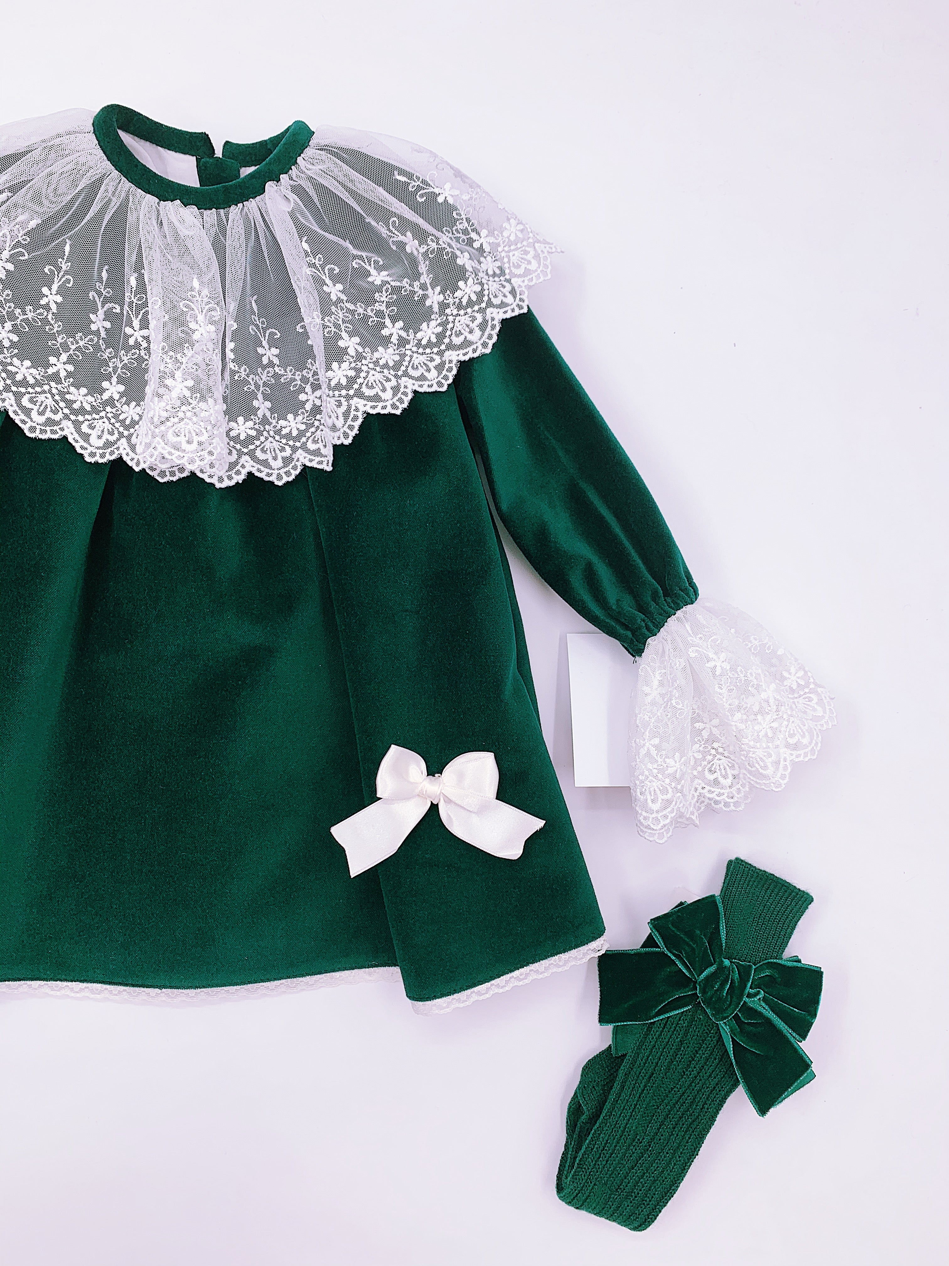 Beautiful Sonata deep green velvet dress with ivory Lace details