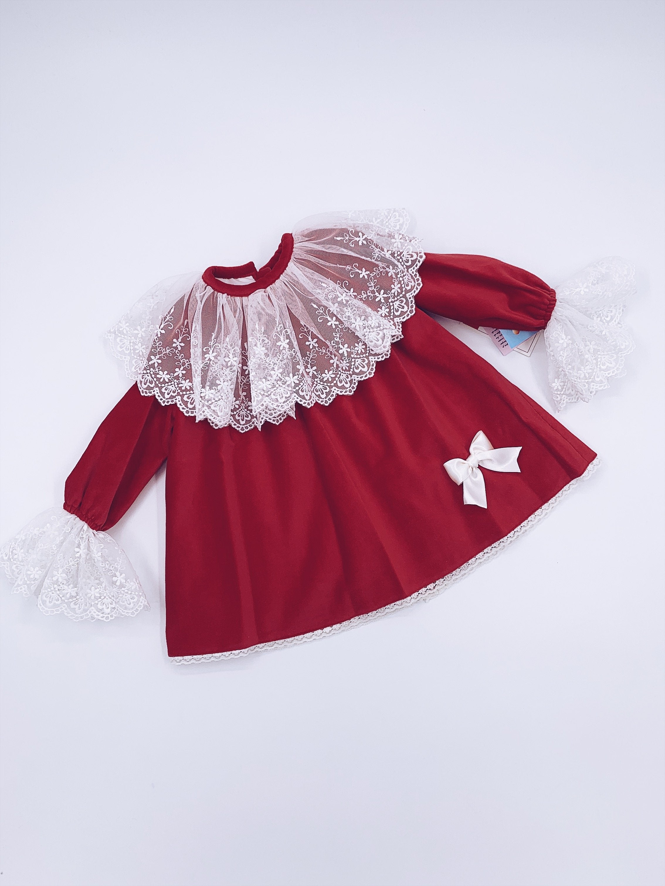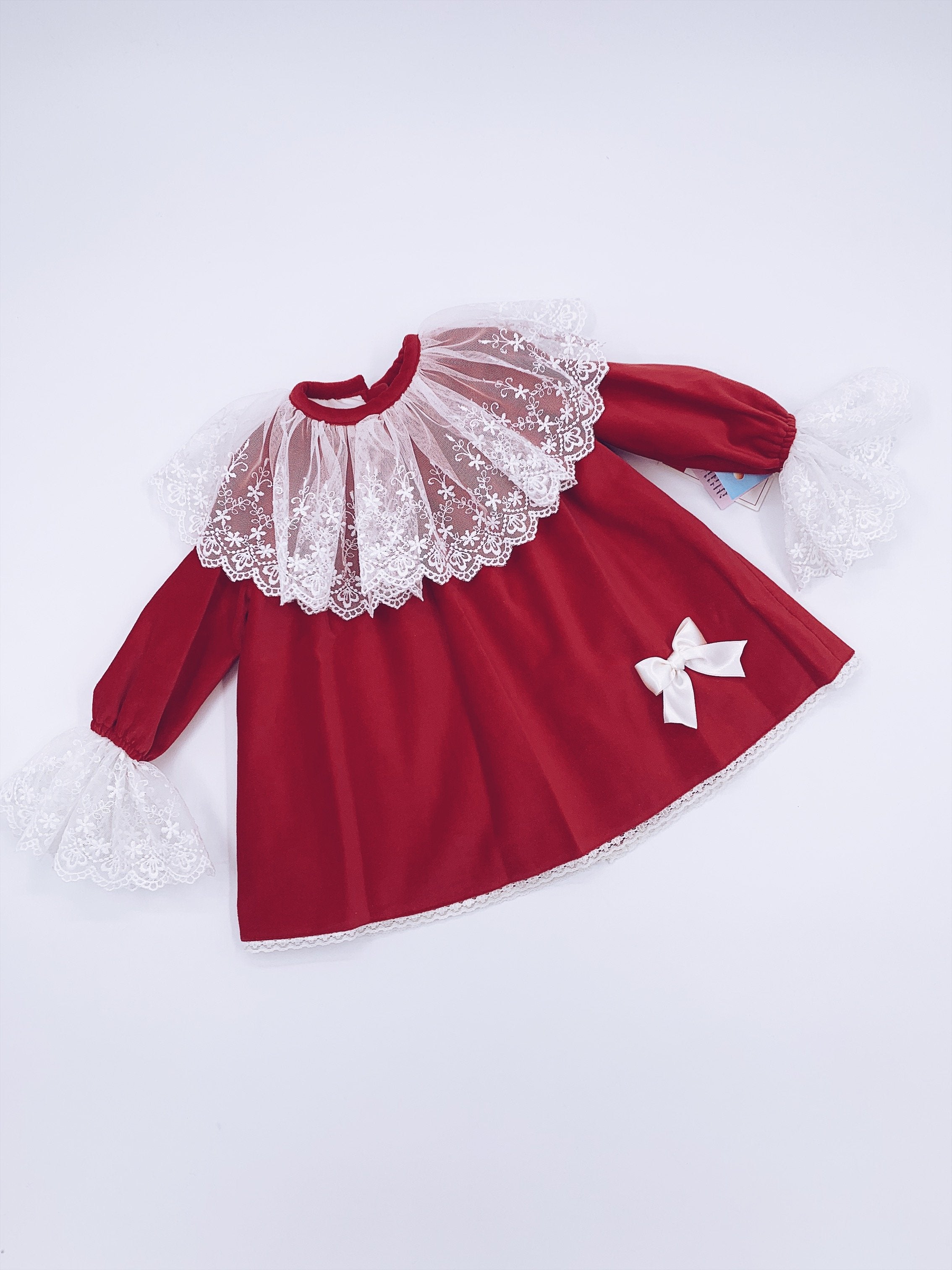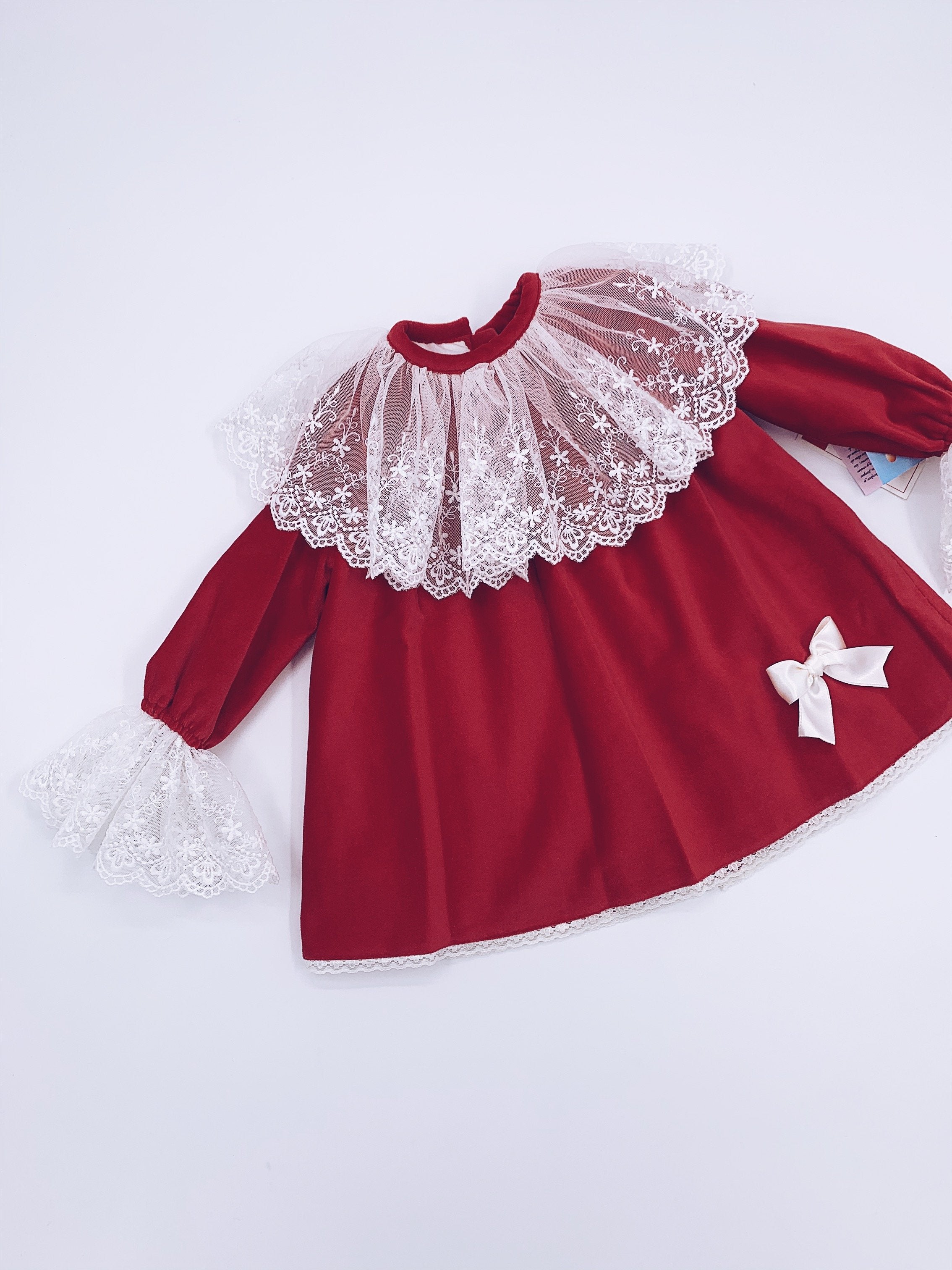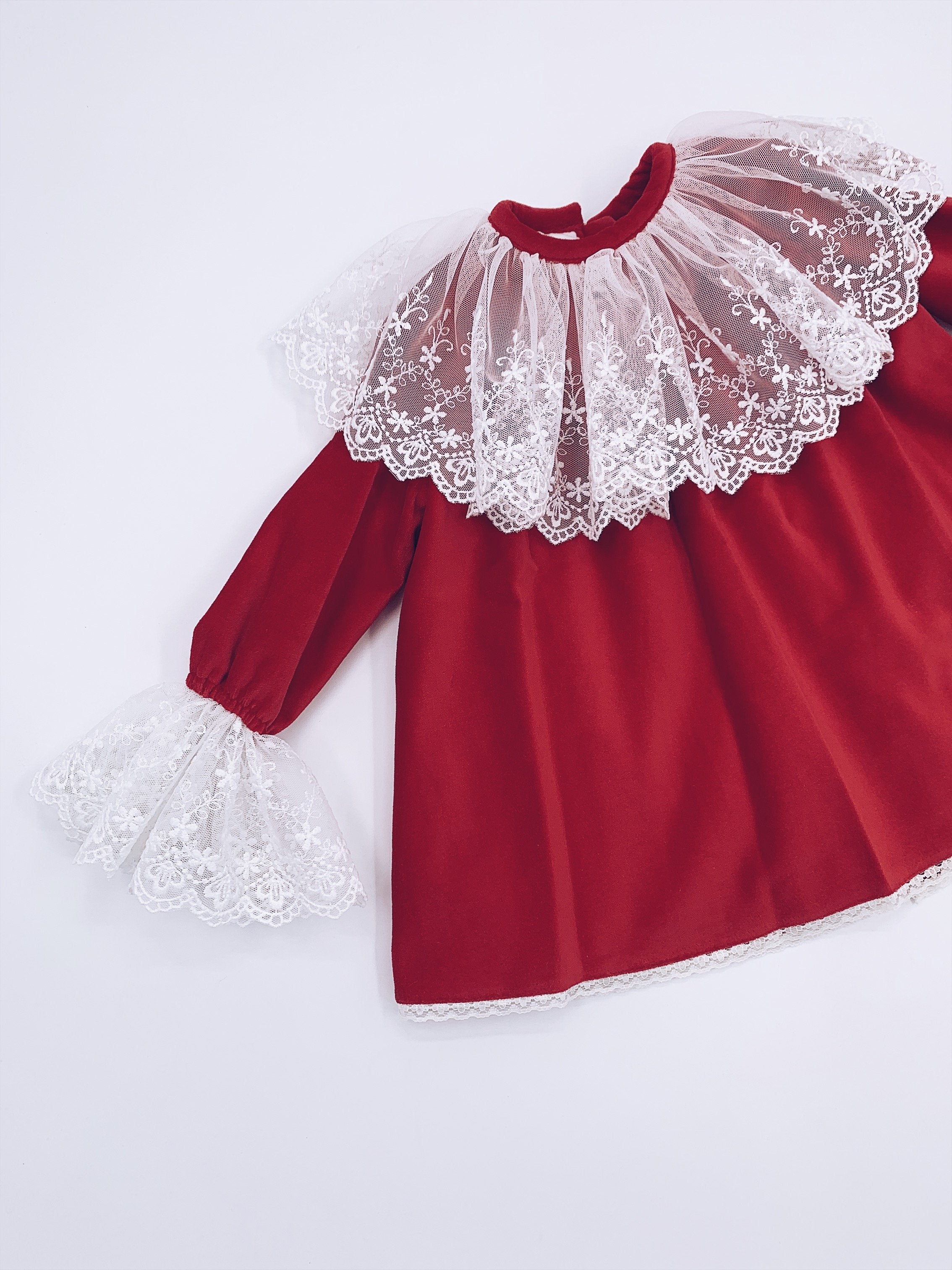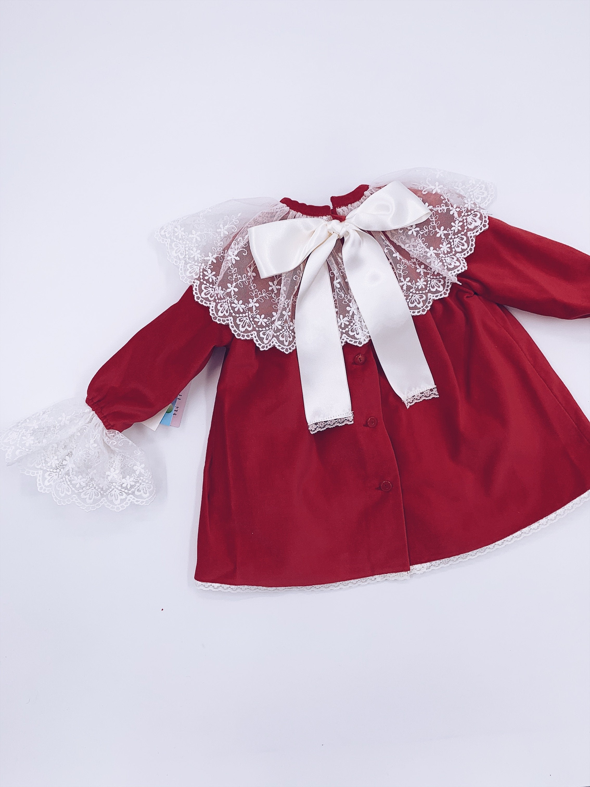 Beautiful Sonata Red velvet dress with Ivory lace details