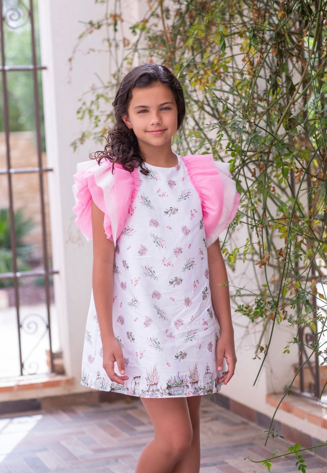 MI LOVES Beautiful neon Floral Print dress with pink frill details.