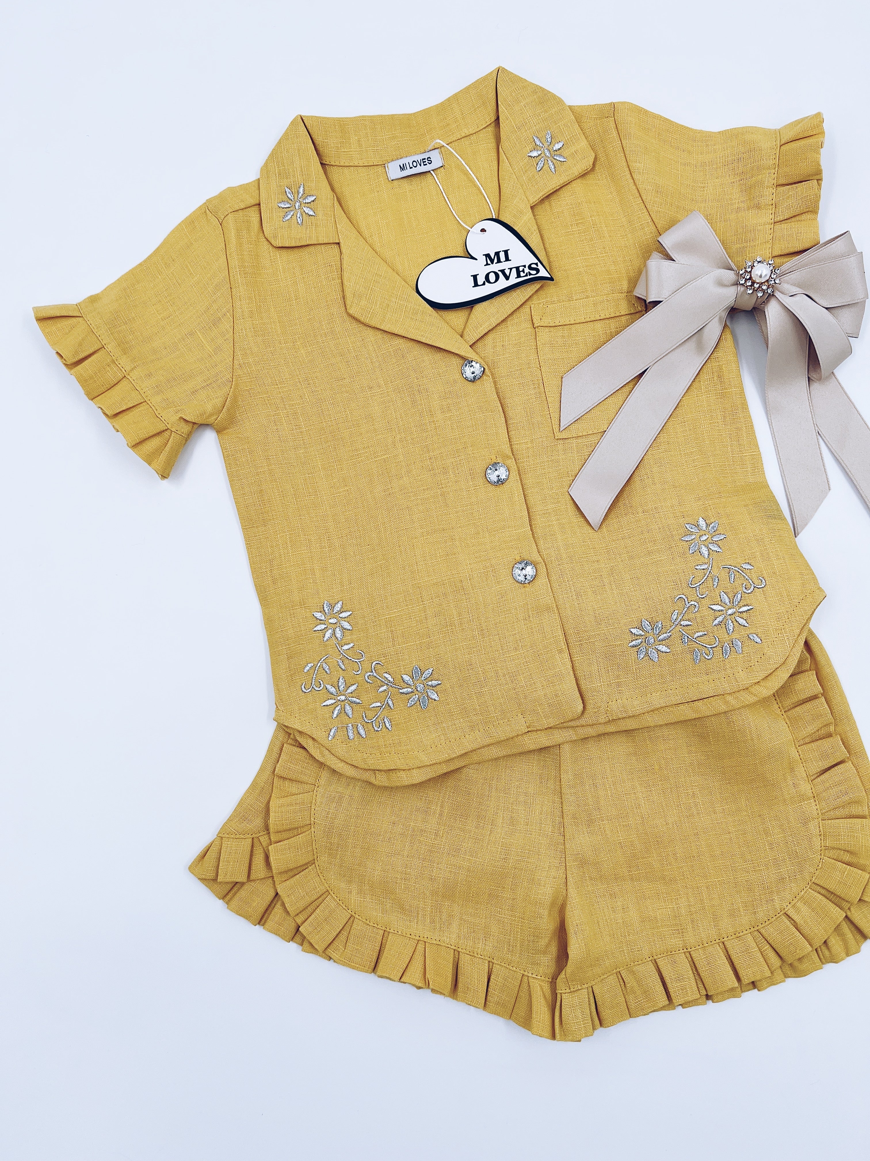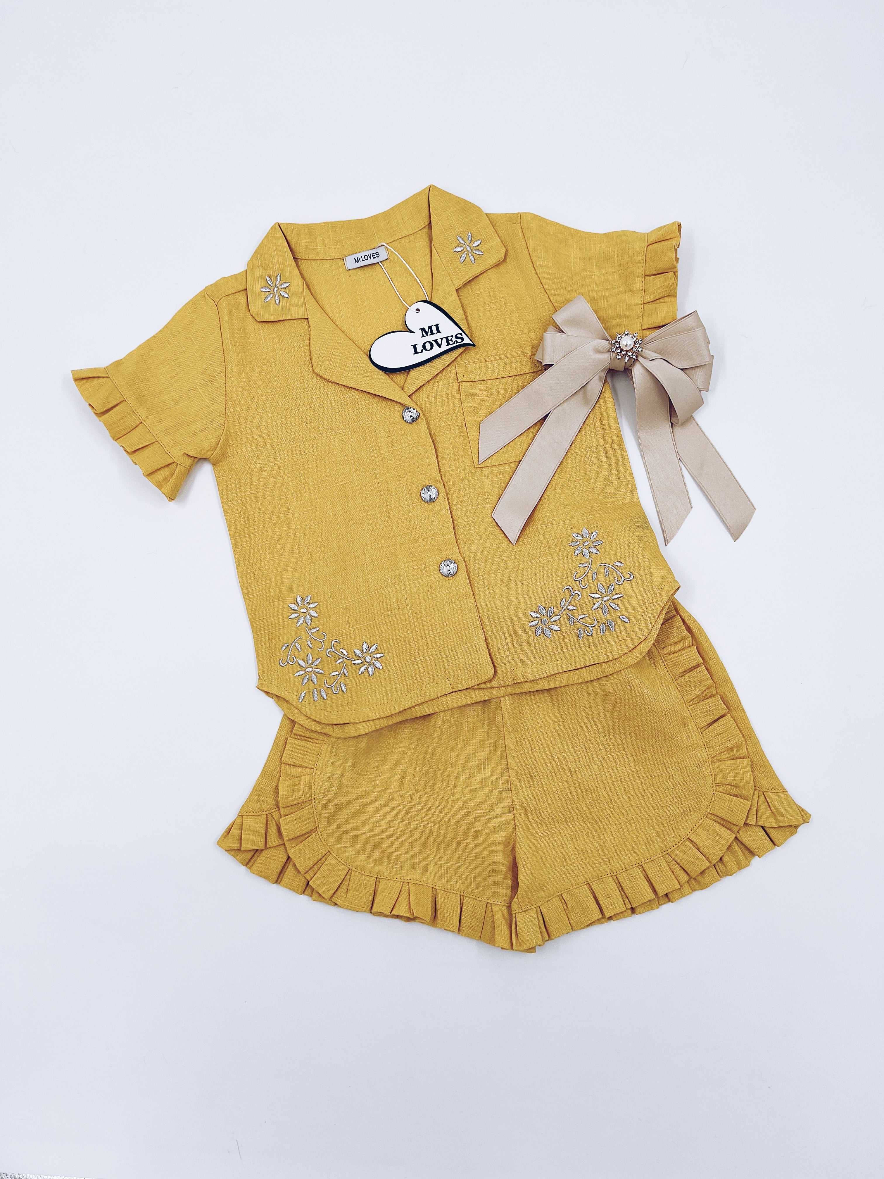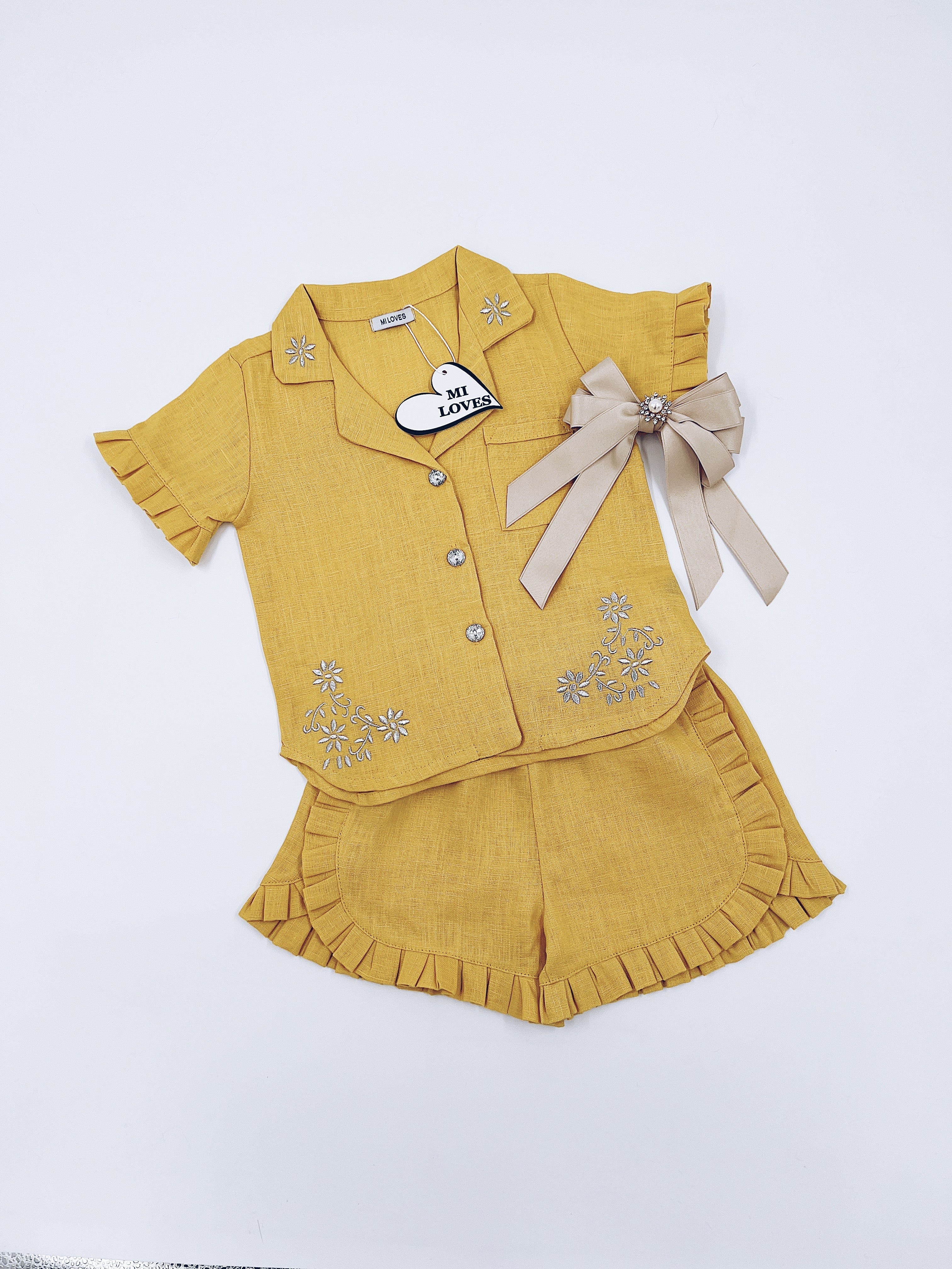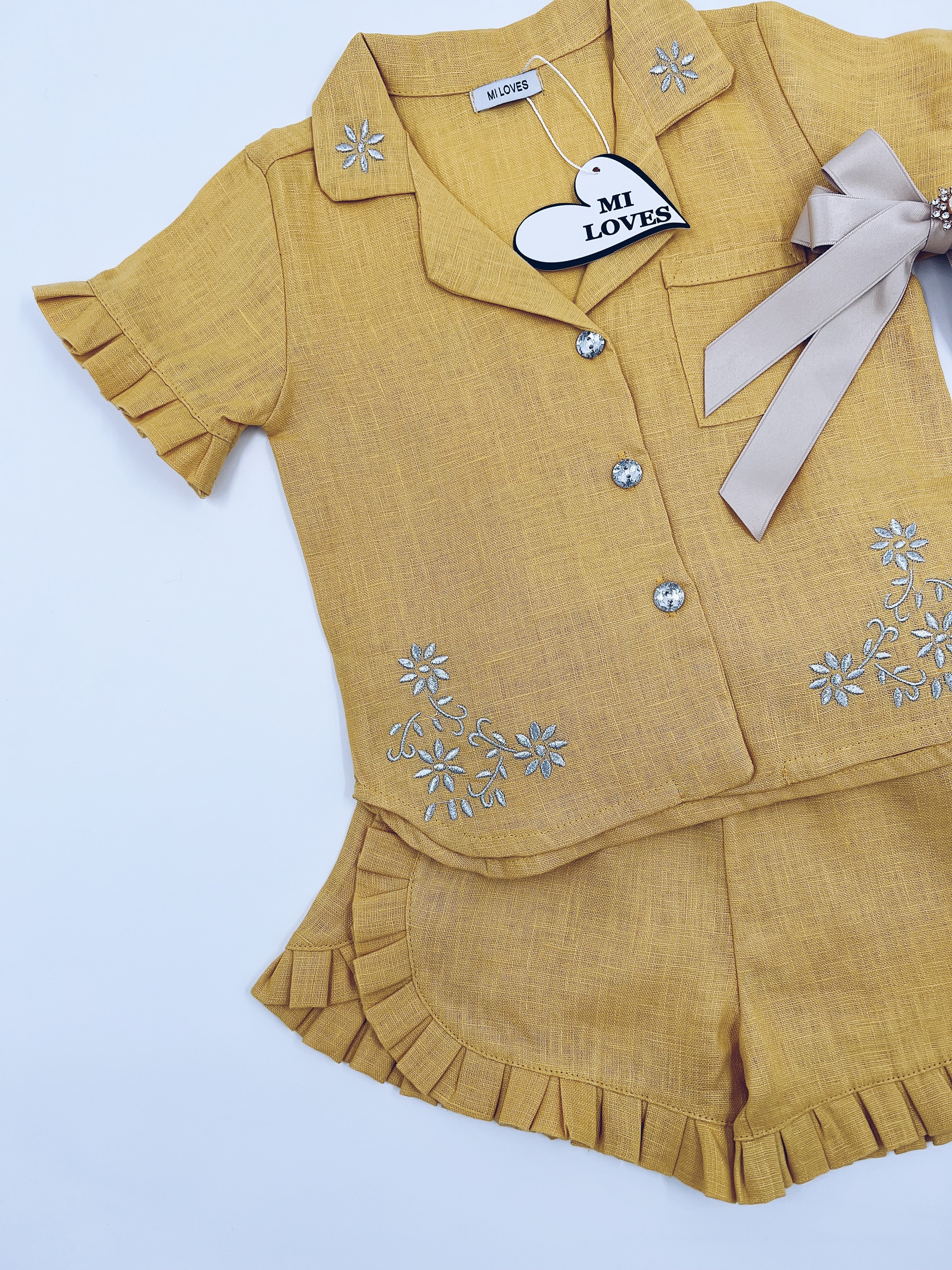 MI LOVES Deep yellow LInen summer kids Co-ord Short set.Essential summer set made from 100% linen with Beautiful embroidery and frill details.perfect for hot summer days.