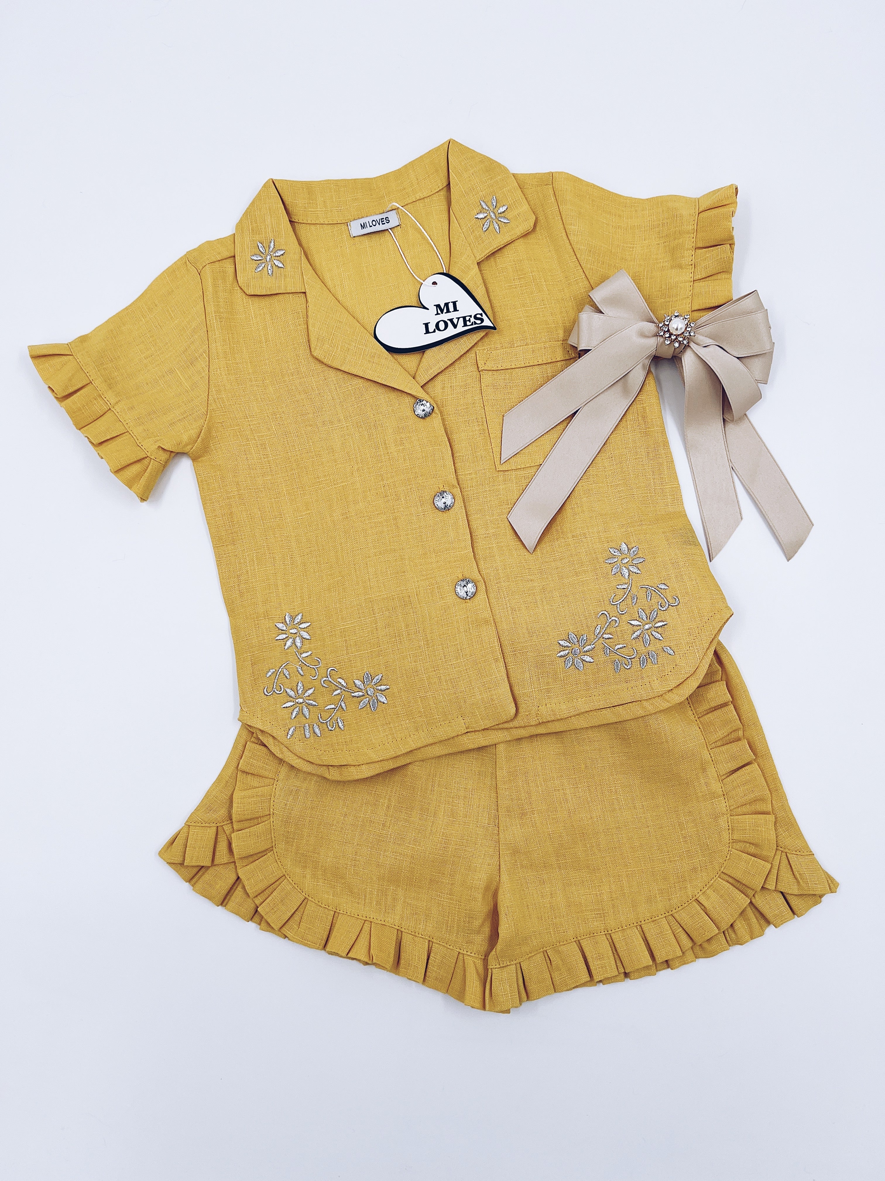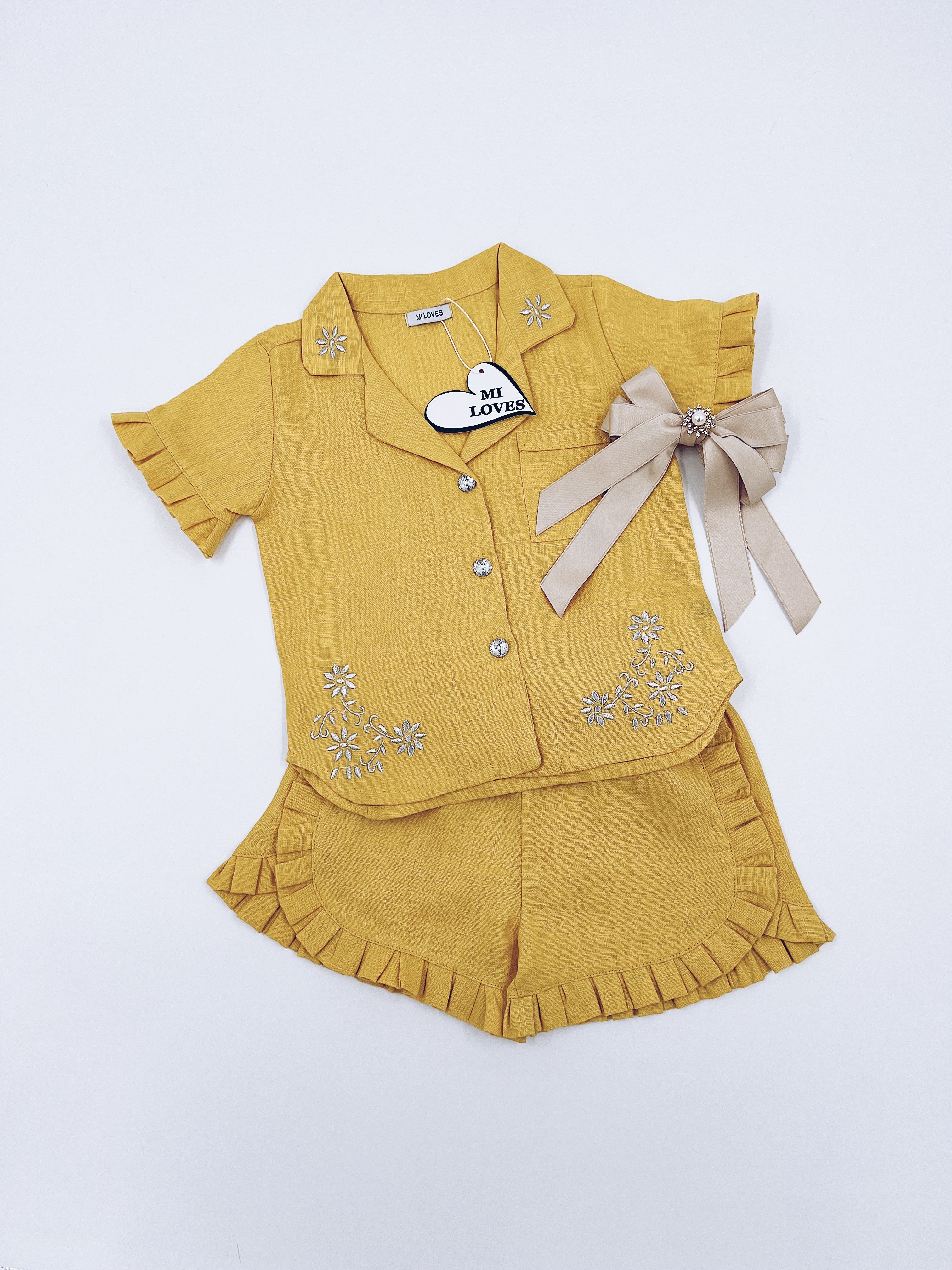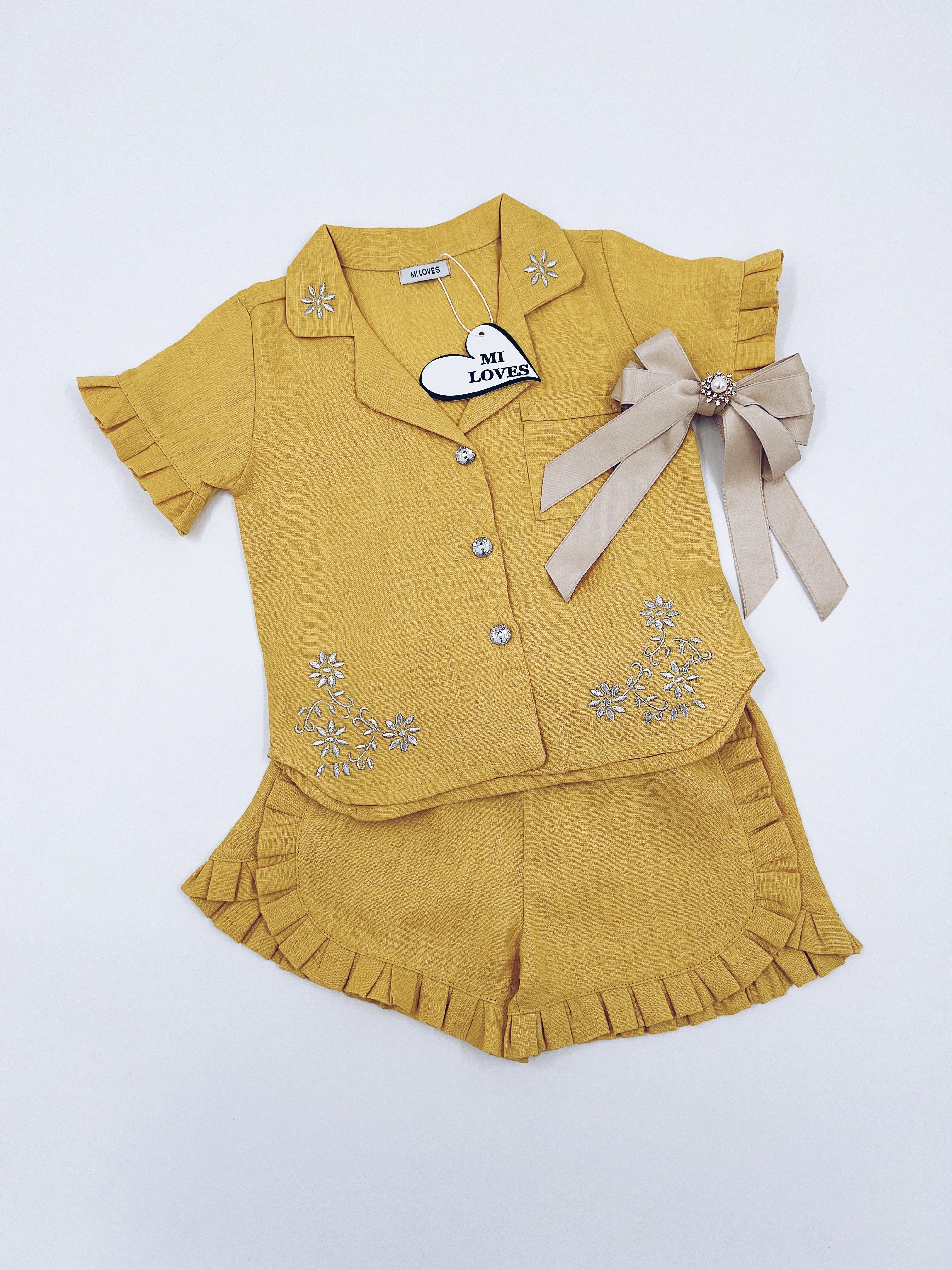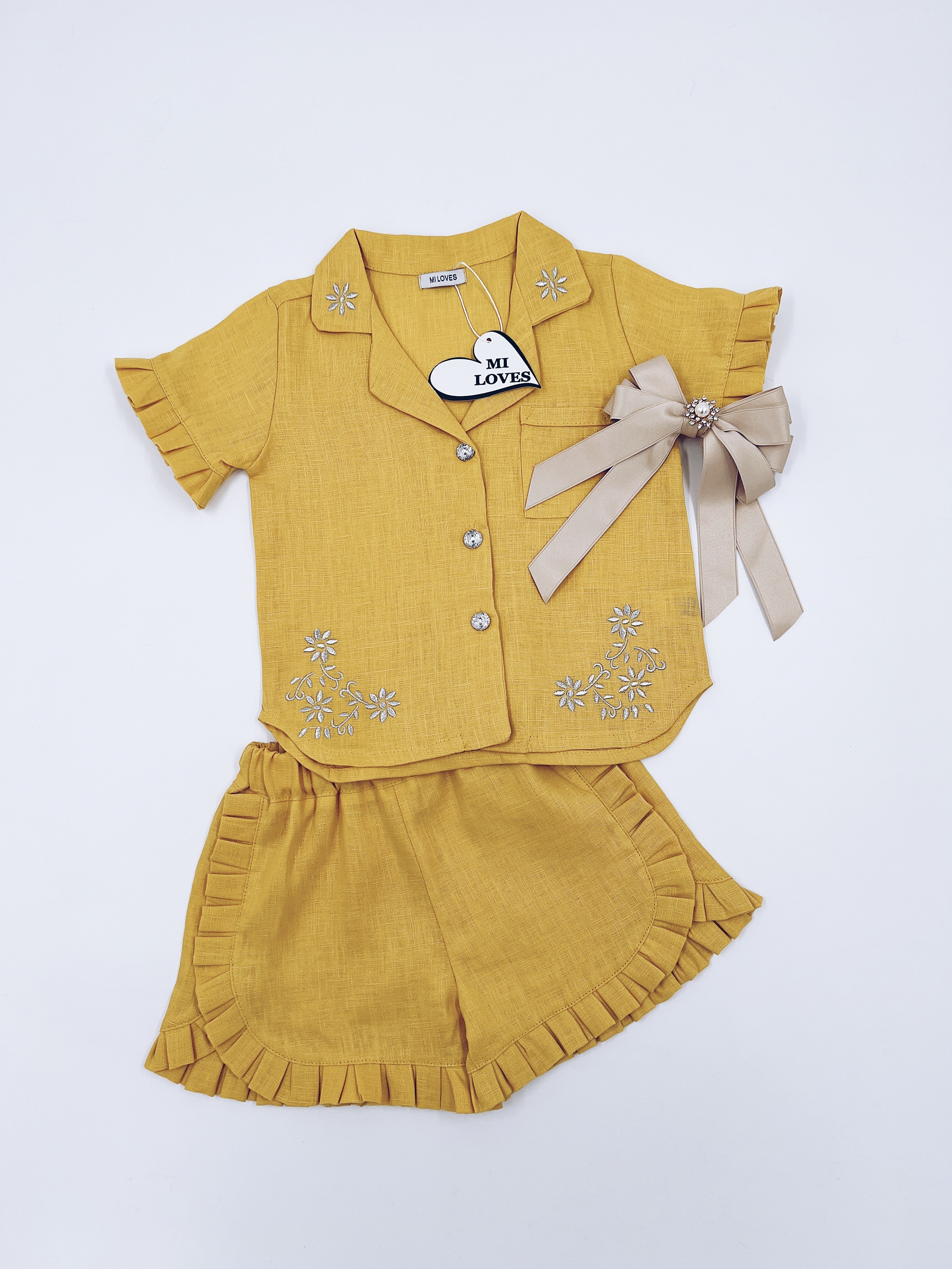 MI LOVES Deep yellow LInen summer kids Co-ord Short set.Essential summer set made from 100% linen with Beautiful embroidery and frill details.perfect for hot summer days.