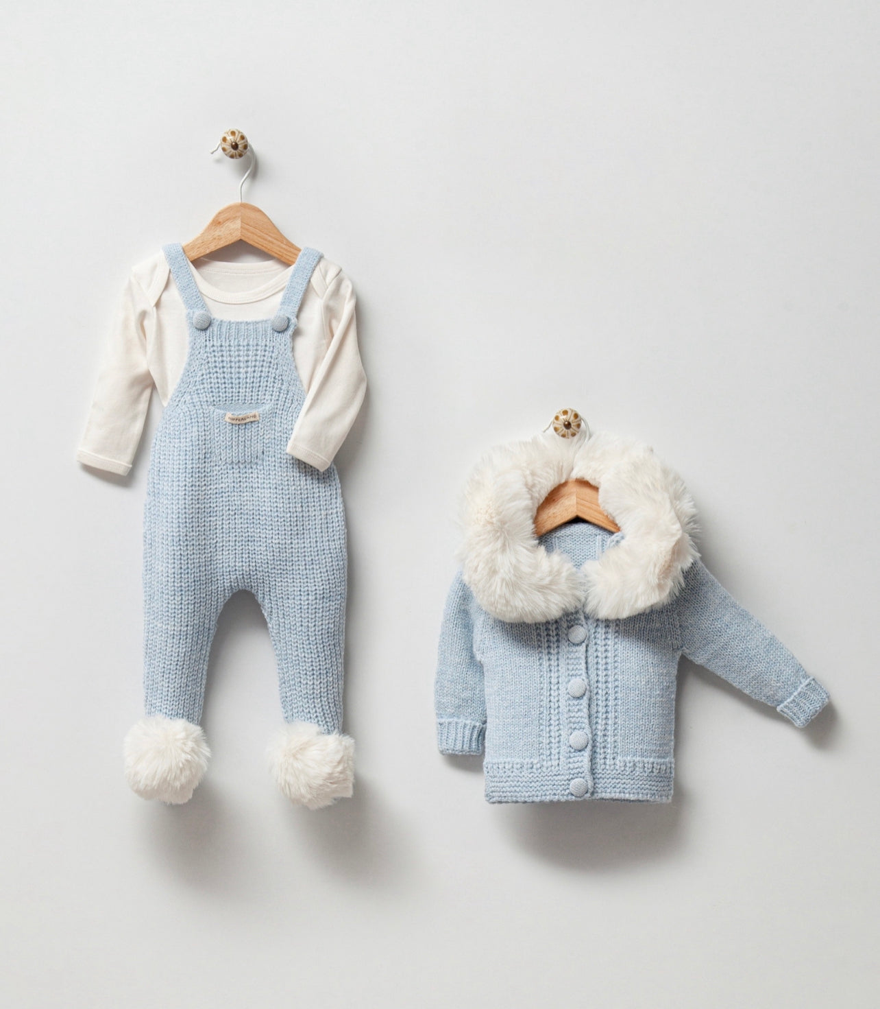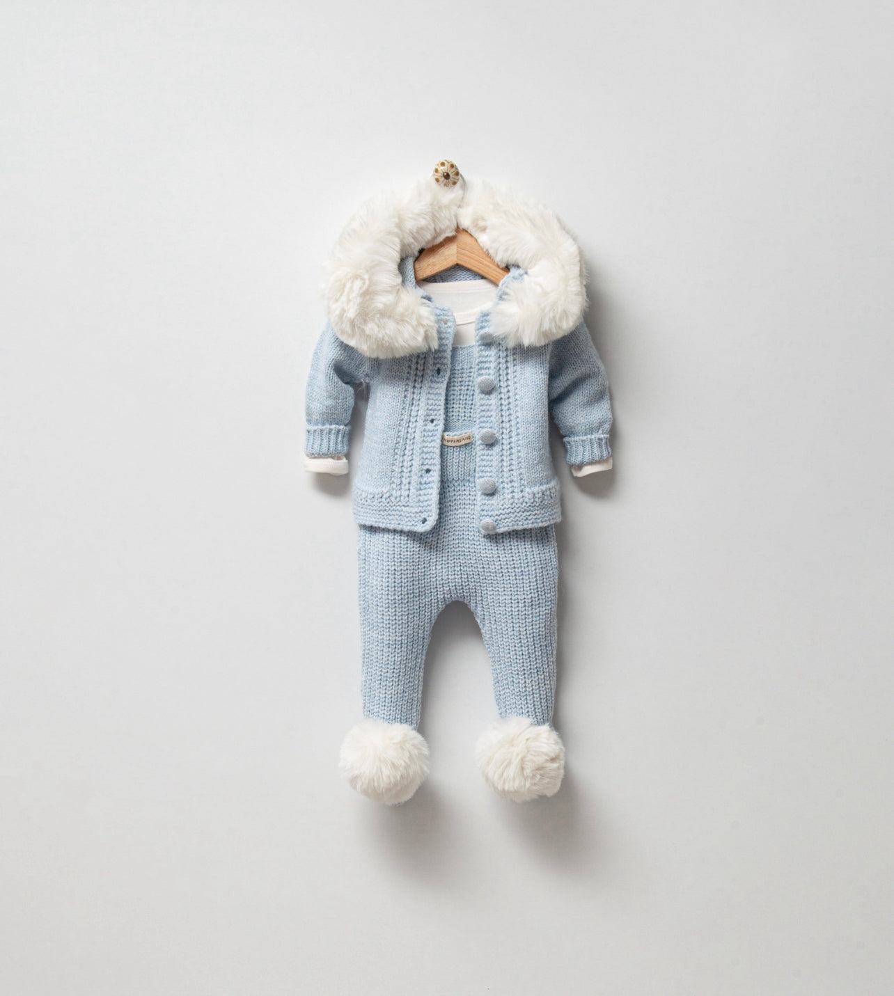 Beautiful Blue Knitted Cardigan/POMPOM Dungarees/Bodysuit 3 piece set with white Synthetic fur trim/Pompoms.