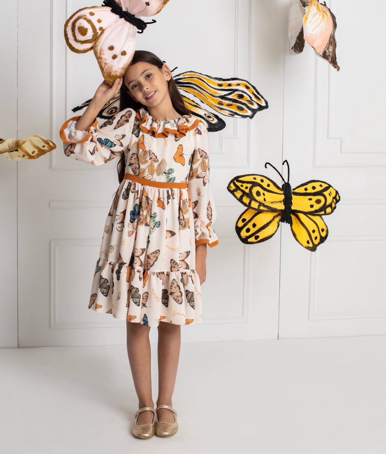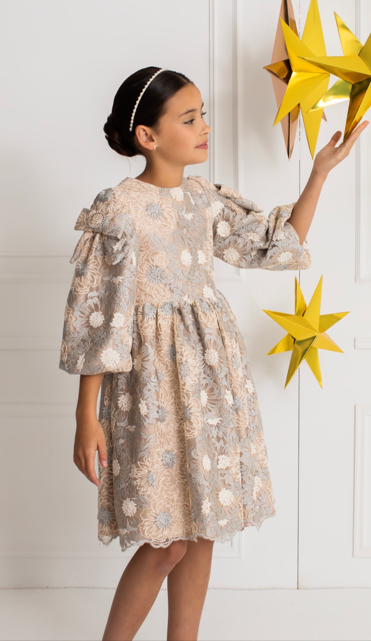 Beautiful Gold polkadot dress with ruffle and shoulder Bow details.