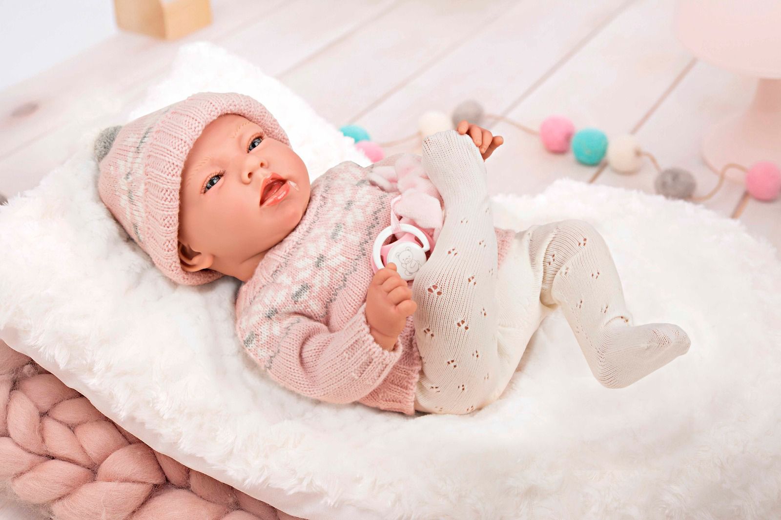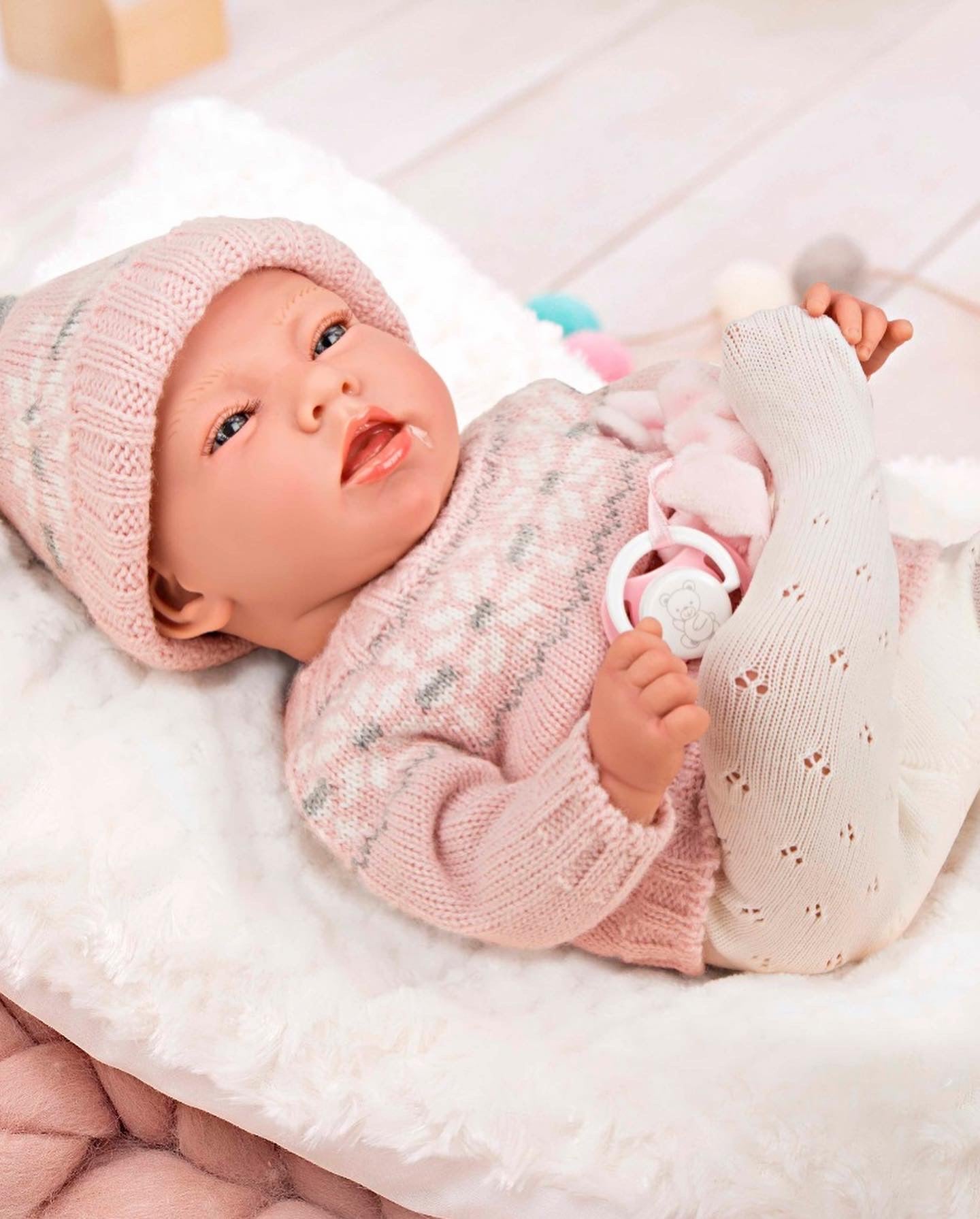 Arias Dolls - gorgeous life like Reborn baby doll - dressed in long sleeve knitted sweater with pom pom, matching hat and tight presented with soft knitted wrap and packaged in a collectors box. 40cm long.
