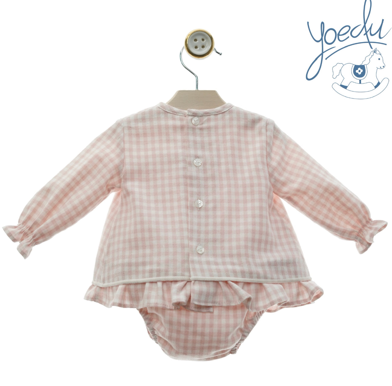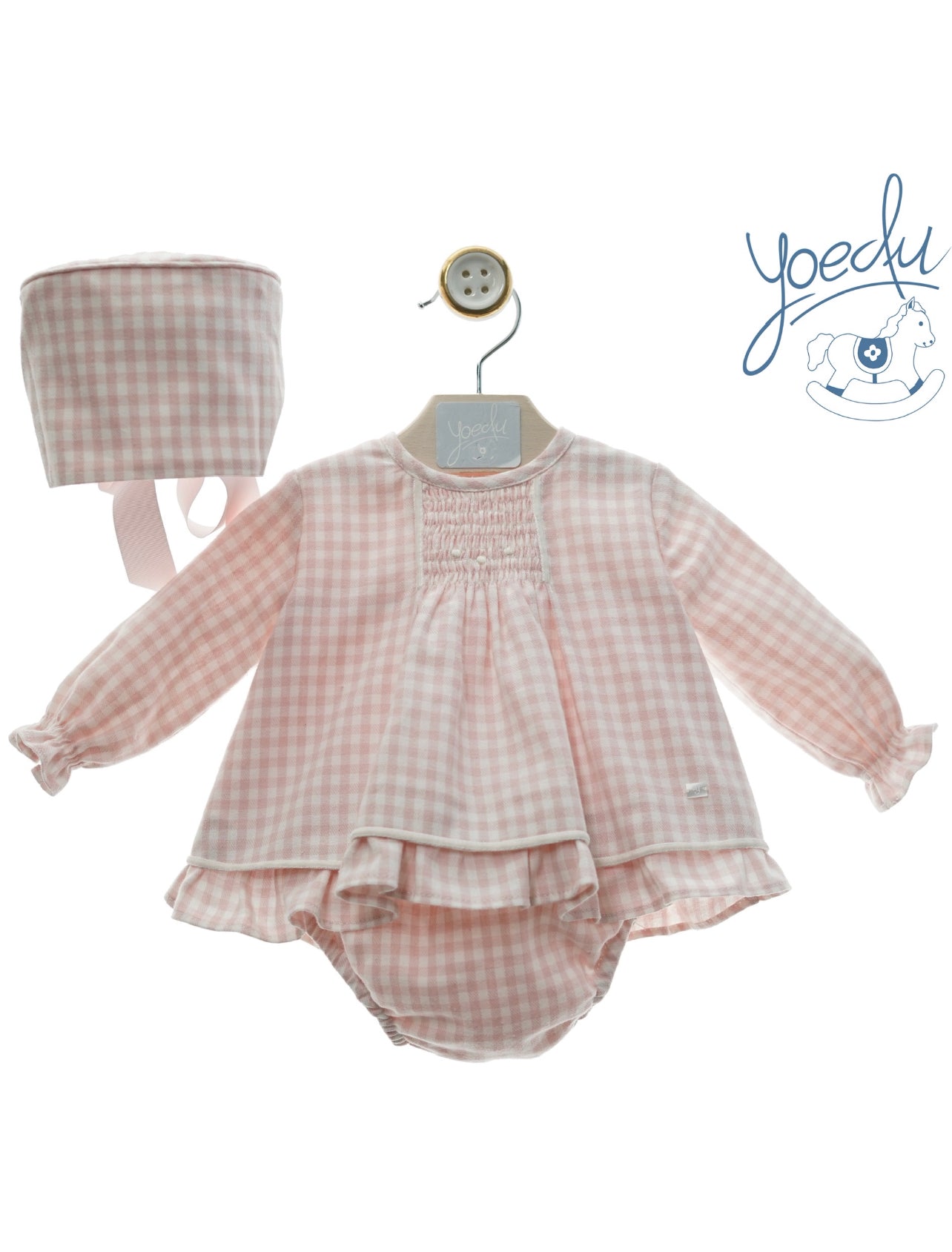 Beautiful Baby pink Dress/Bonnet/Bloomers set with frill and smoke details.