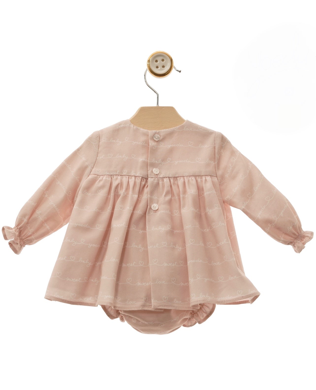 Beautiful Dusty pink Dress/Bonnet/Bloomers set with pompom details.