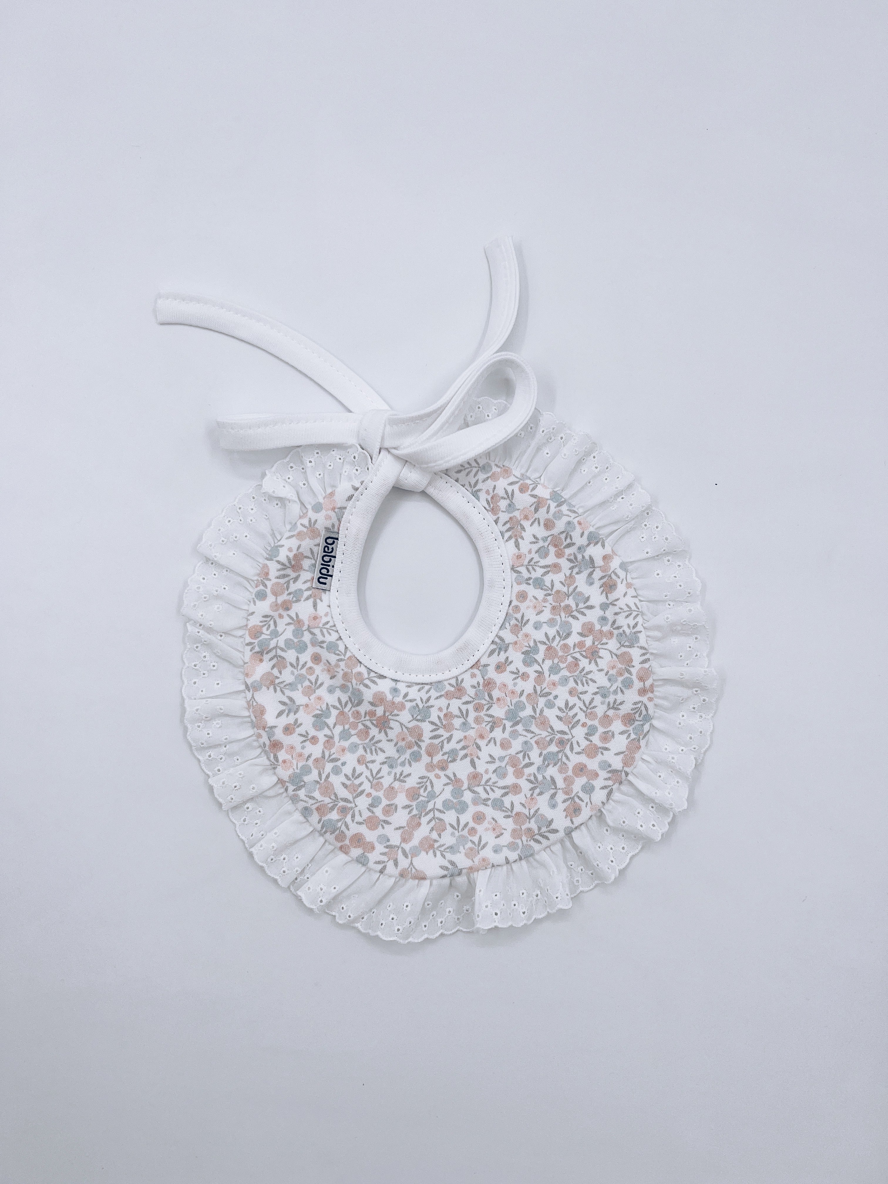 Babidu cotton bib with floral print and frill details.