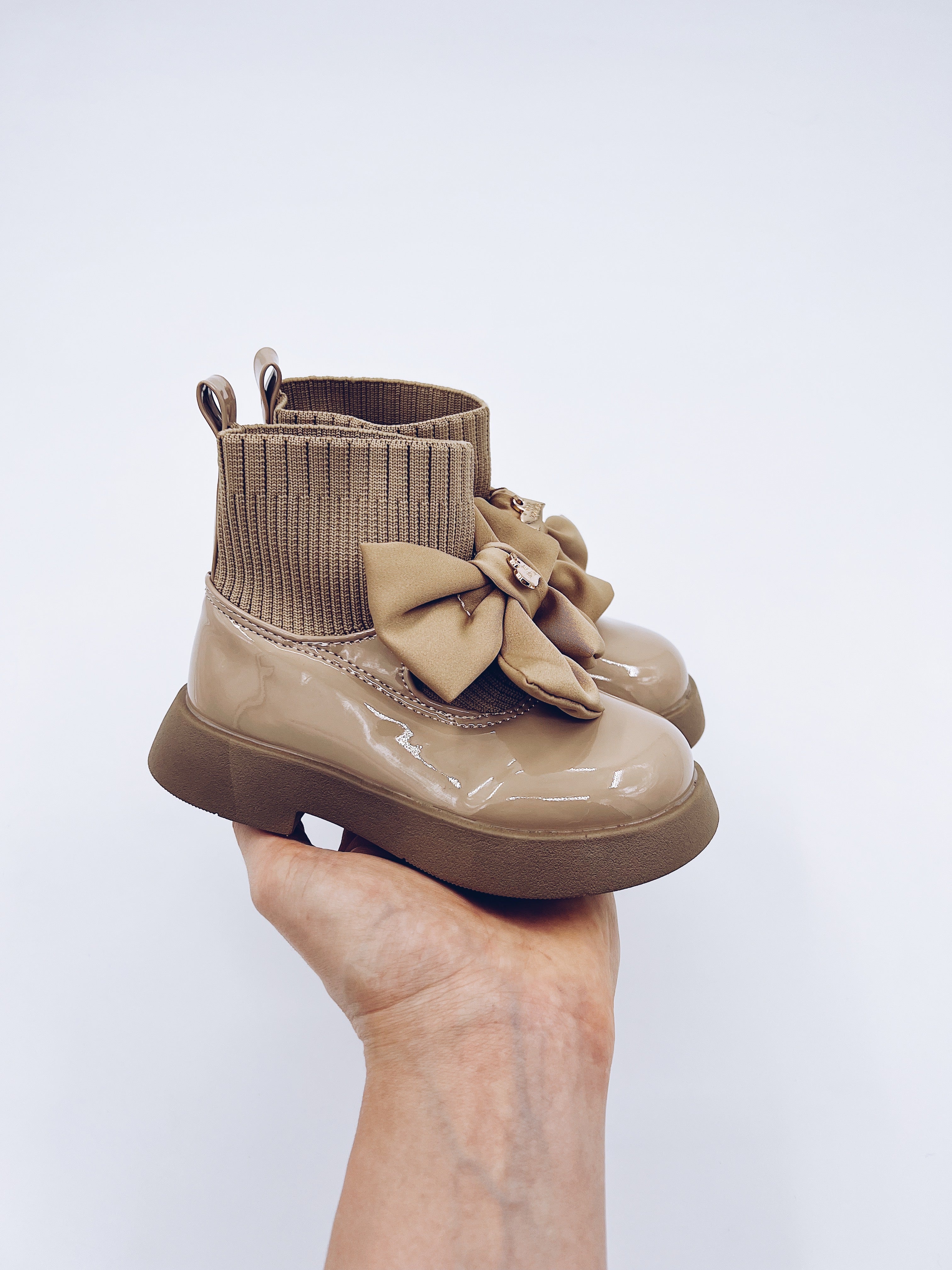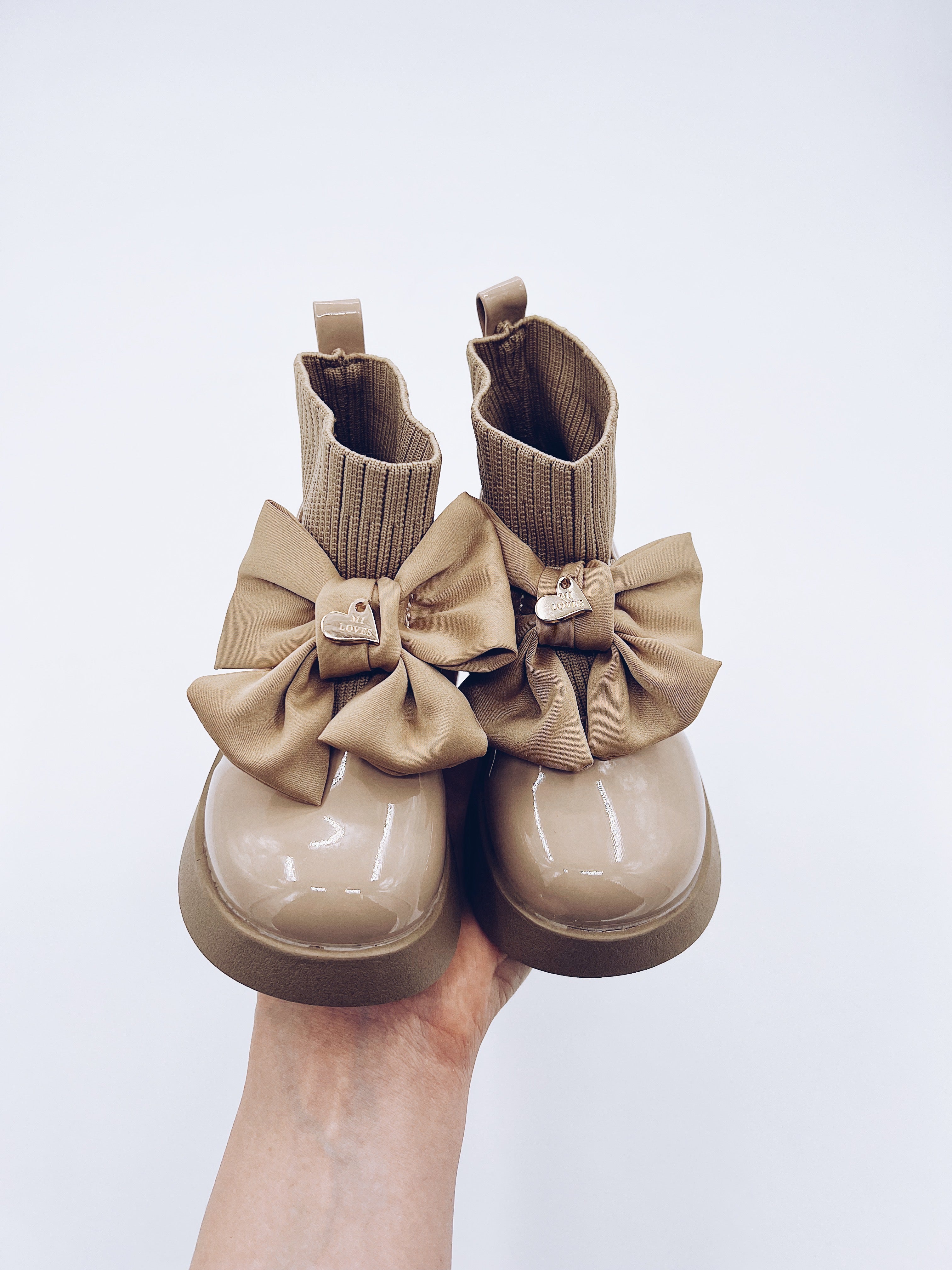 Beautiful Cream Sock-Boots made in shiny patent faux leather. Big Satin Bow details on the front of the boots.