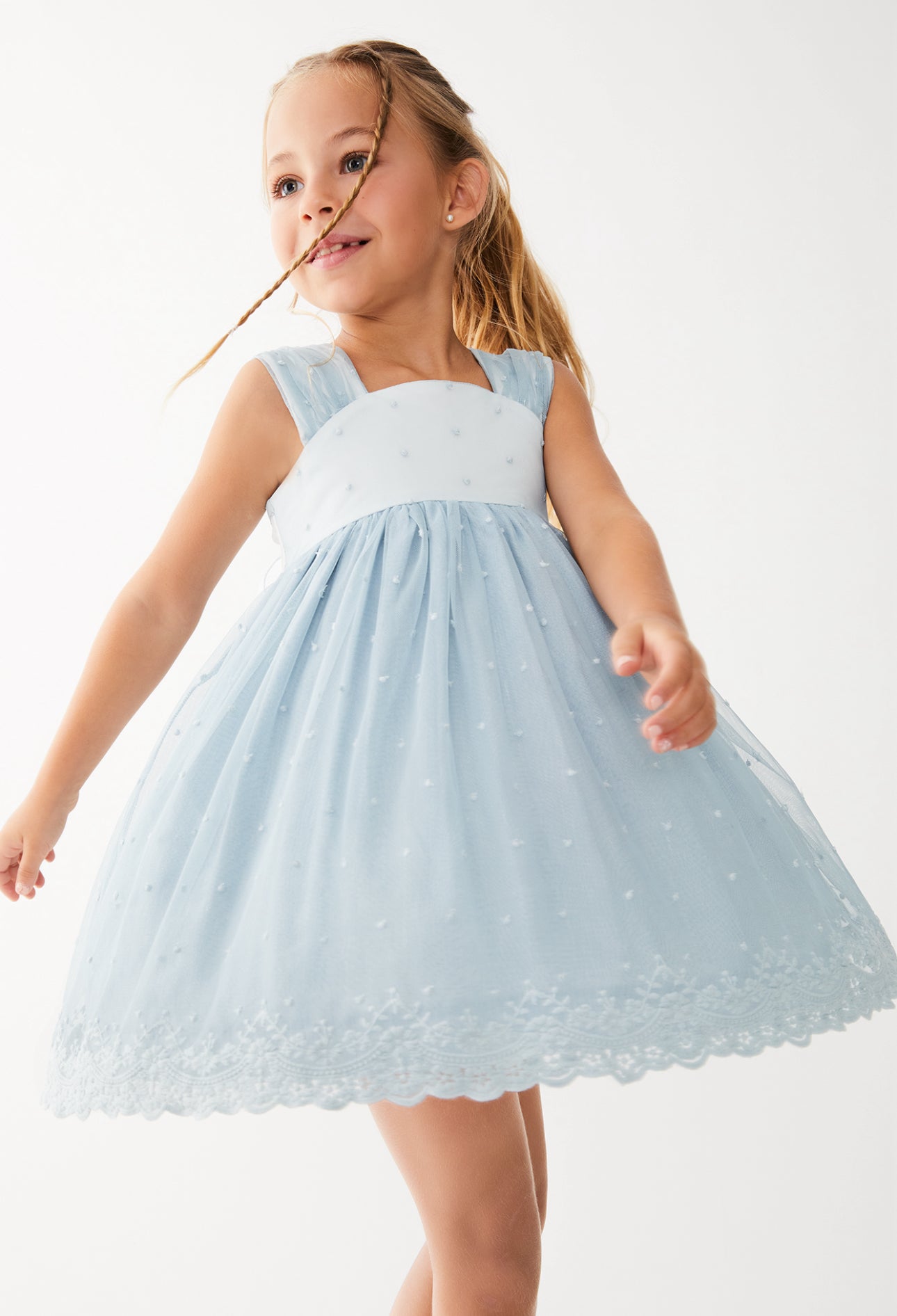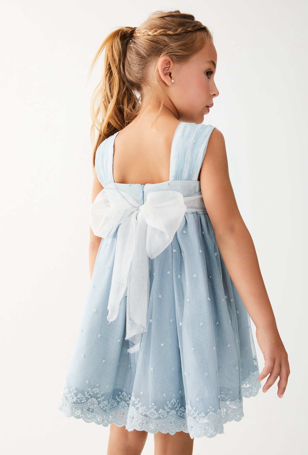 Beautiful Dusty Blue dress with Bow and Lace details.