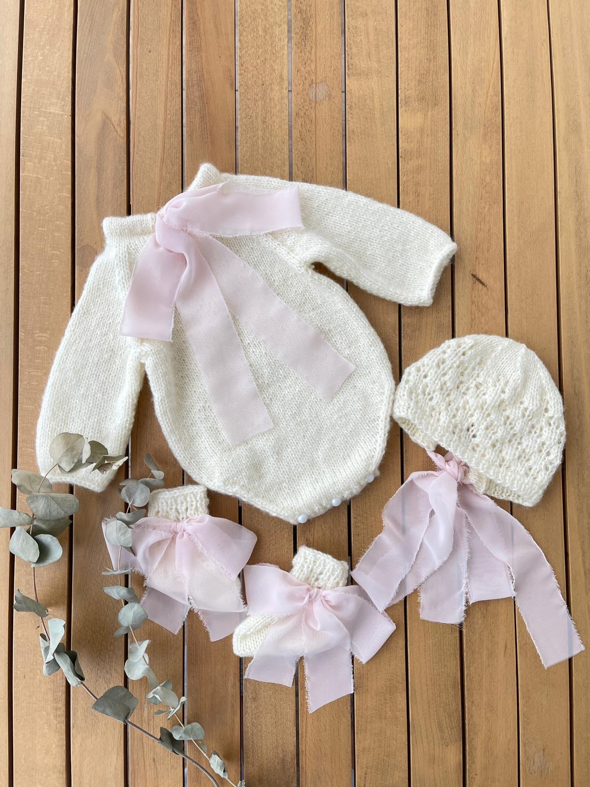Beautiful Hand Knitted 3 piece set with bow details.Set Include Romper,Baby Booties and baby Bonnet.