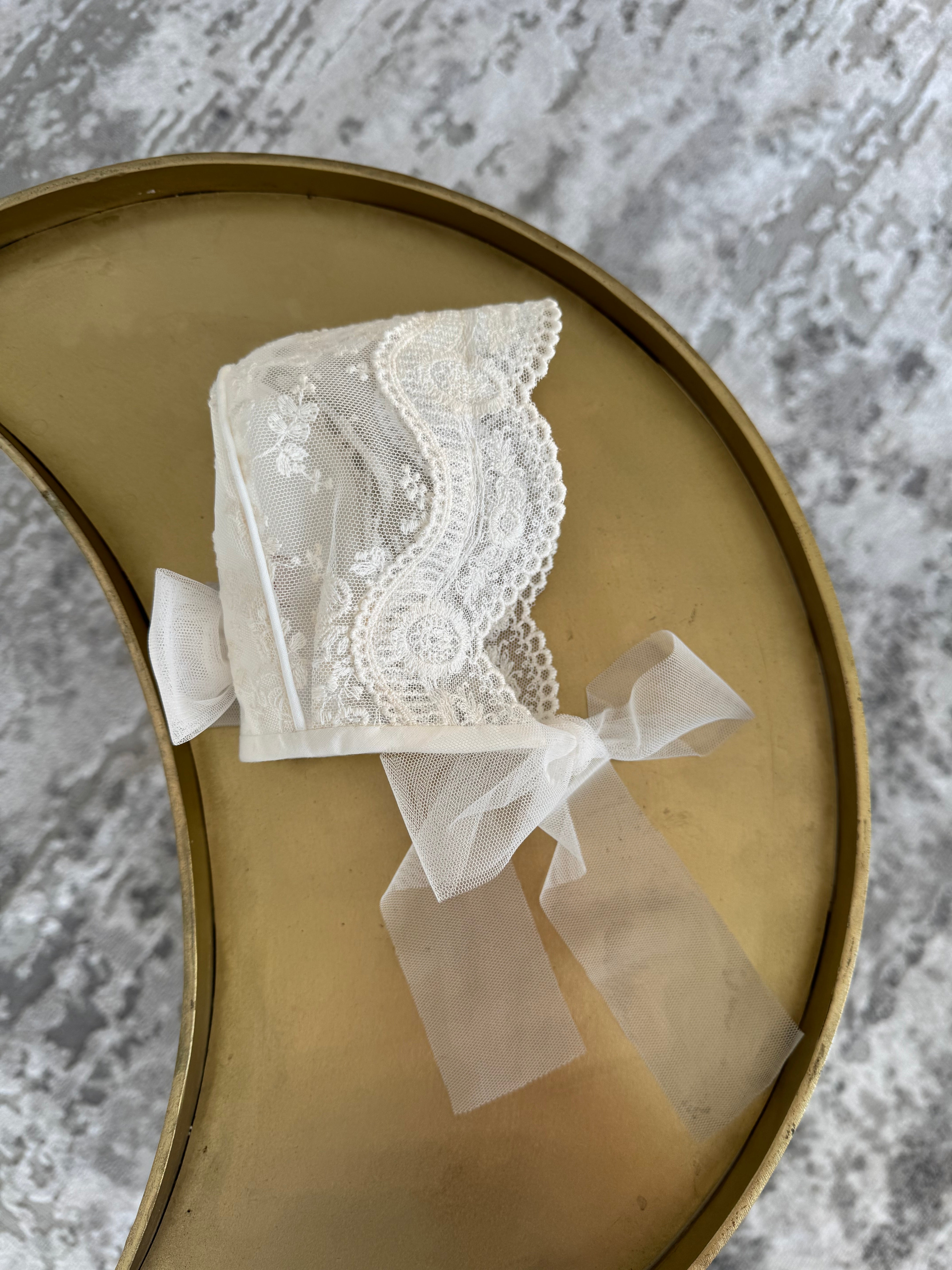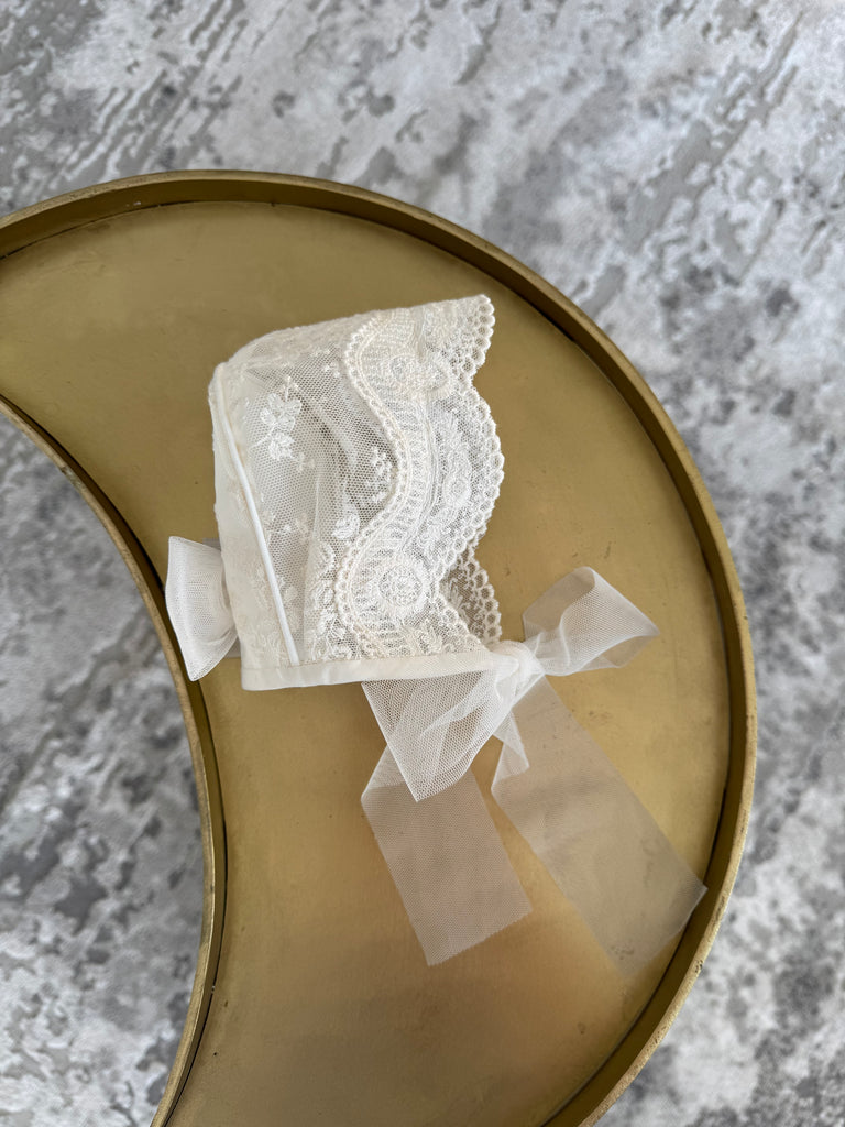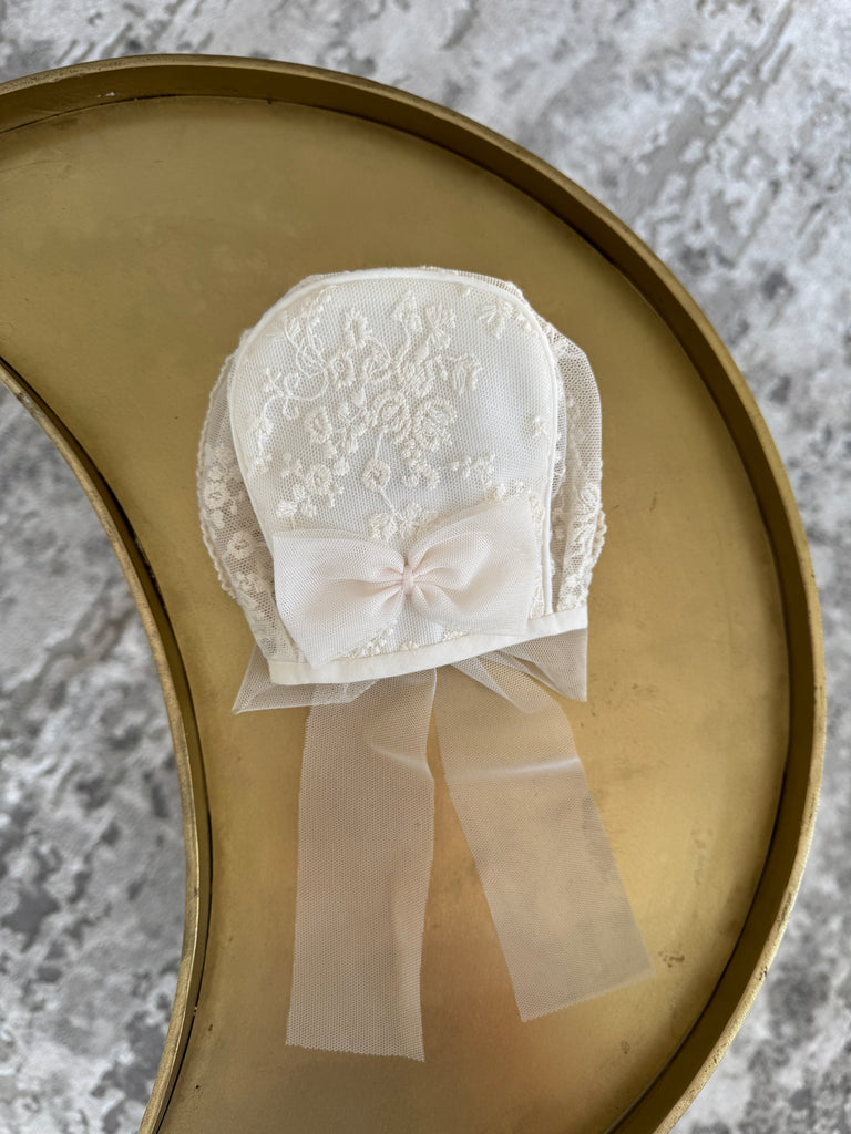 Beautiful Ivory Baby bonnet with lace and bow details.