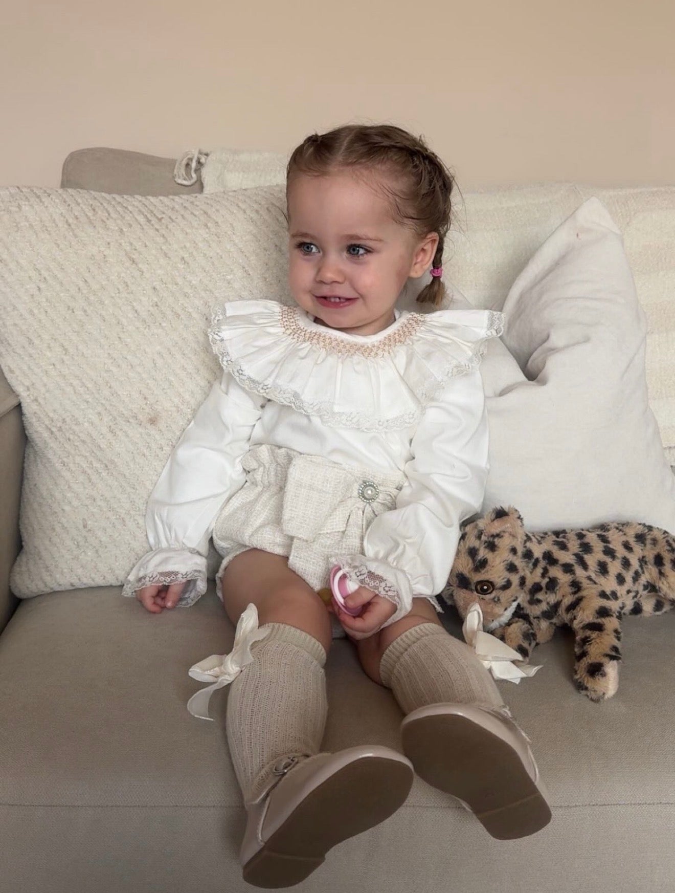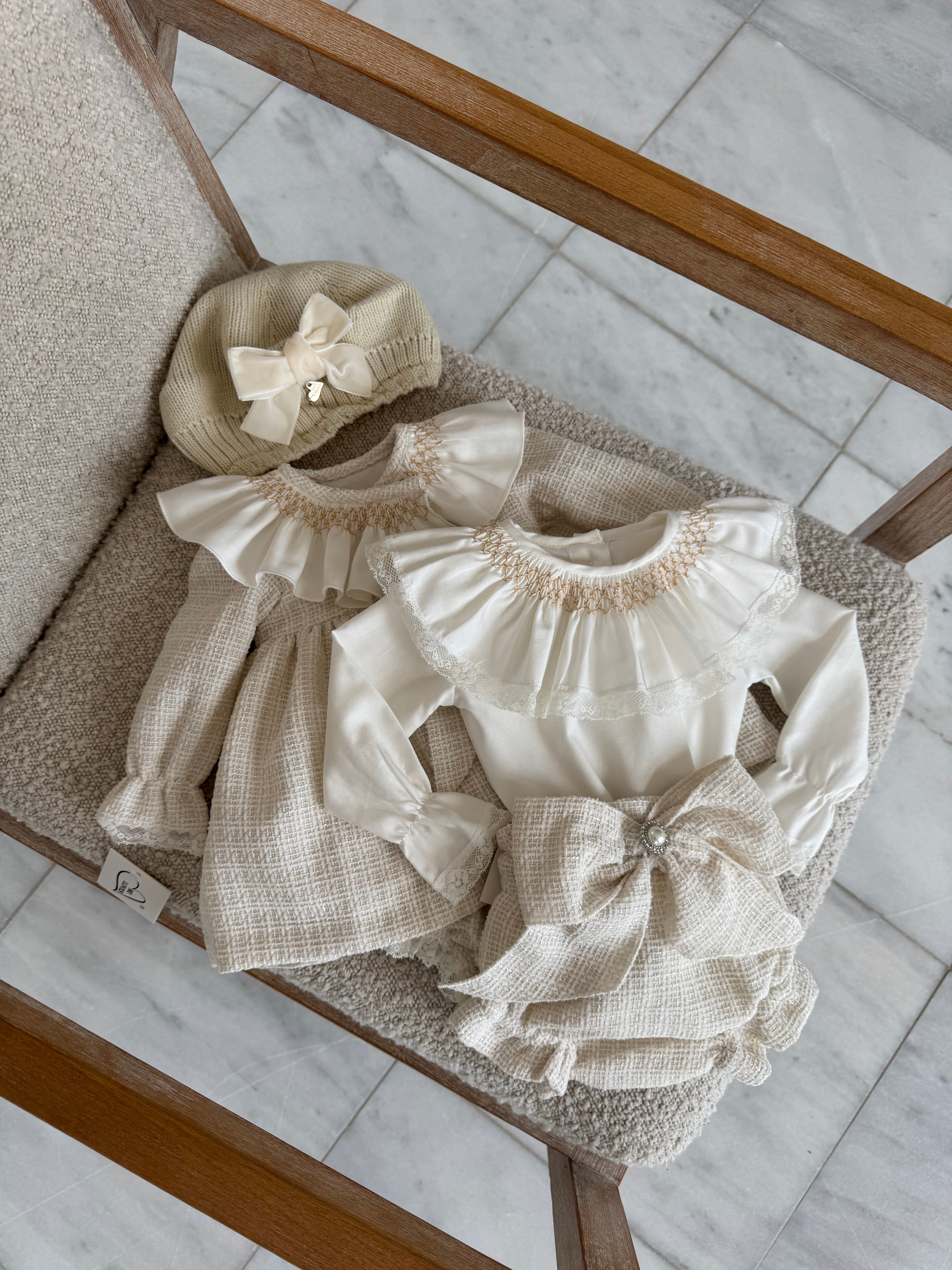 Beautiful Ivory/Cream Tweed Bloomers and Hand Smoked Shirt 2 piece set.
