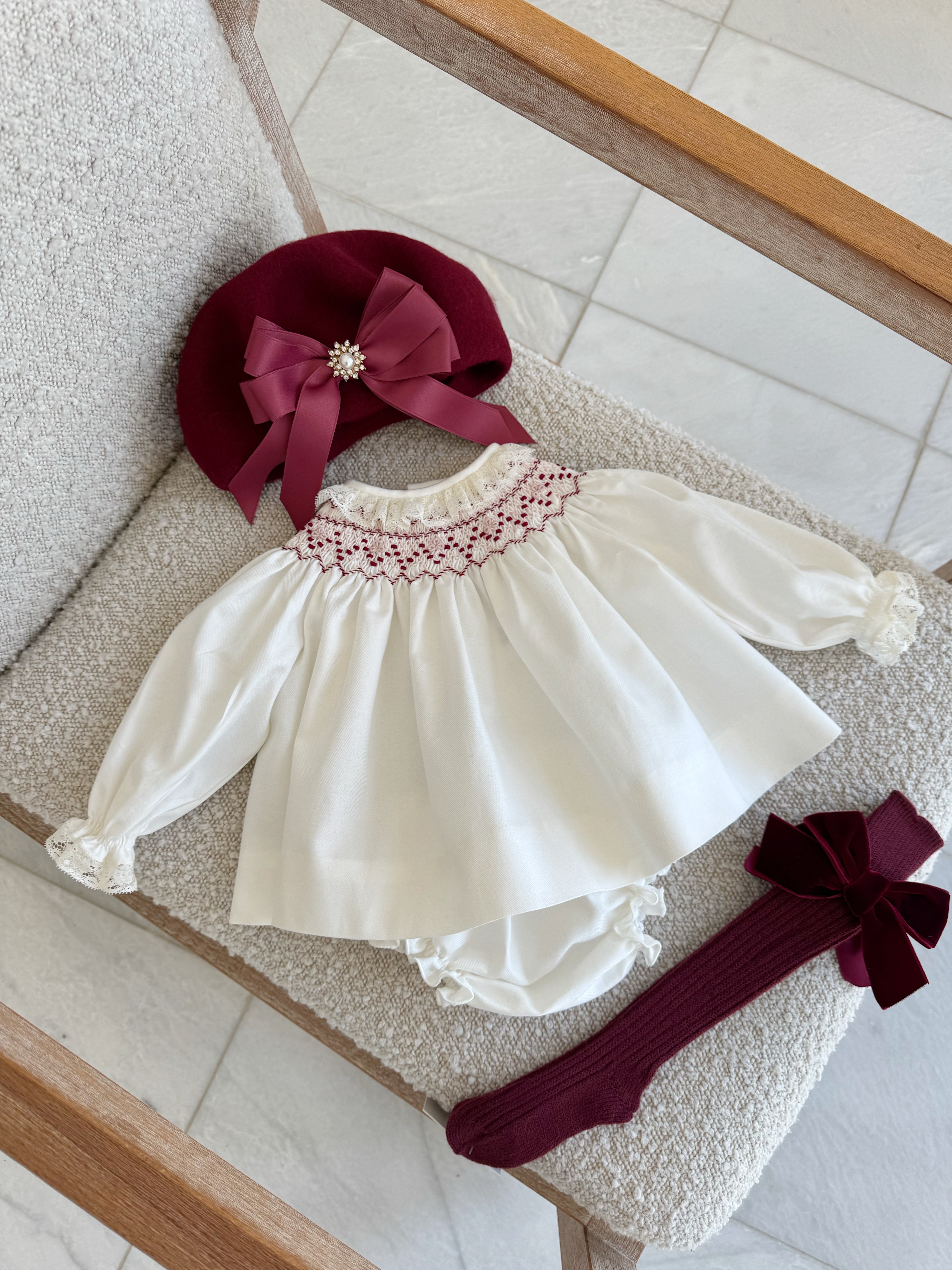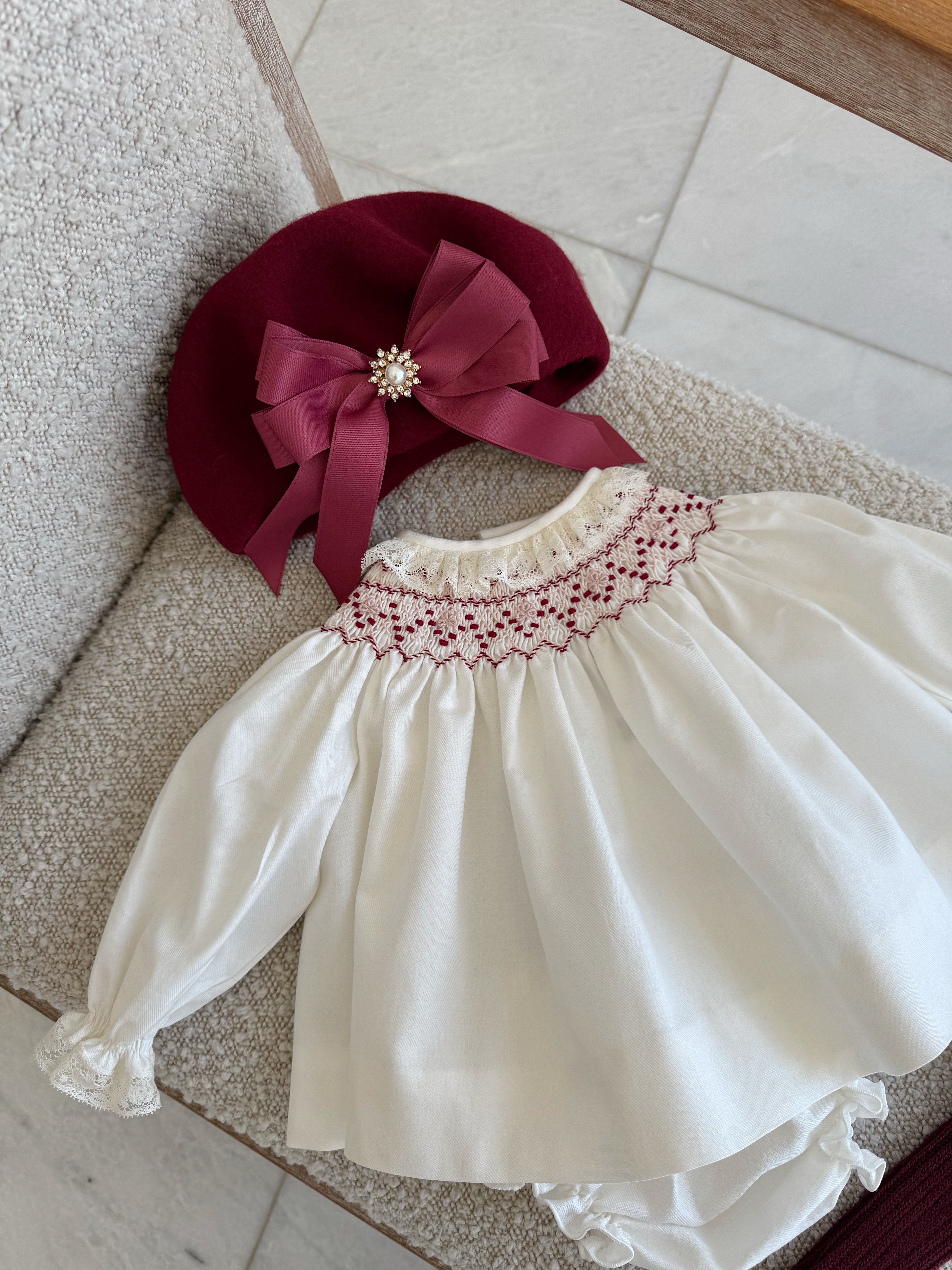Beautiful Ivory Dress/Bloomers 2 piece set with Hand Smoke and lace details.