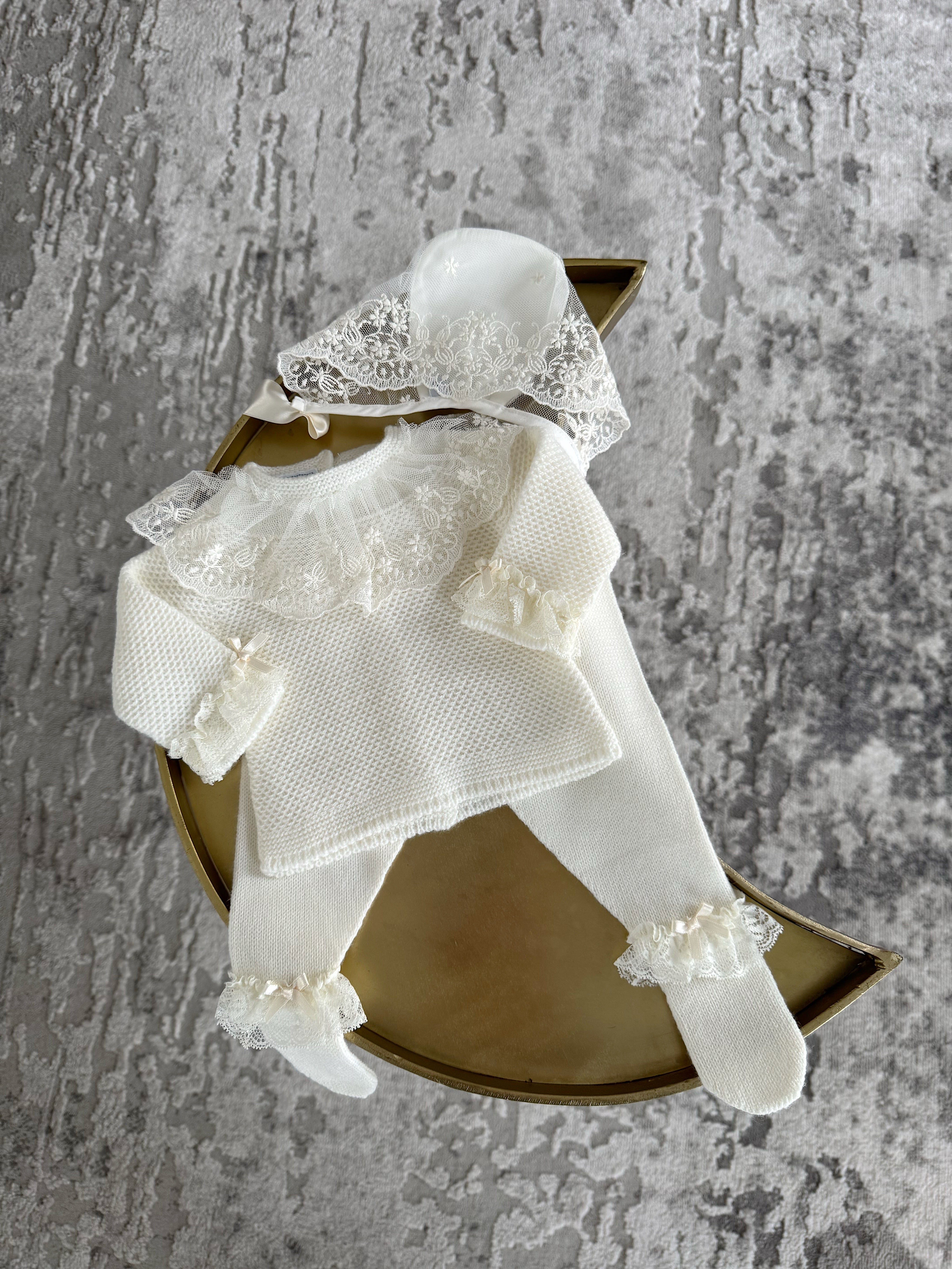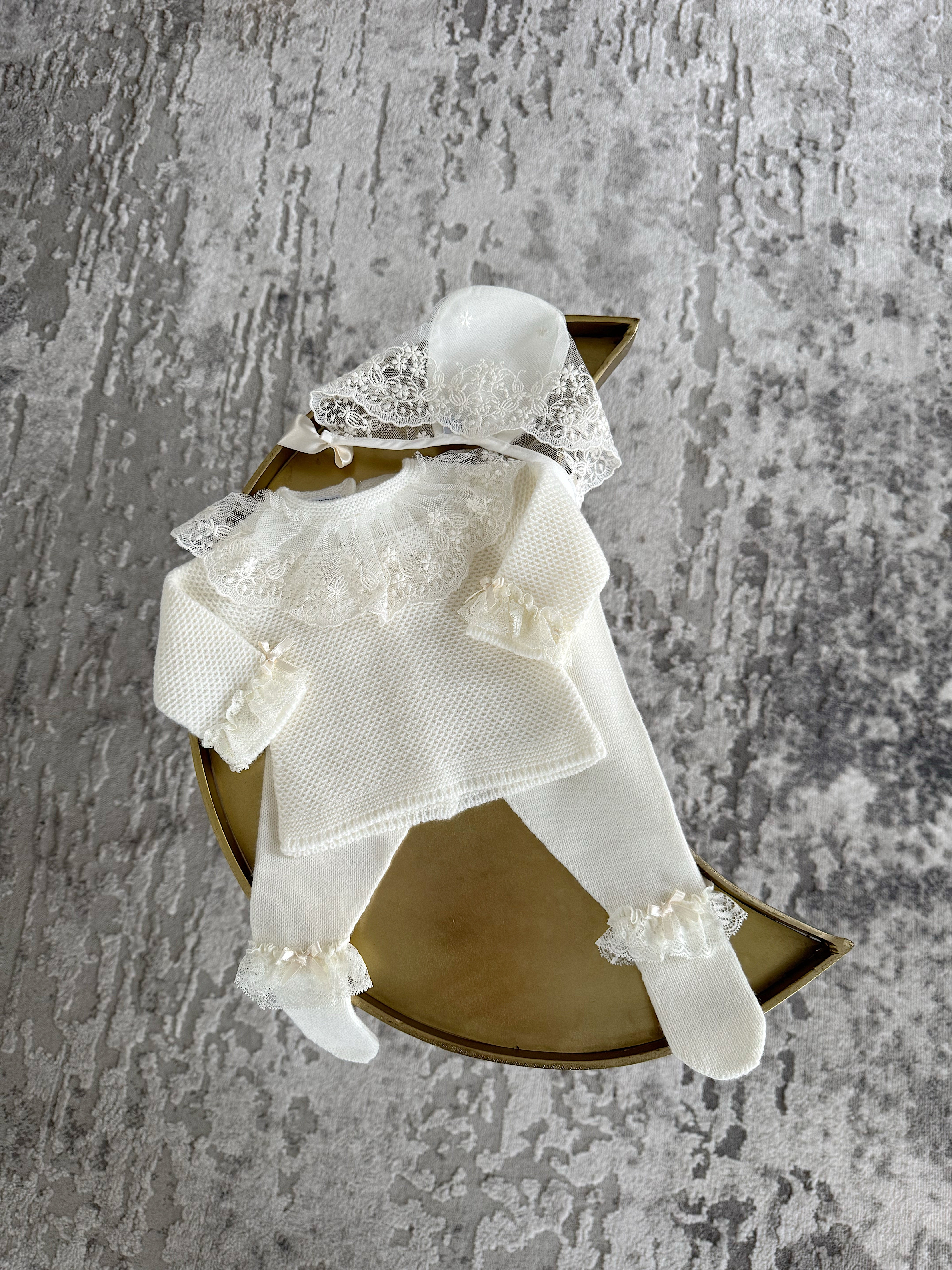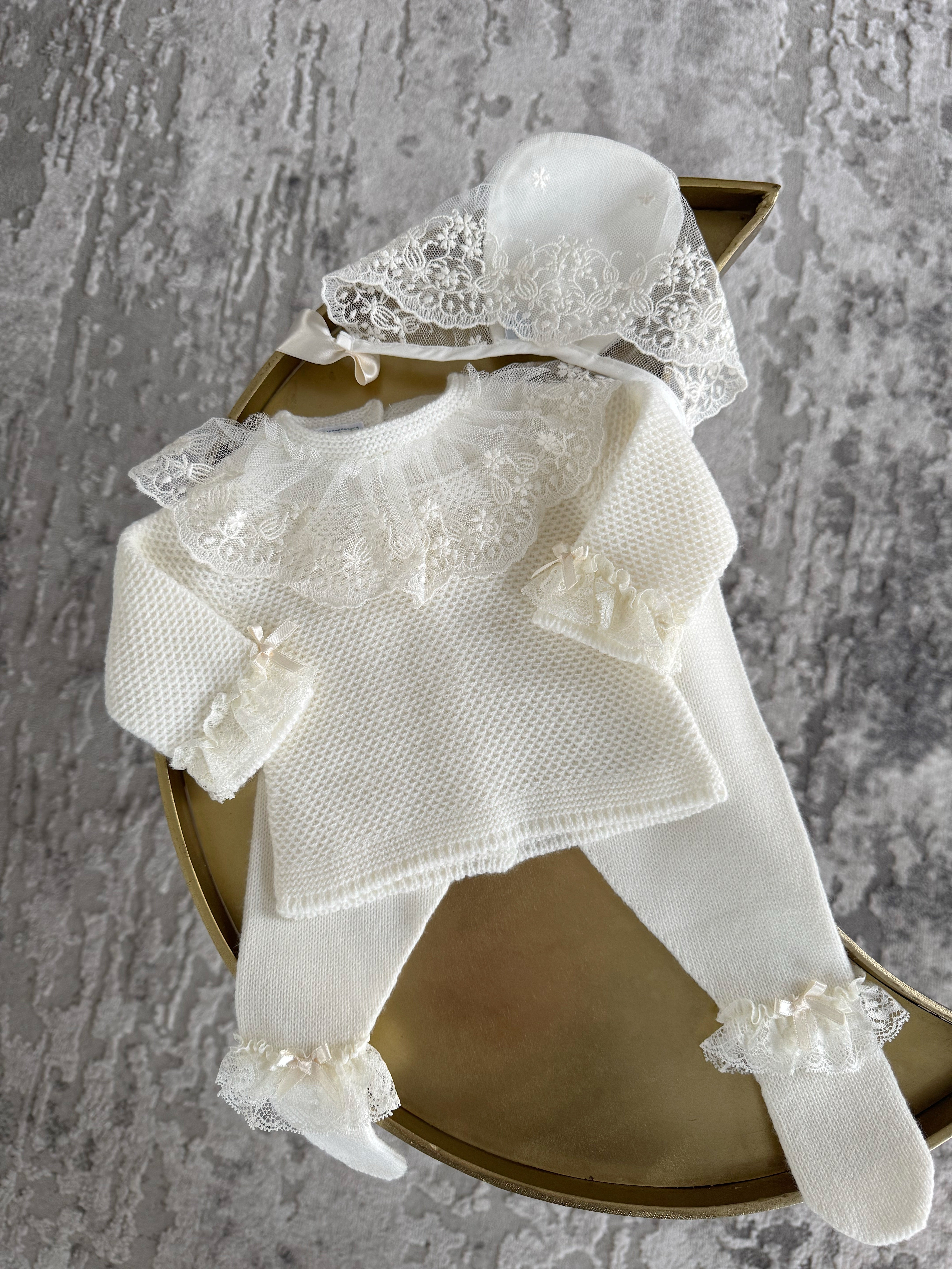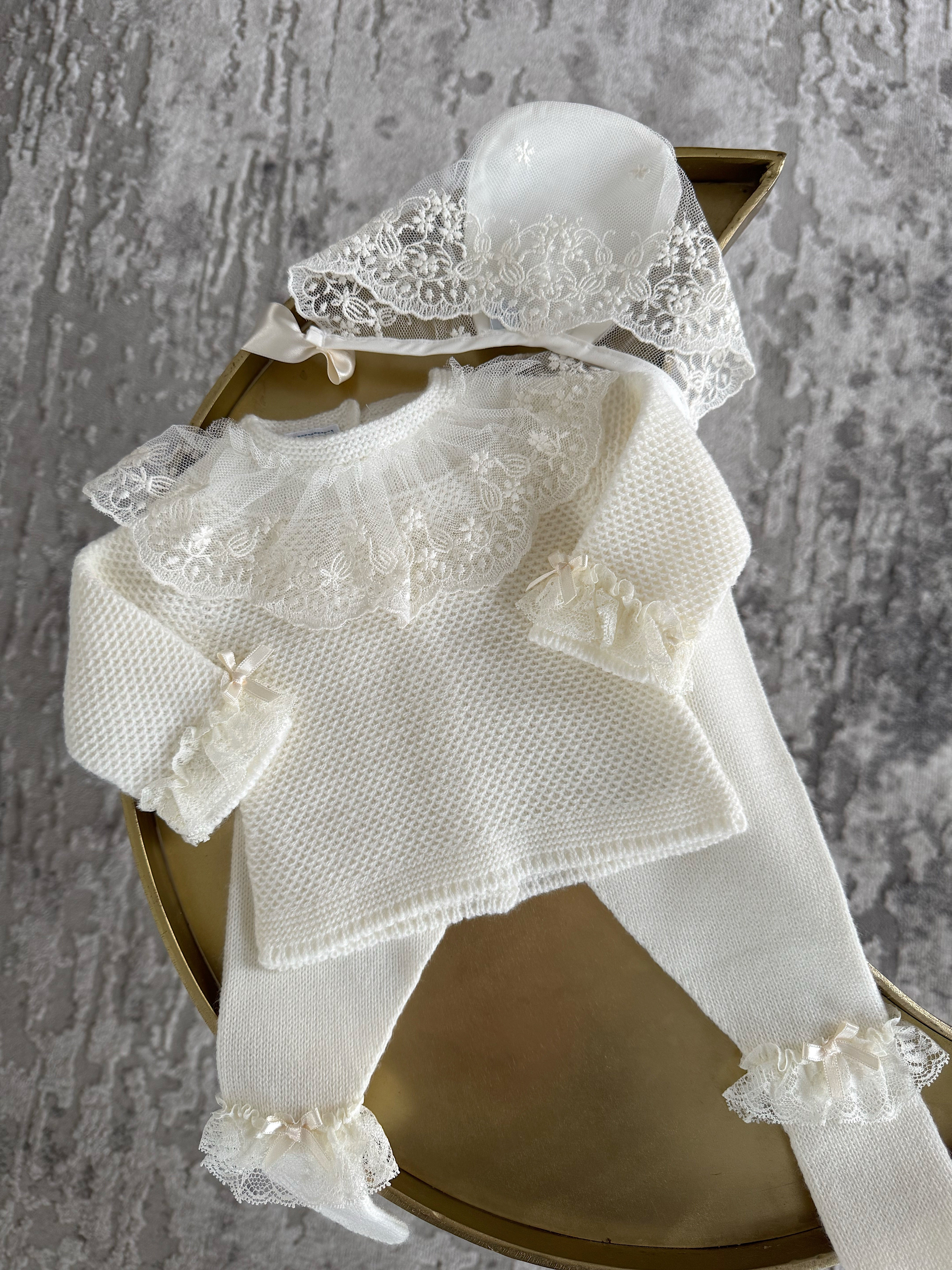Beautiful Ivory knitted 3 piece set with wide lace and bow details.