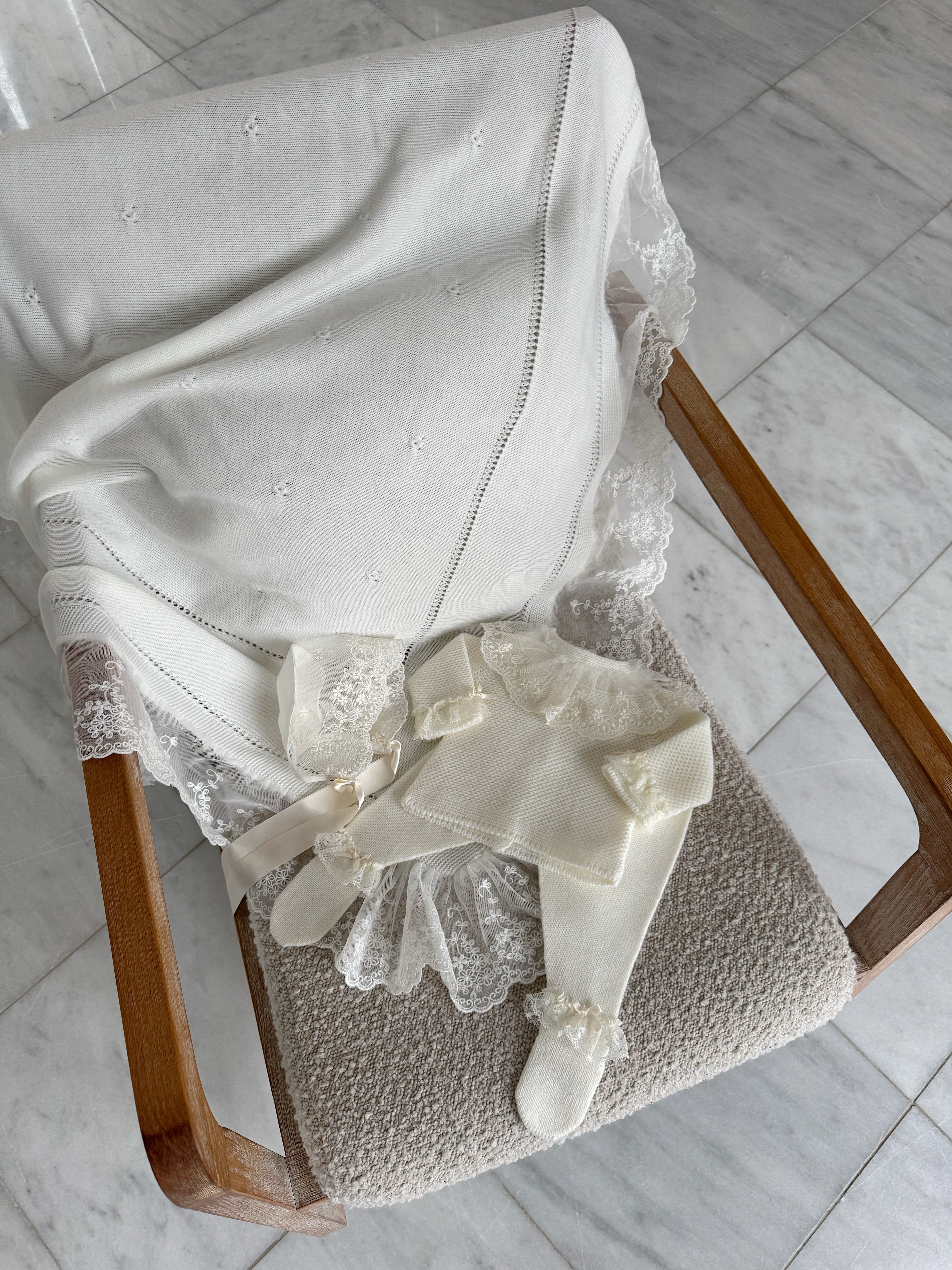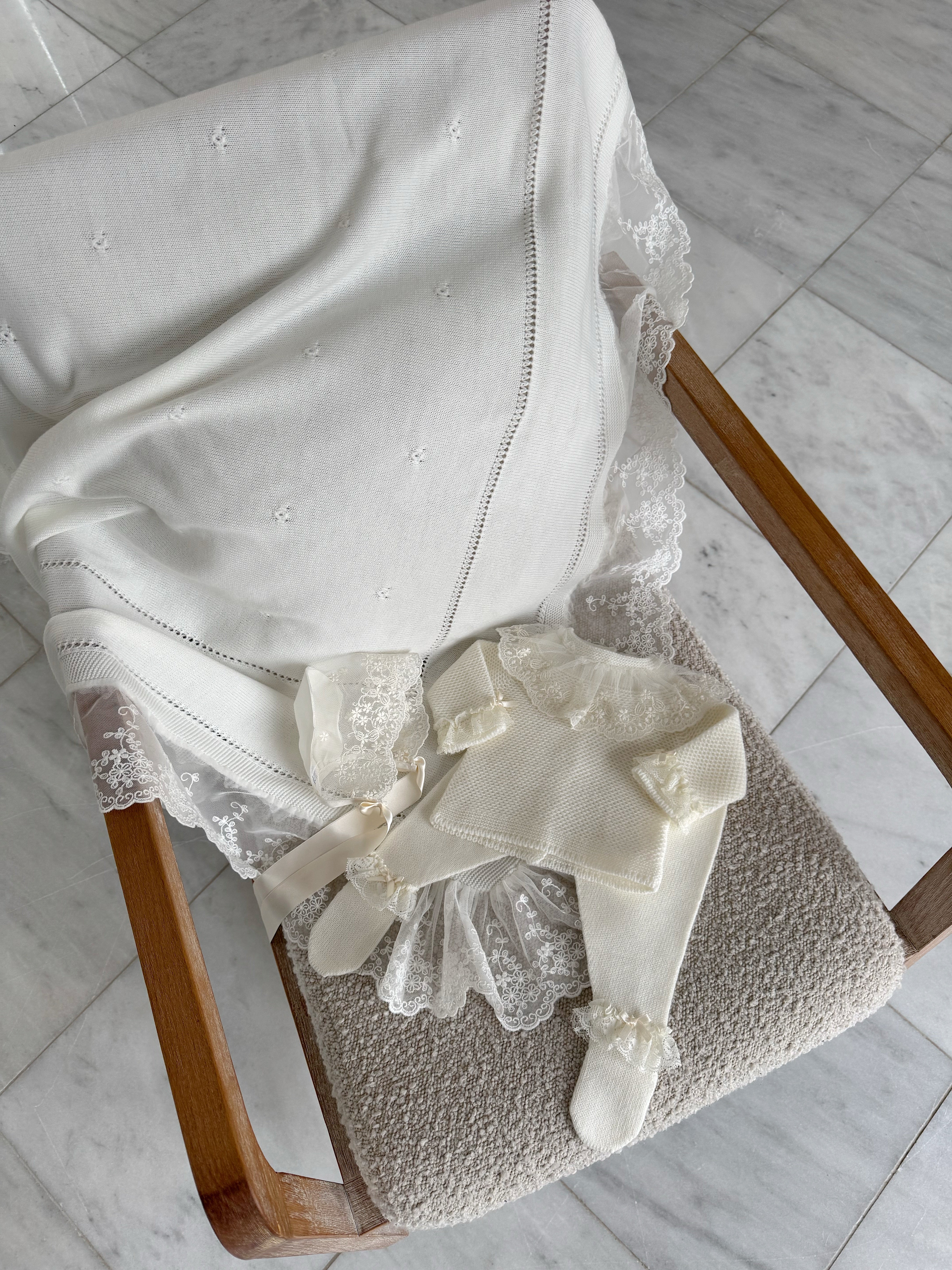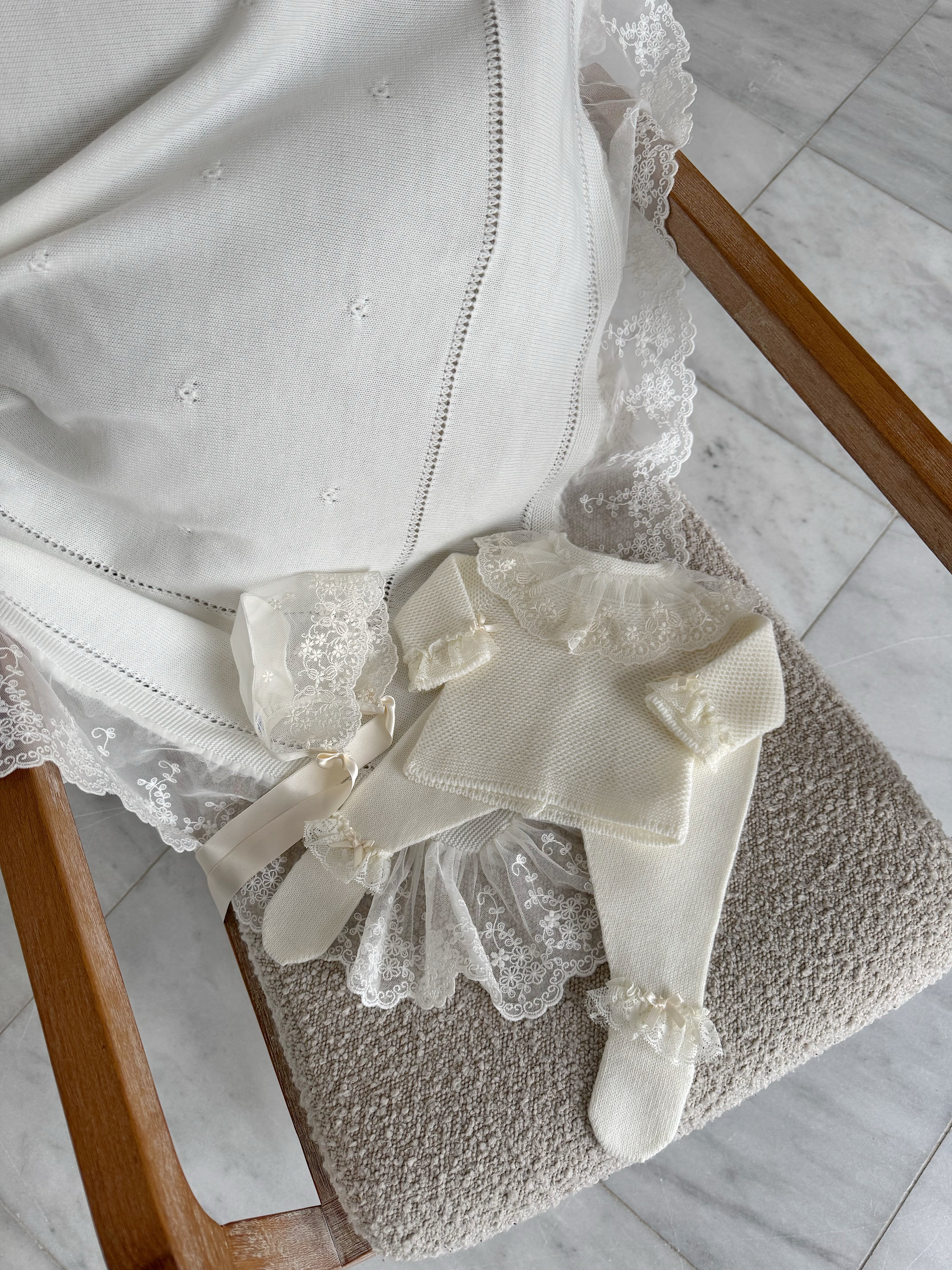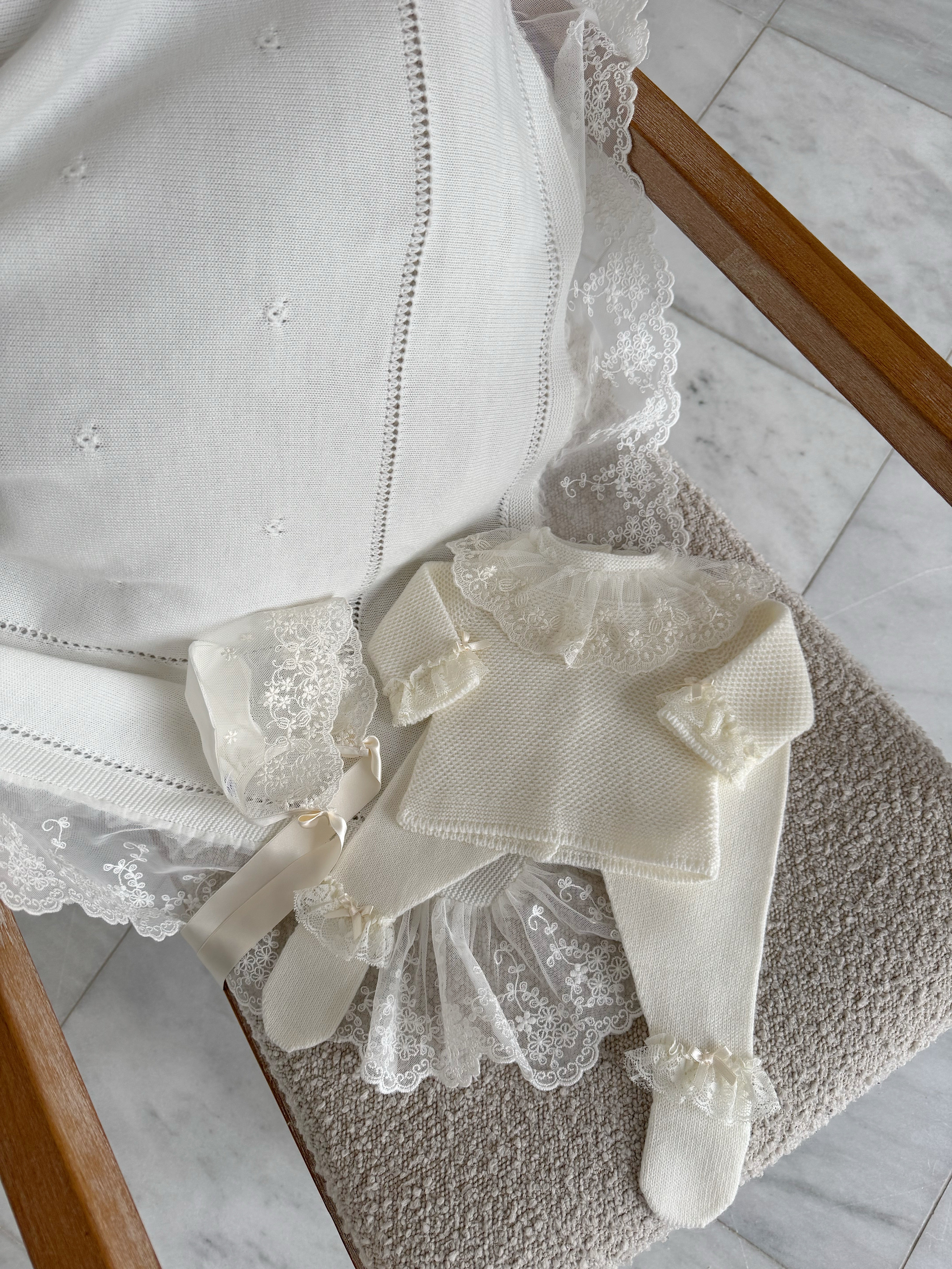 Beautiful Ivory knitted 3 piece set with wide lace and bow details.