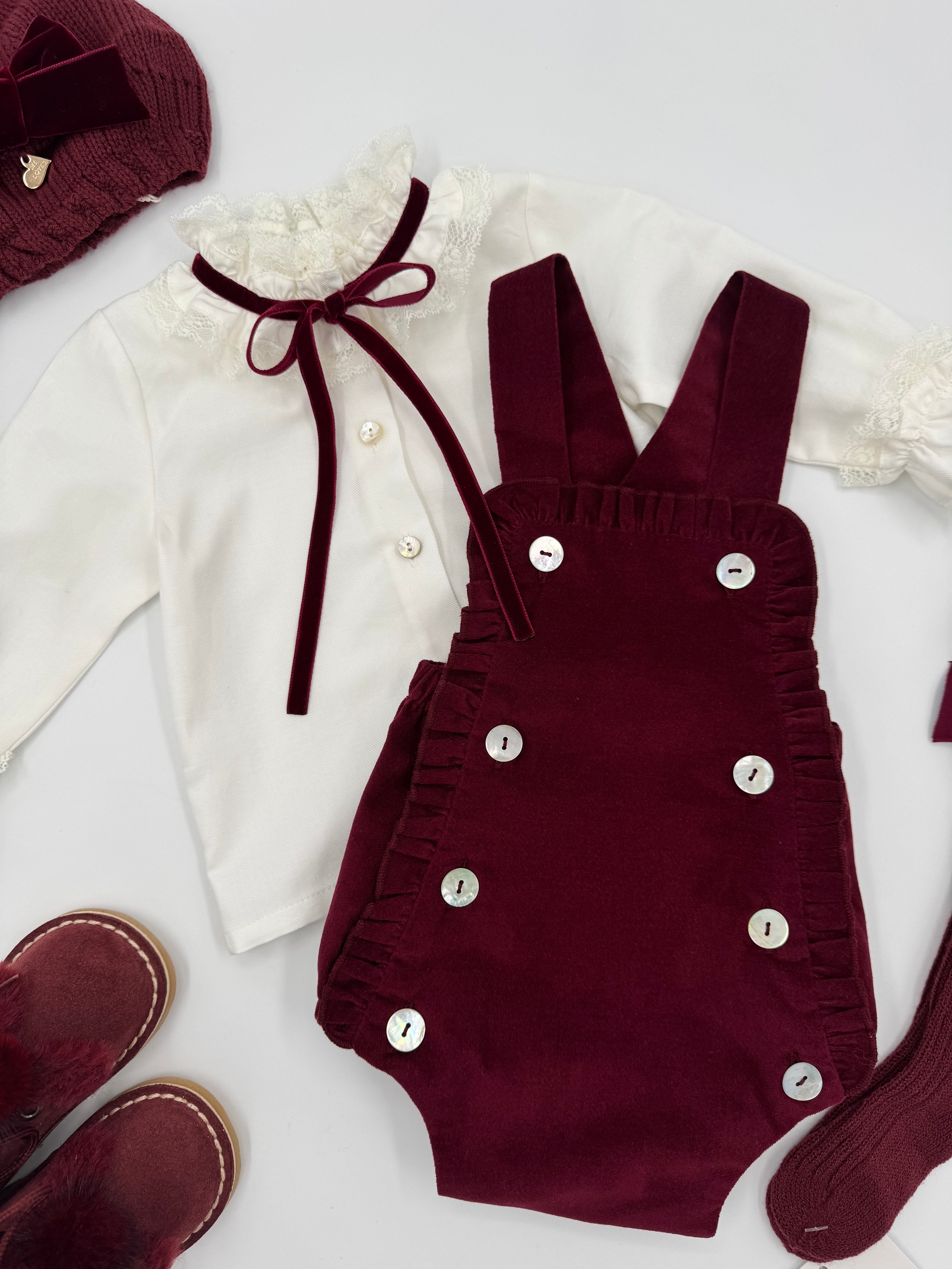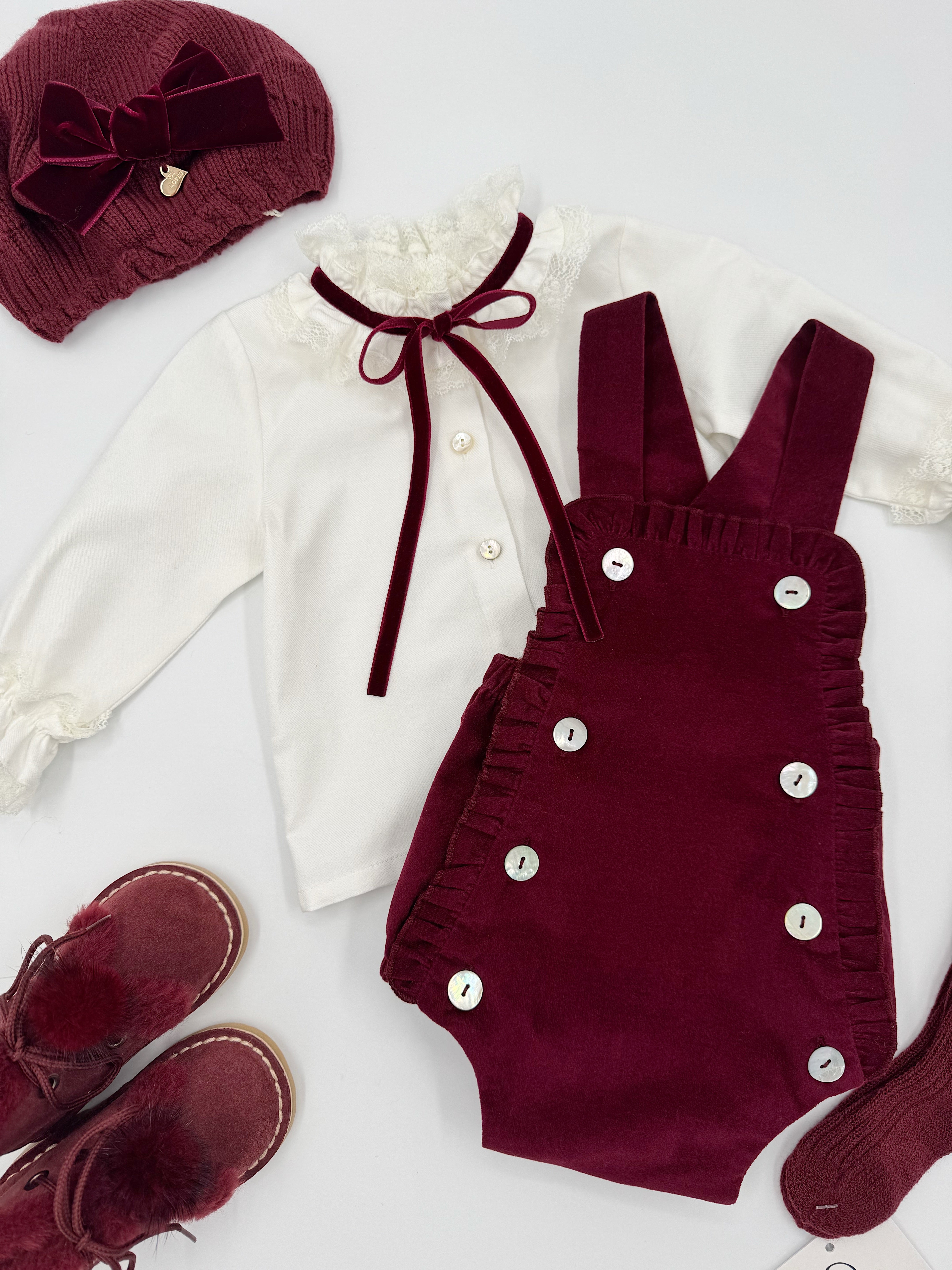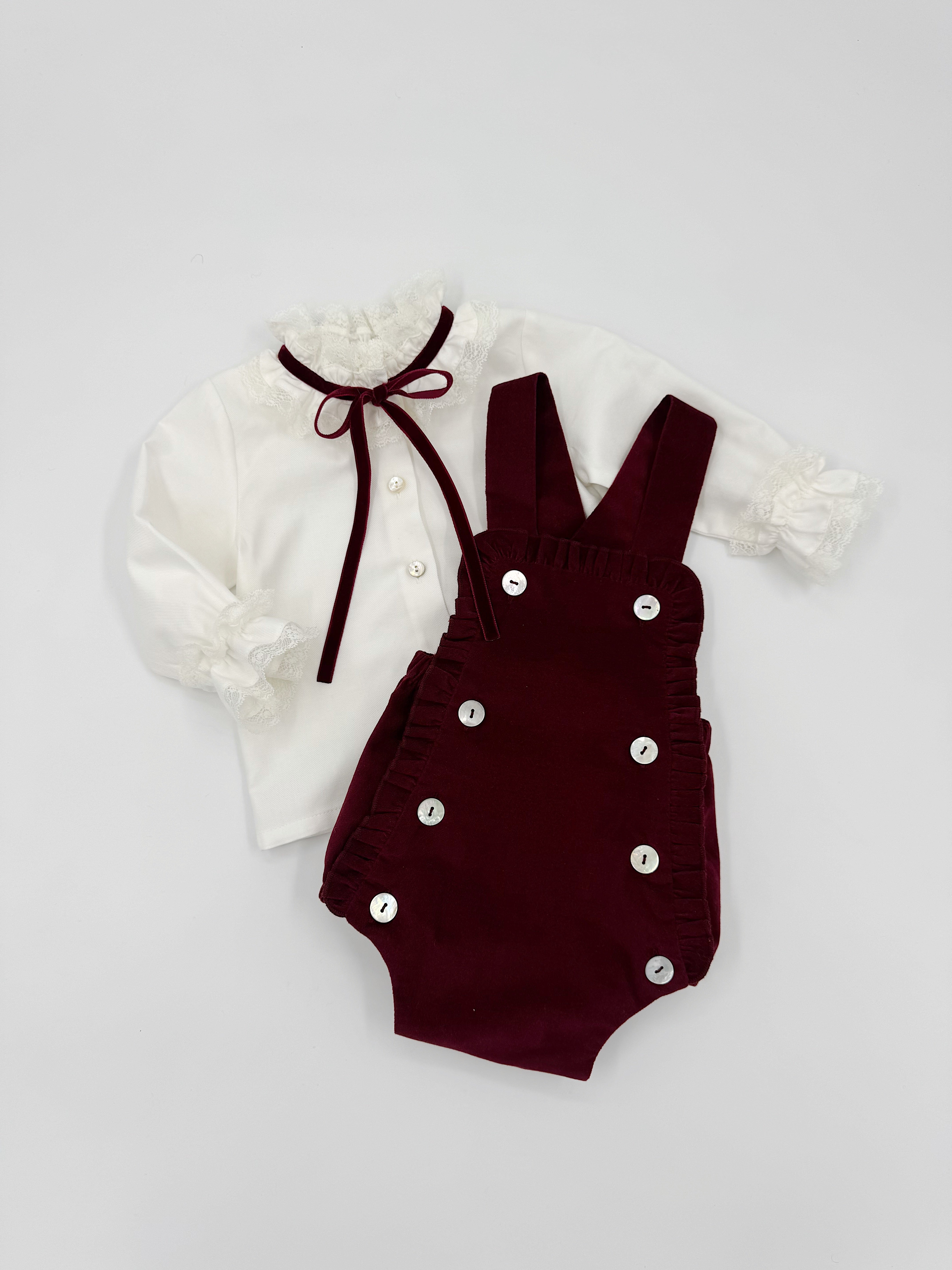 Beautiful Ivory Shirt and Burgundy Velvet Romper 2 piece set.