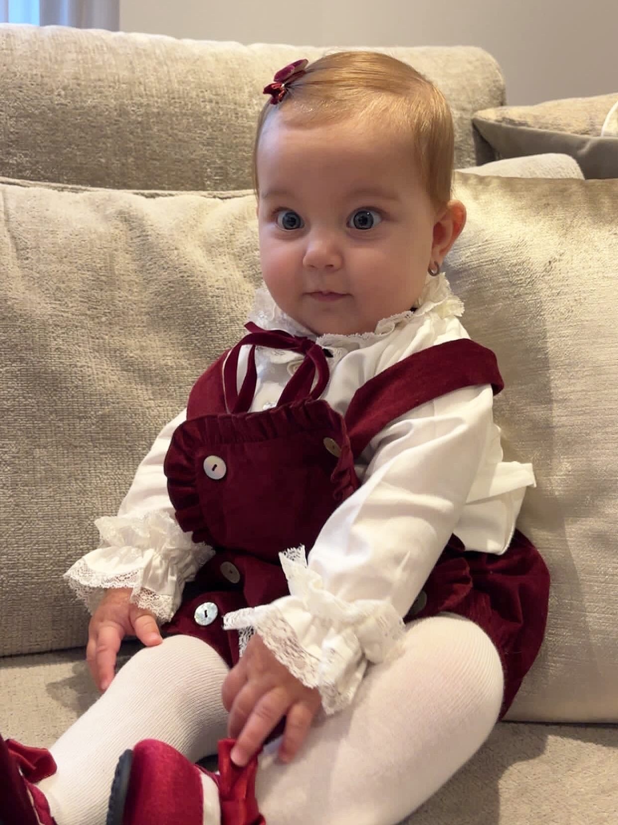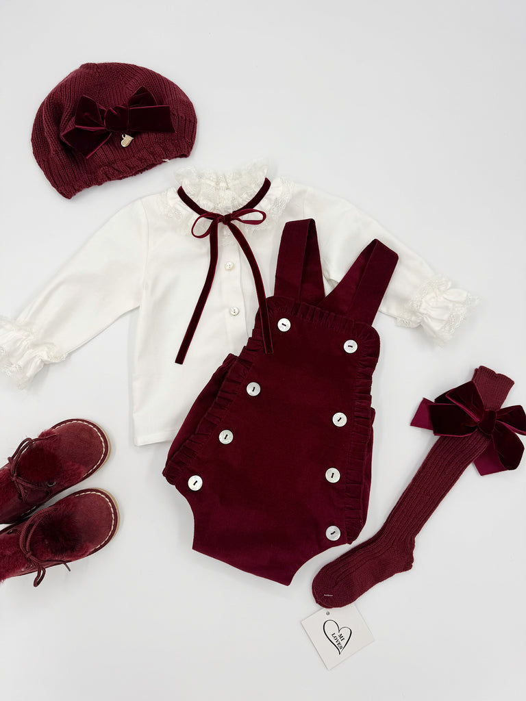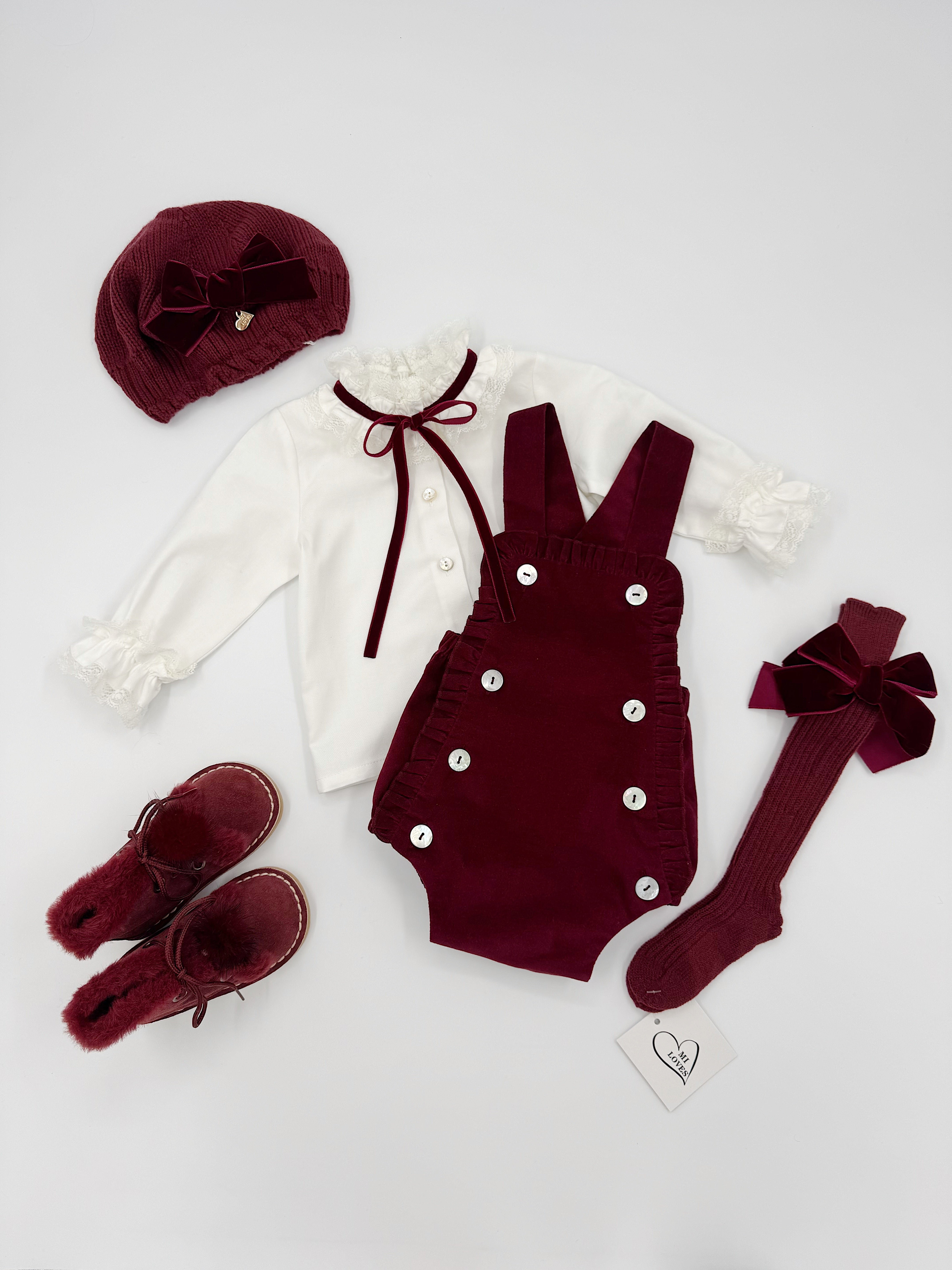 Beautiful Ivory Shirt and Burgundy Velvet Romper 2 piece set.