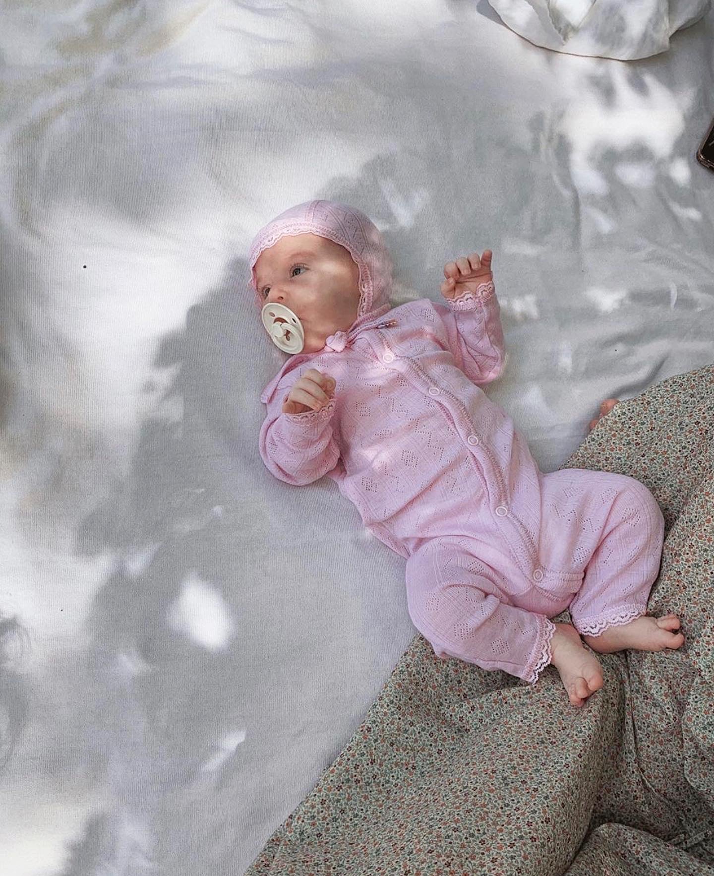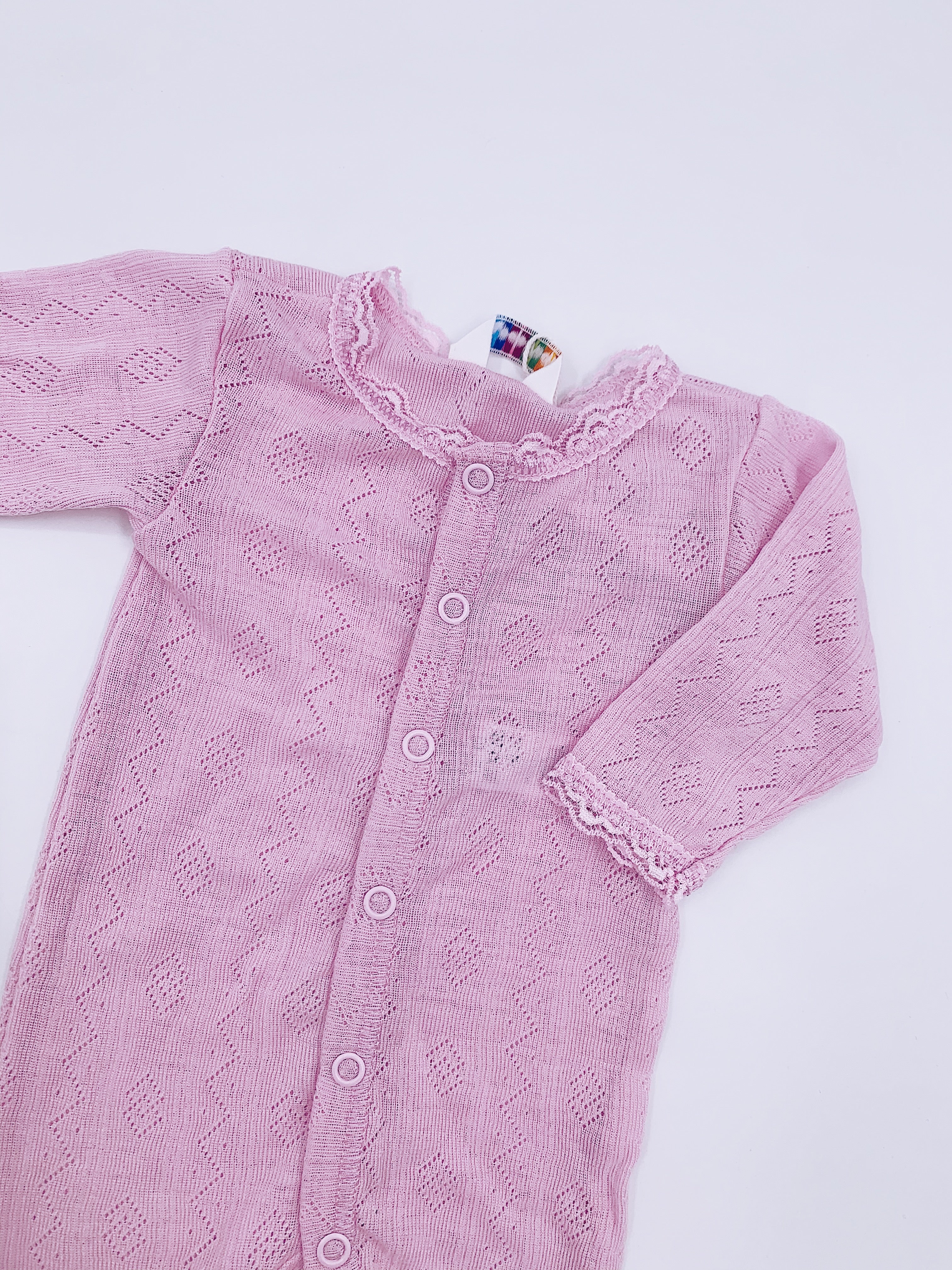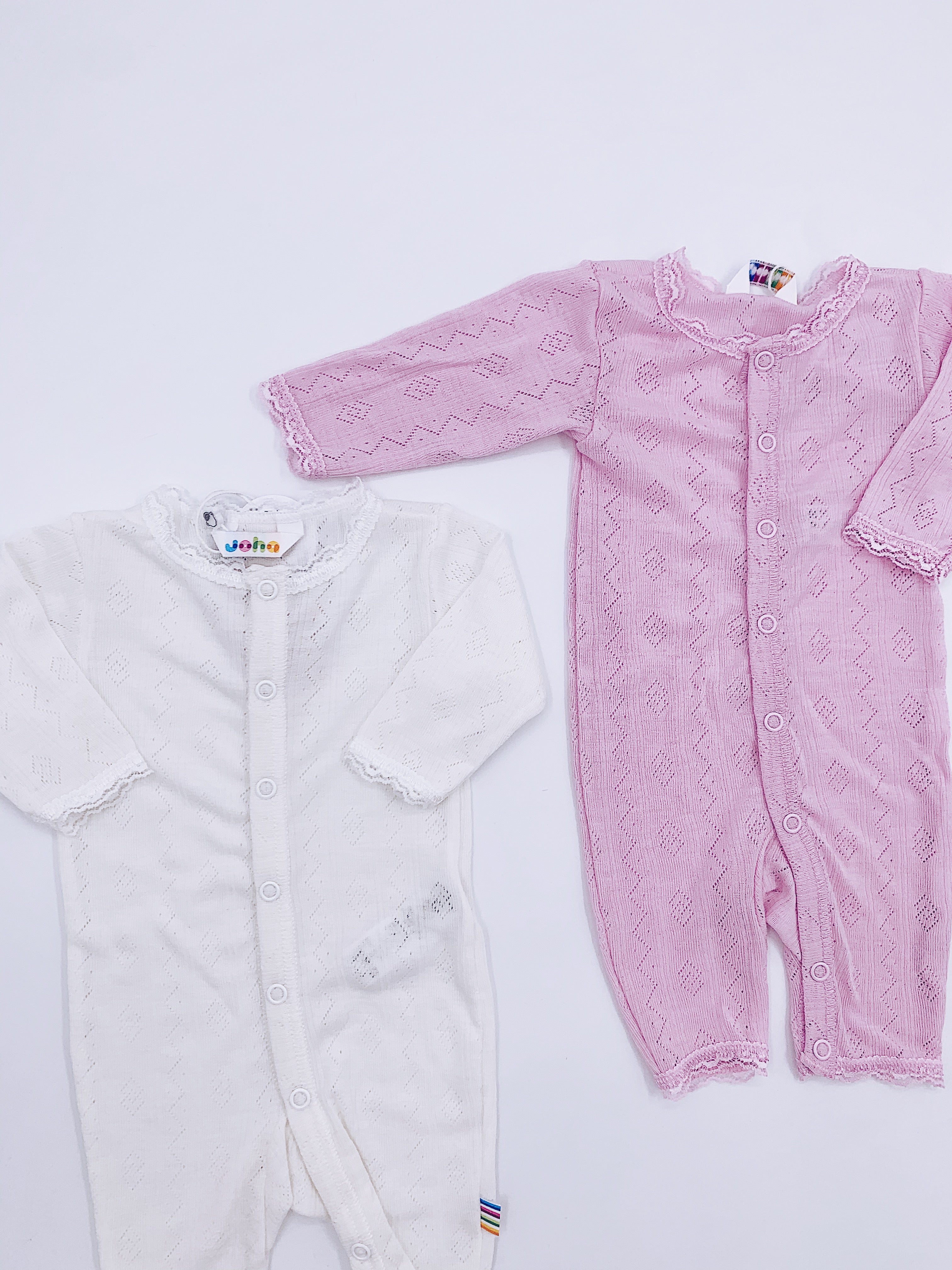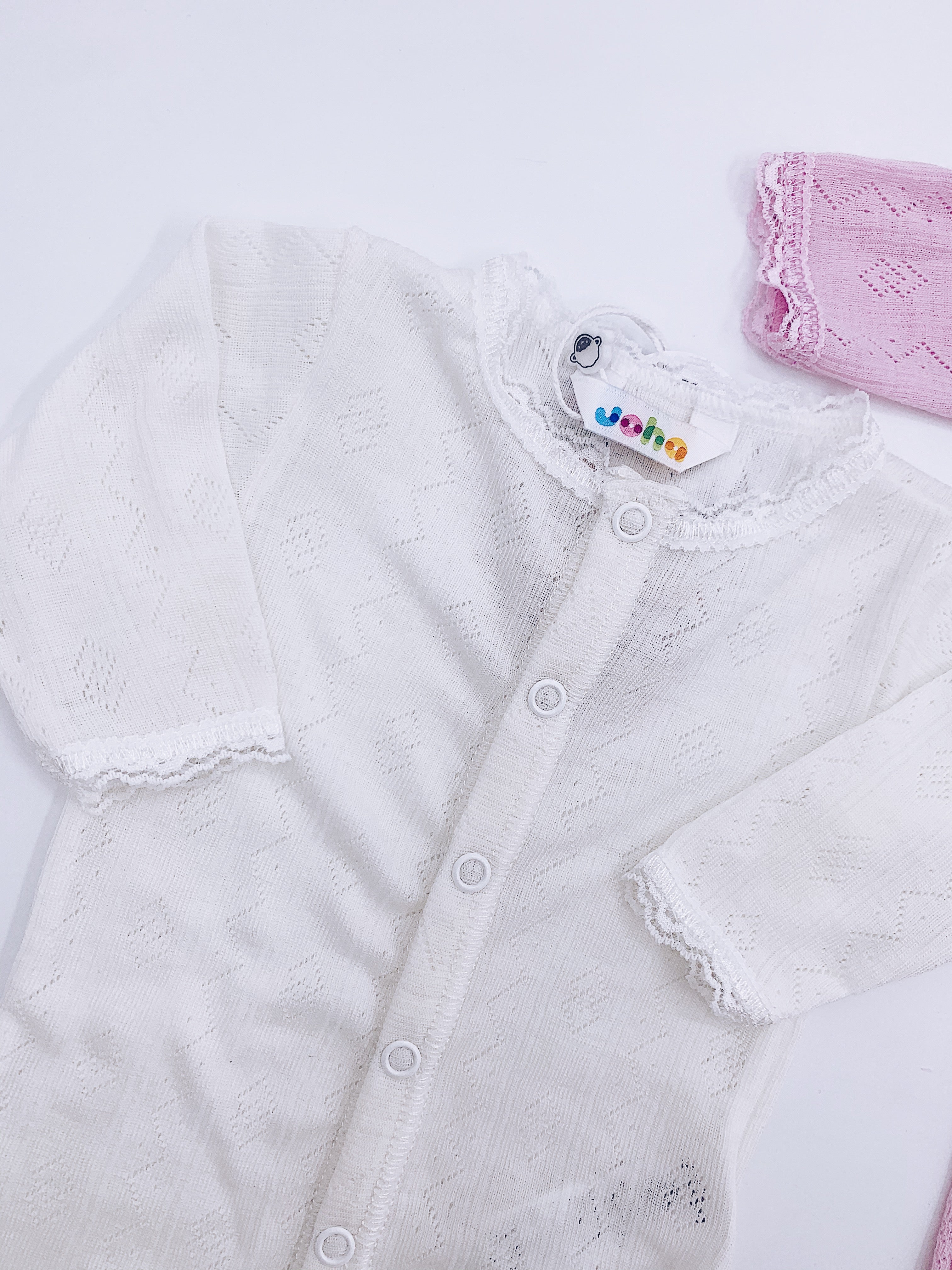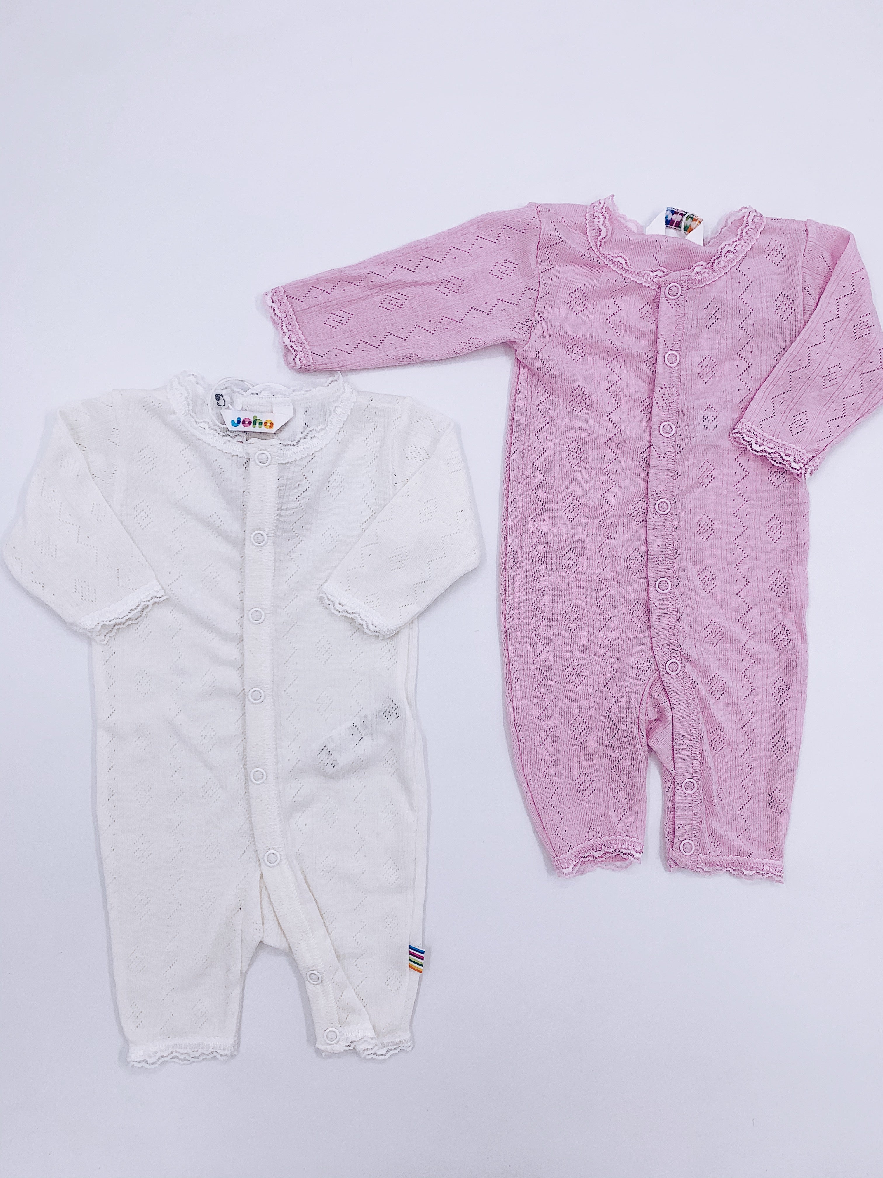 Beautiful Joha Wool-Silk Girls Romper.The Joha romper made from a lightweight wool-silk blend ,with a lacy pattern .The wool regulates body temperature and the silk gives a smooth feeling against the skin.Poppers fastening.