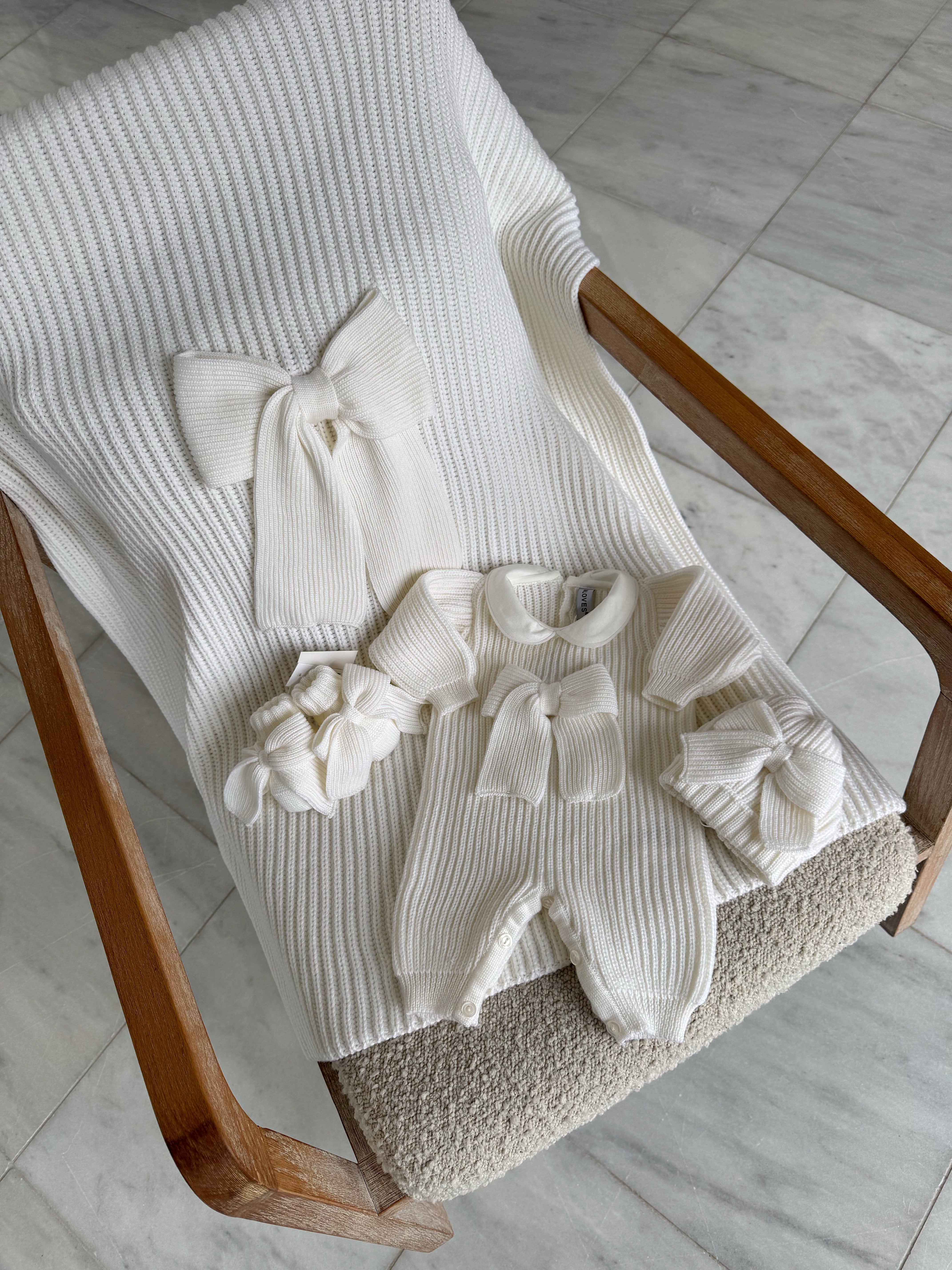 Beautiful knitted Merino Wool Ivory/White Romper with Bow details.