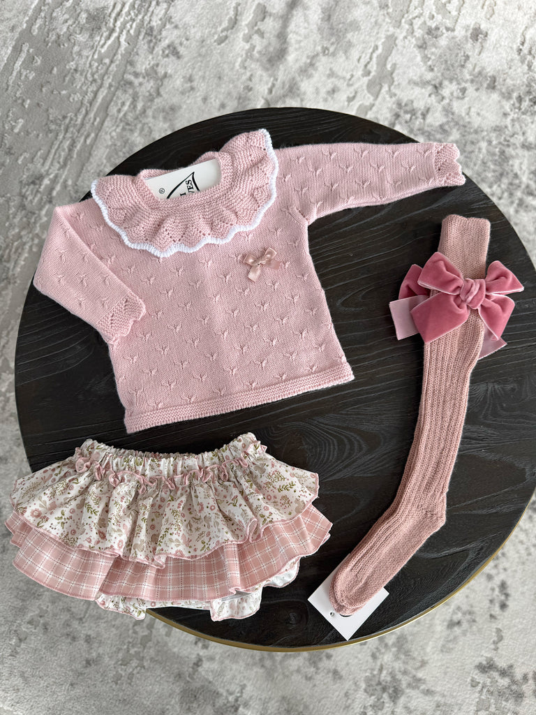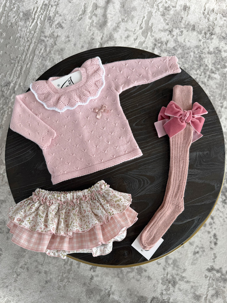 Beautiful Knitted top and bloomers 2 piece set with bow and frill details.
