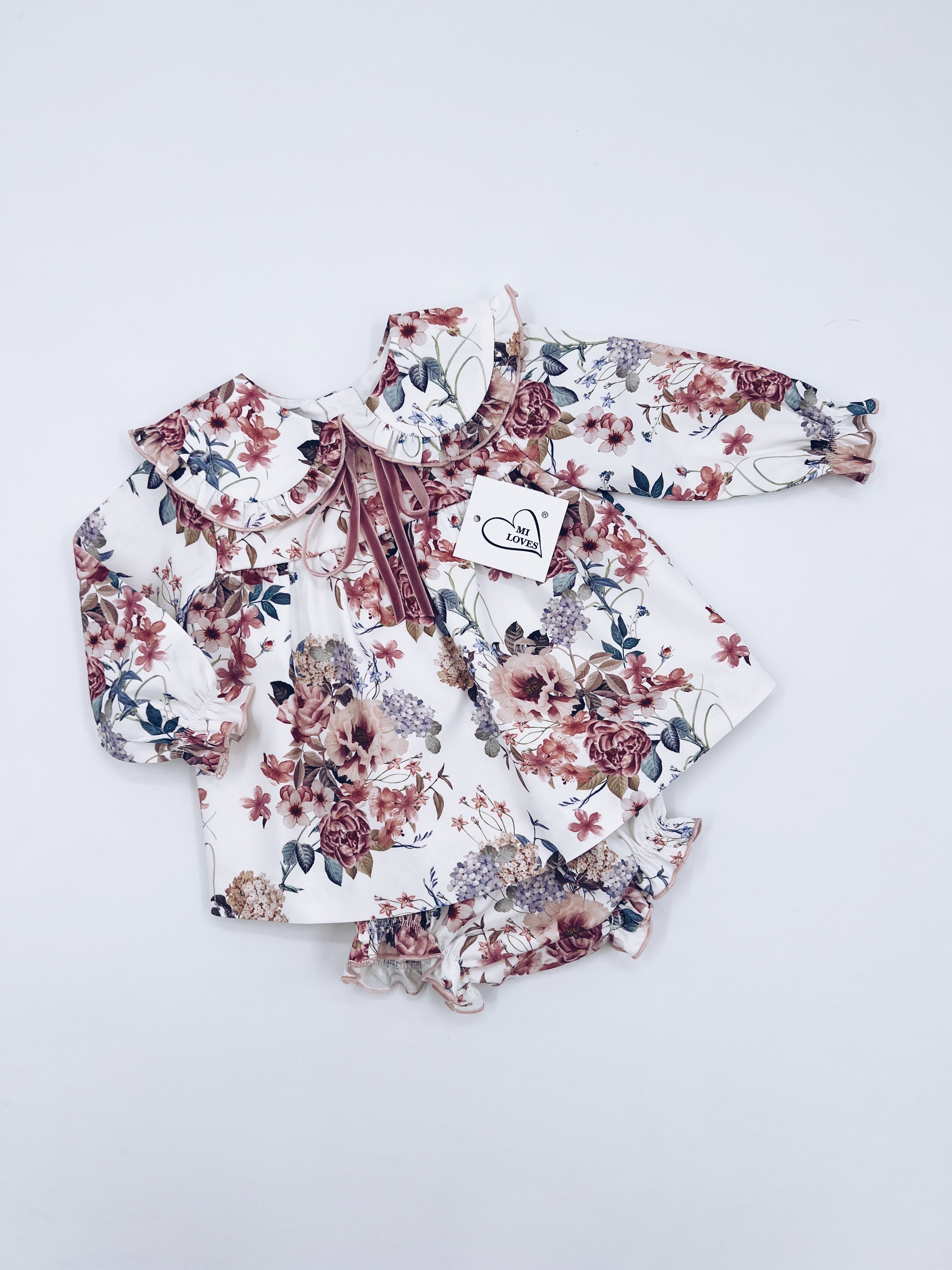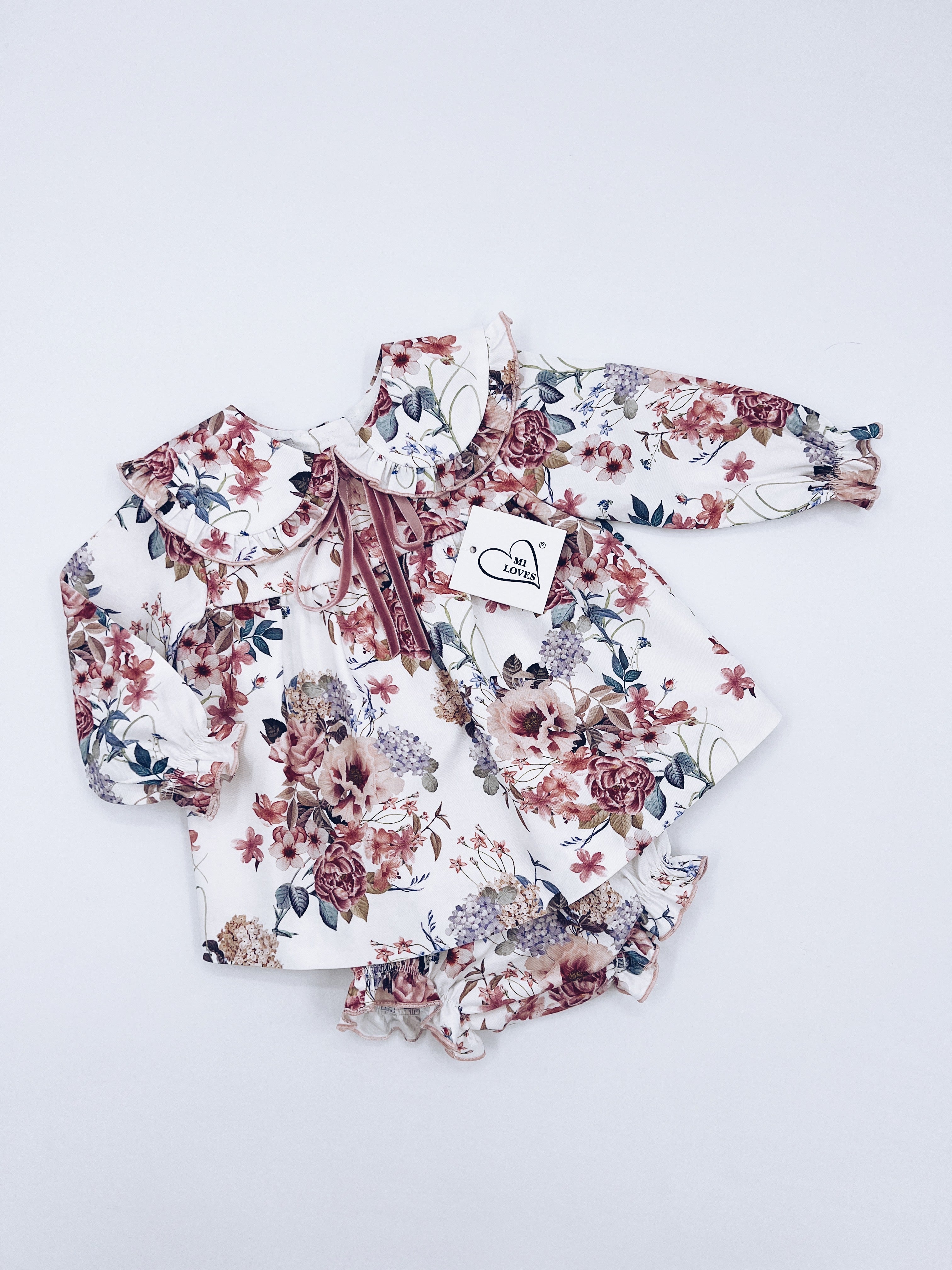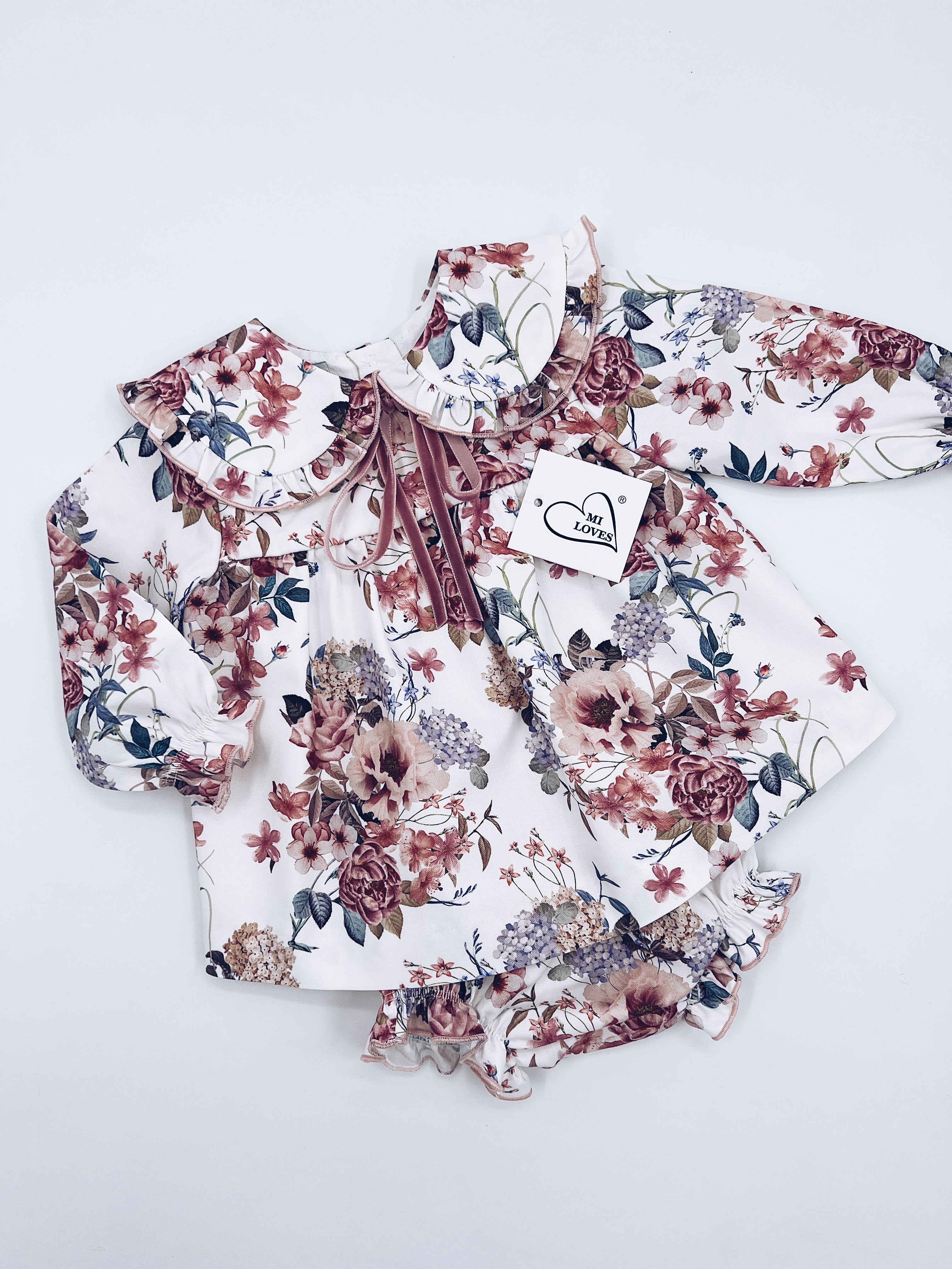 Beautiful Pink Floral print Dress/Bloomers 2 piece set with bow details