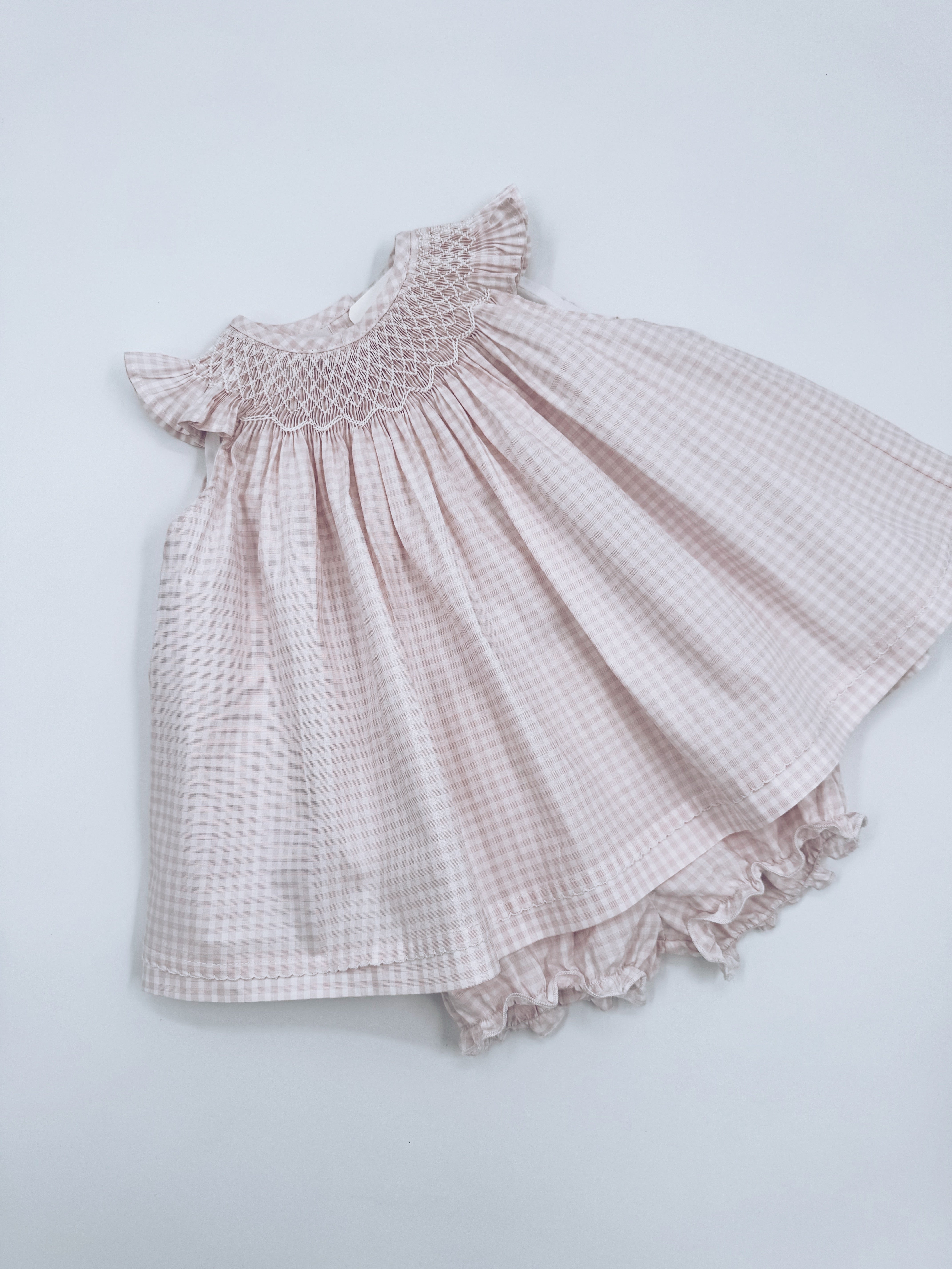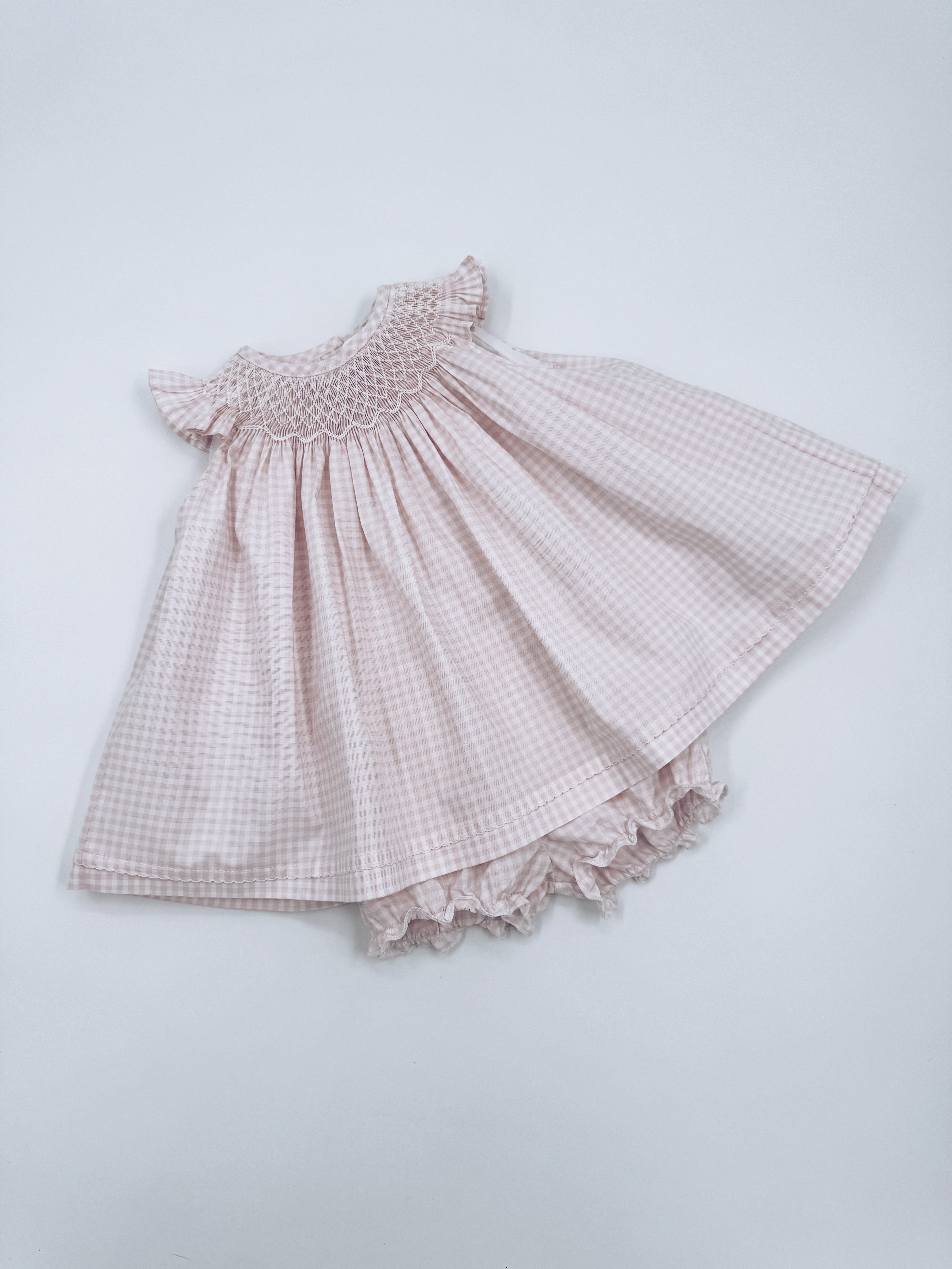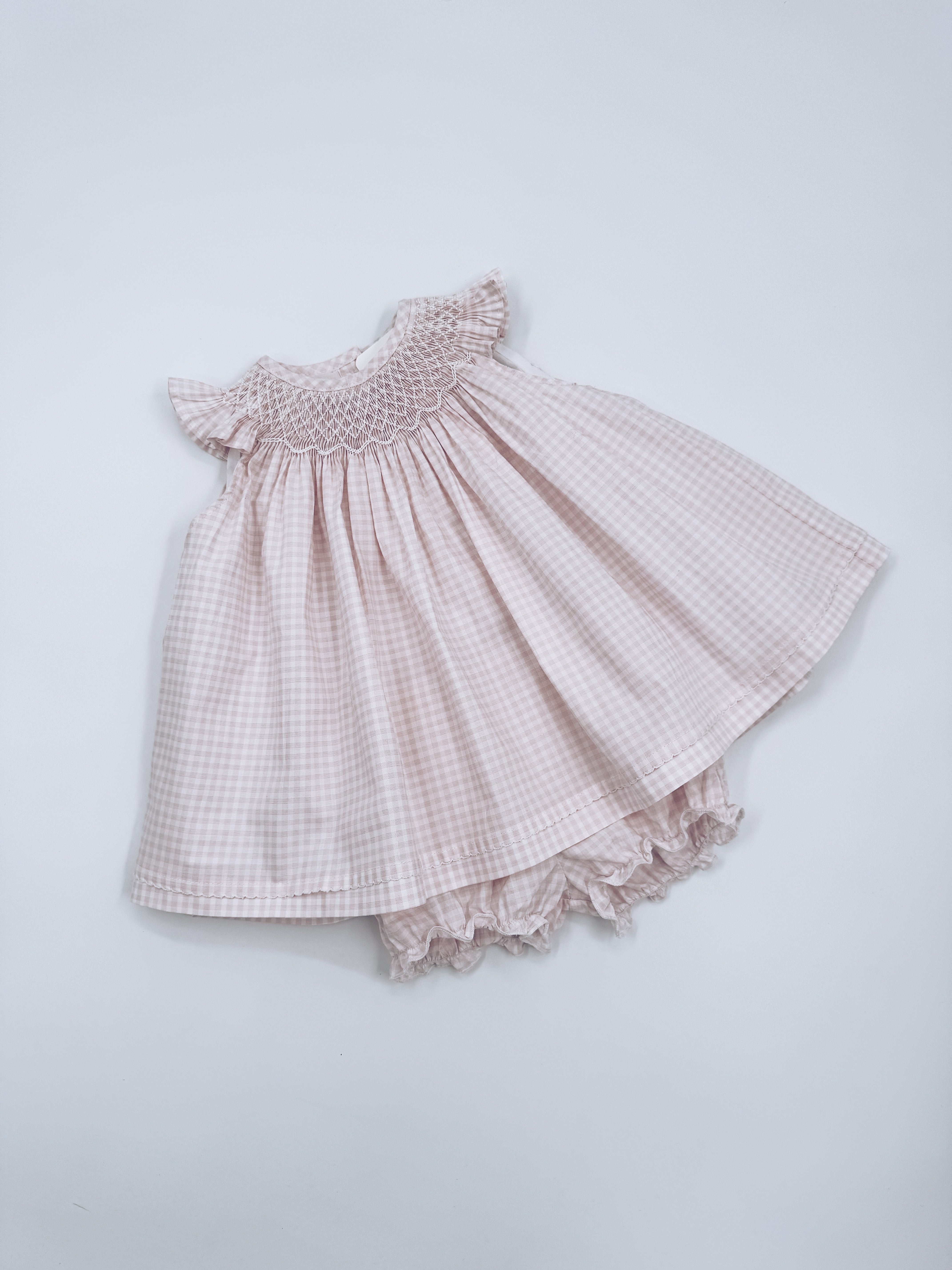 Beautiful Pink Gingham Hand Smoked dress and bloomers 2 piece set.