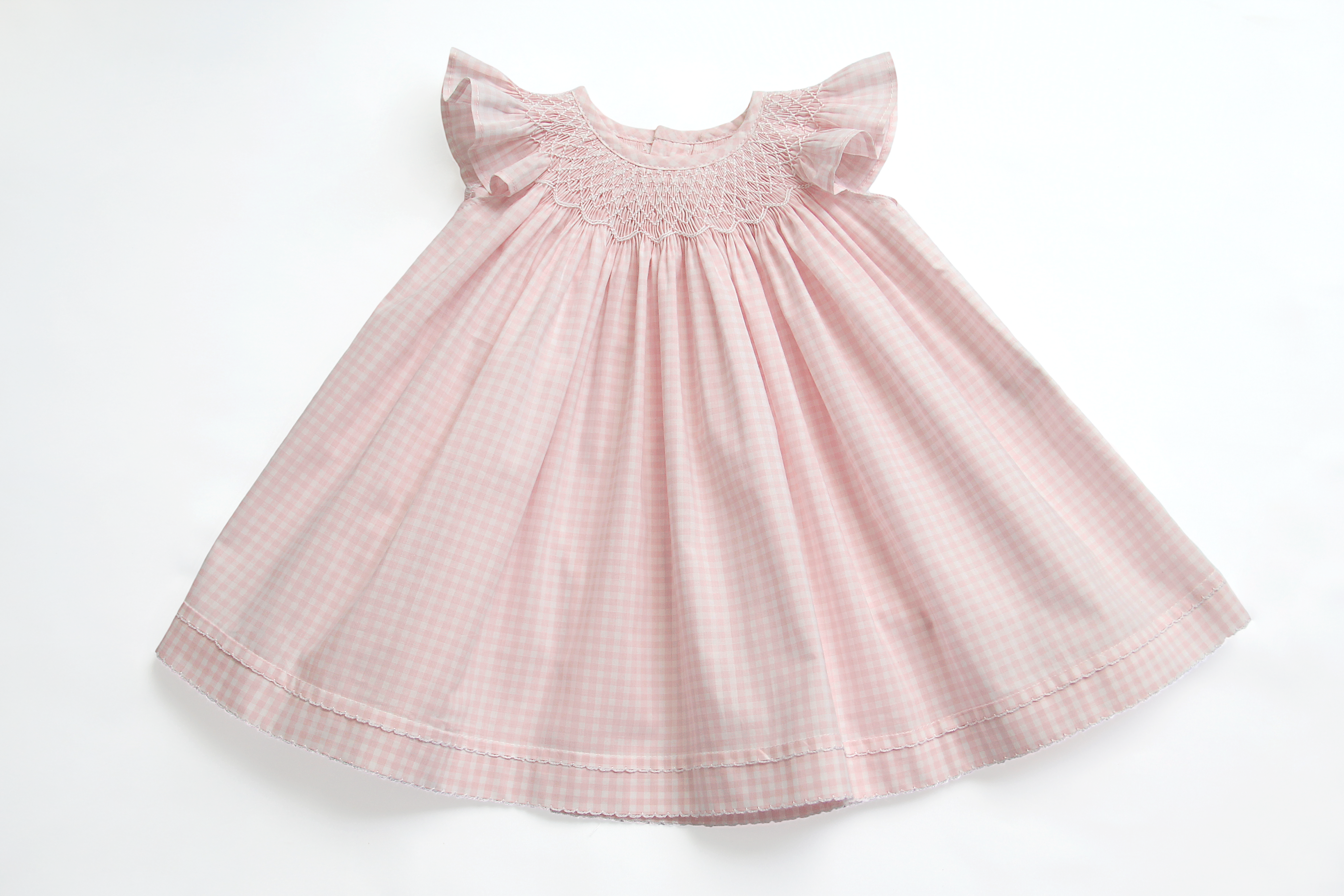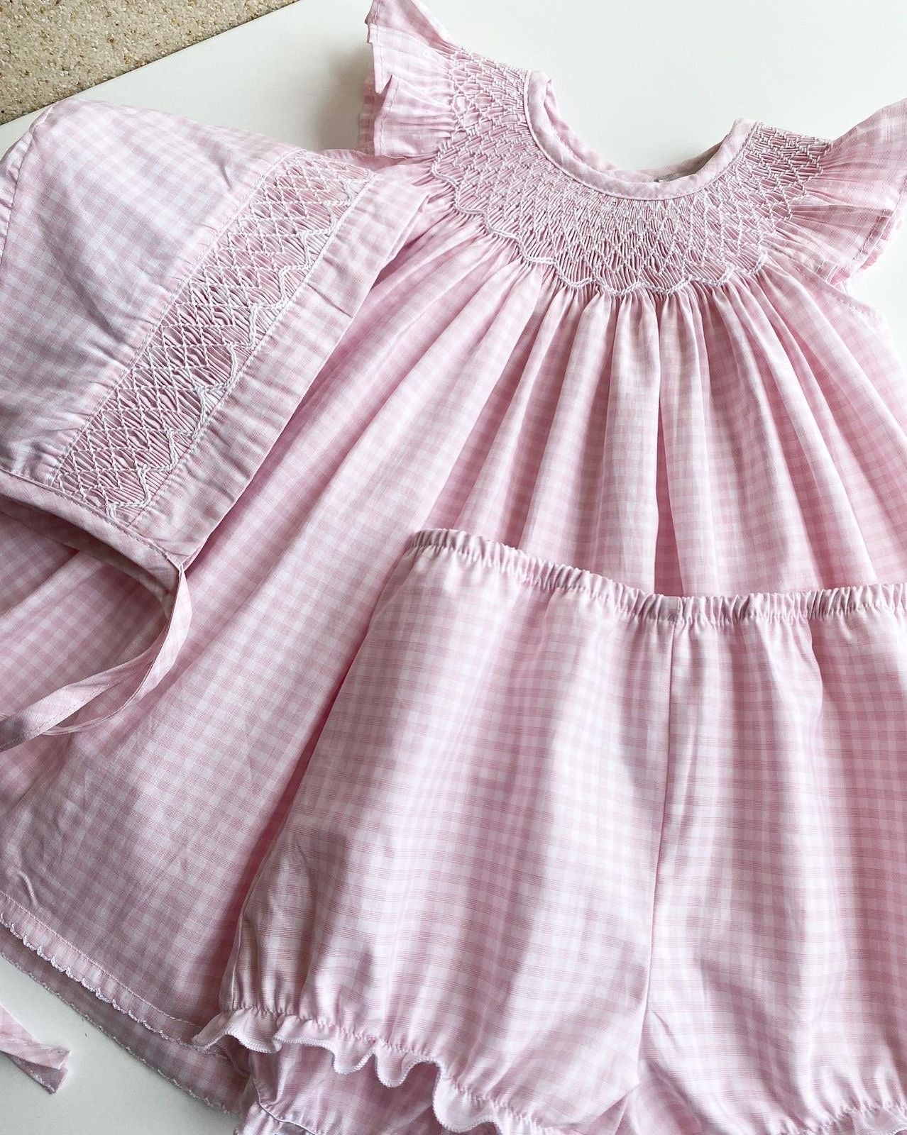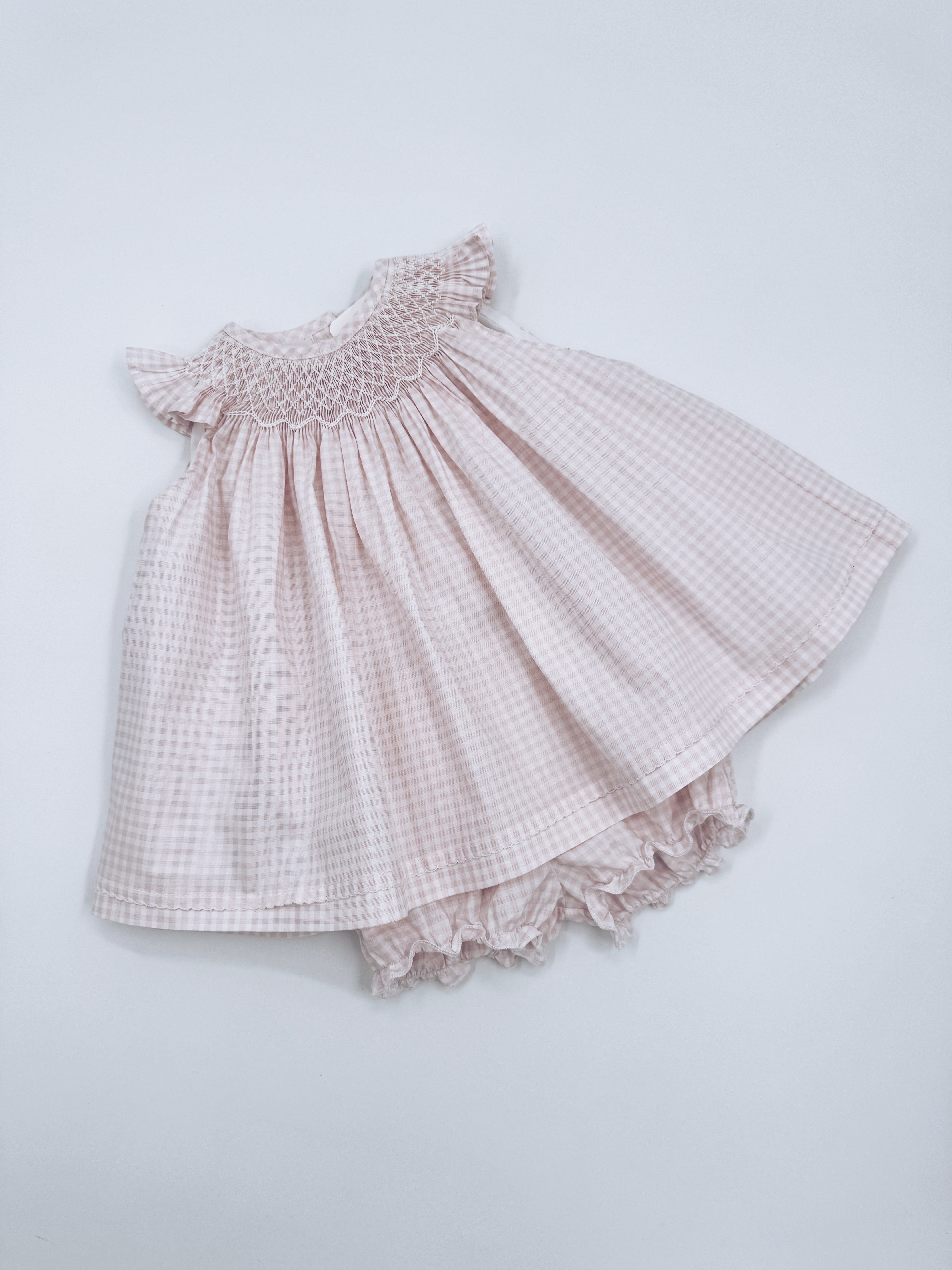 Beautiful Pink Gingham Hand Smoked dress and bloomers 2 piece set.
