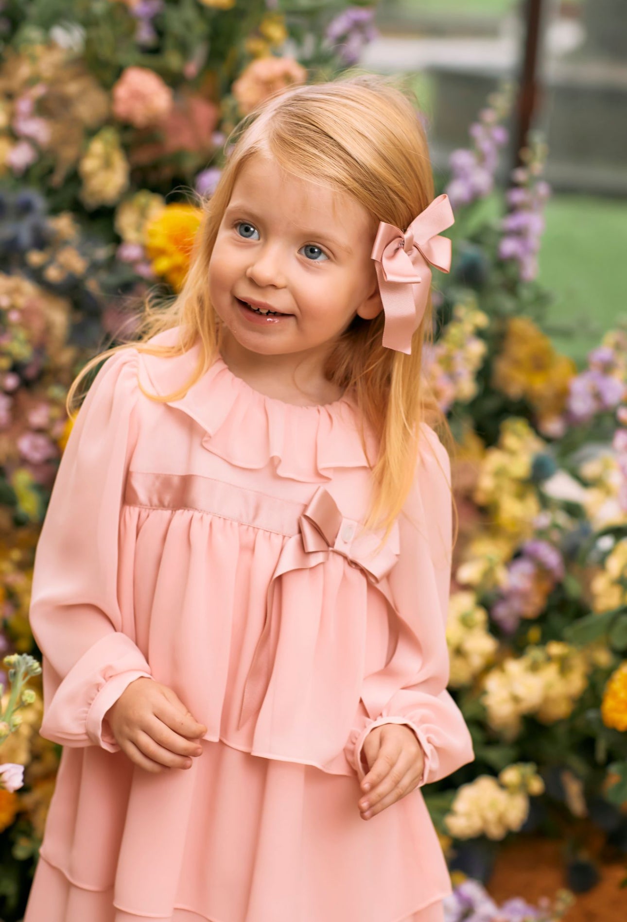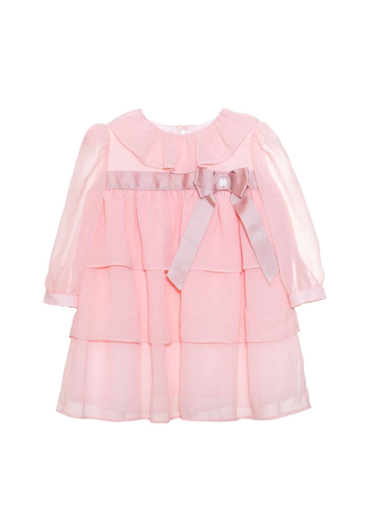 Beautiful Pink chiffon dress with ruffle and Bow details.Beautiful,Classic and Feminine design that doesn't go out of style.