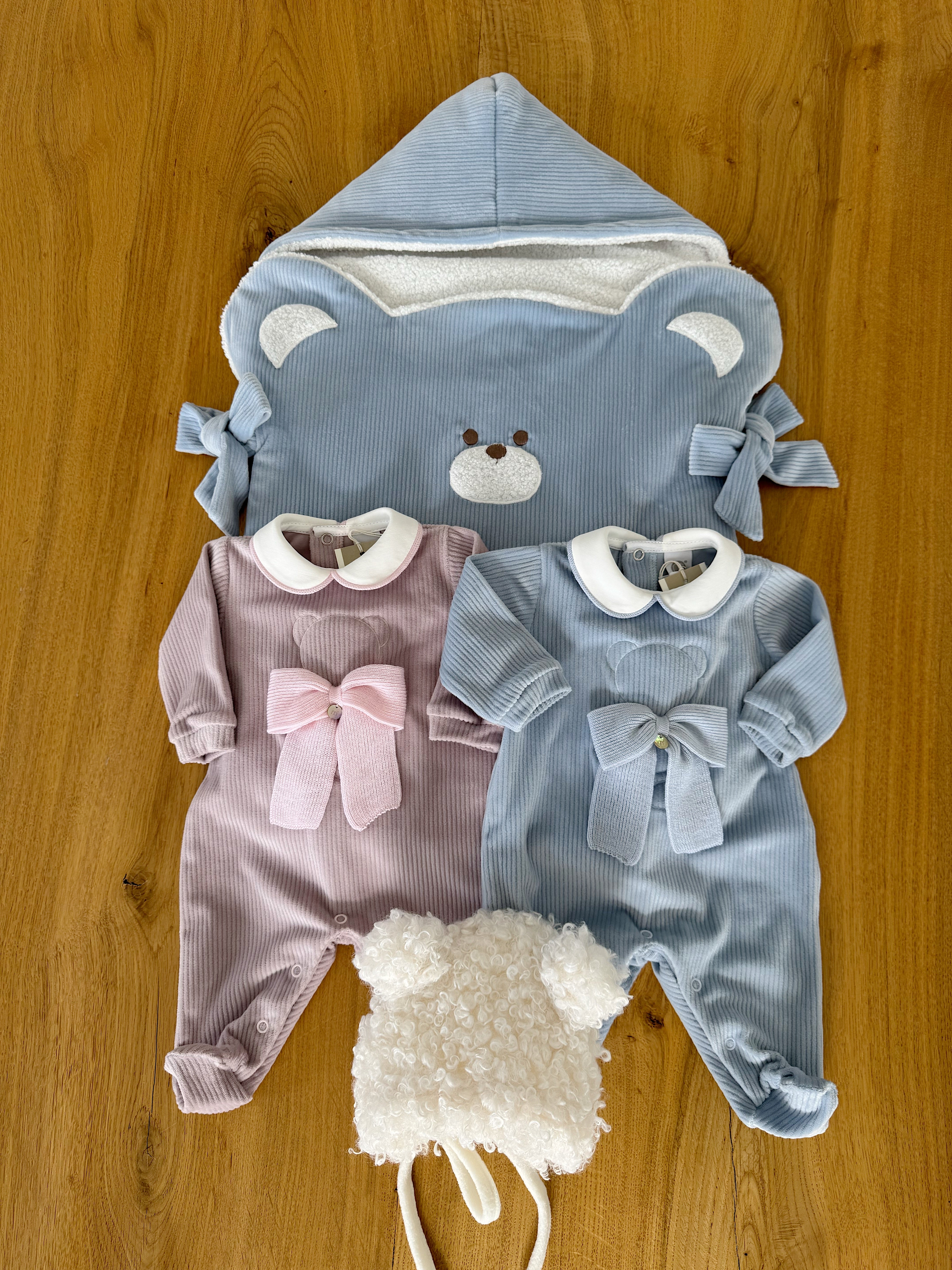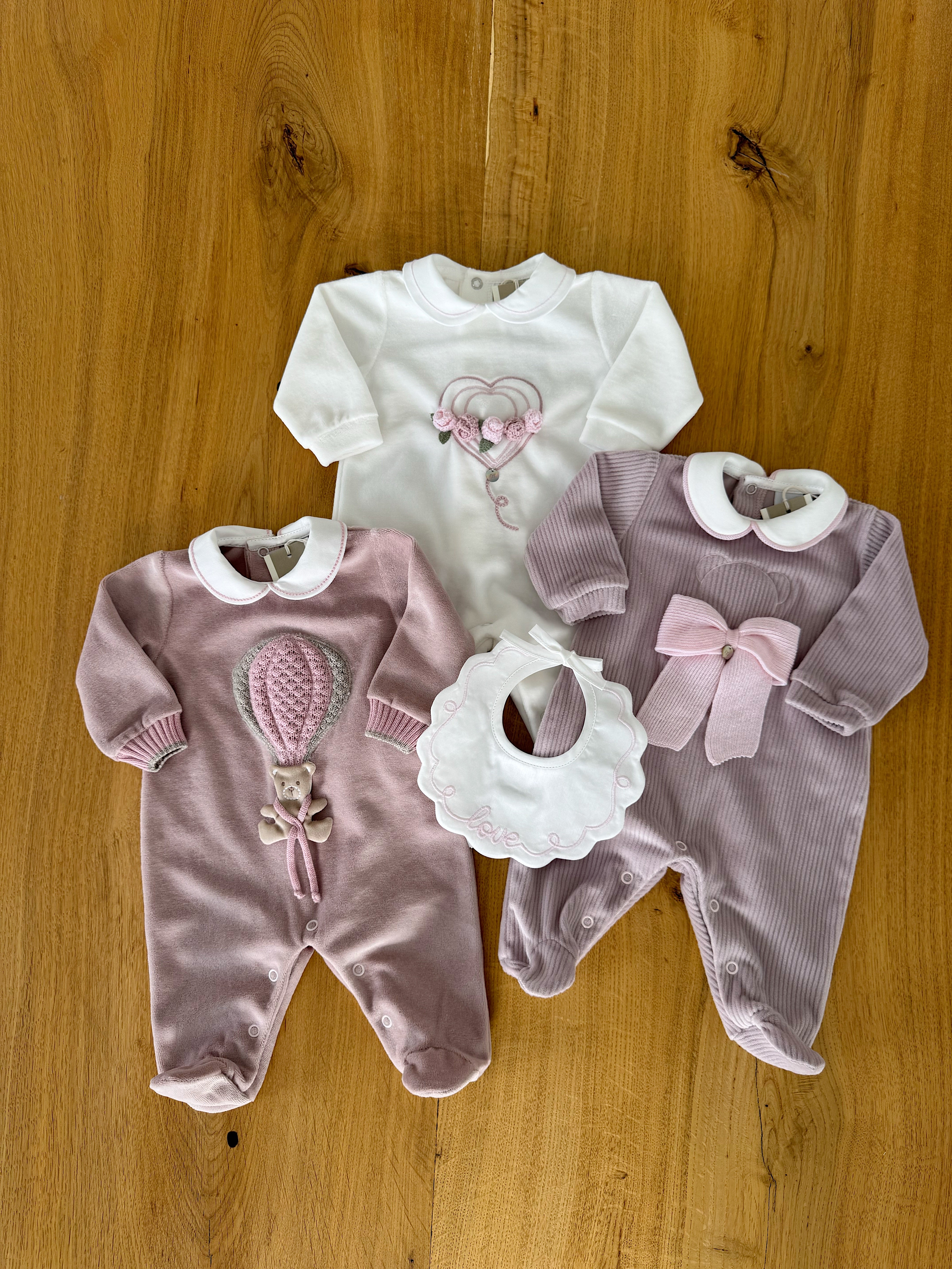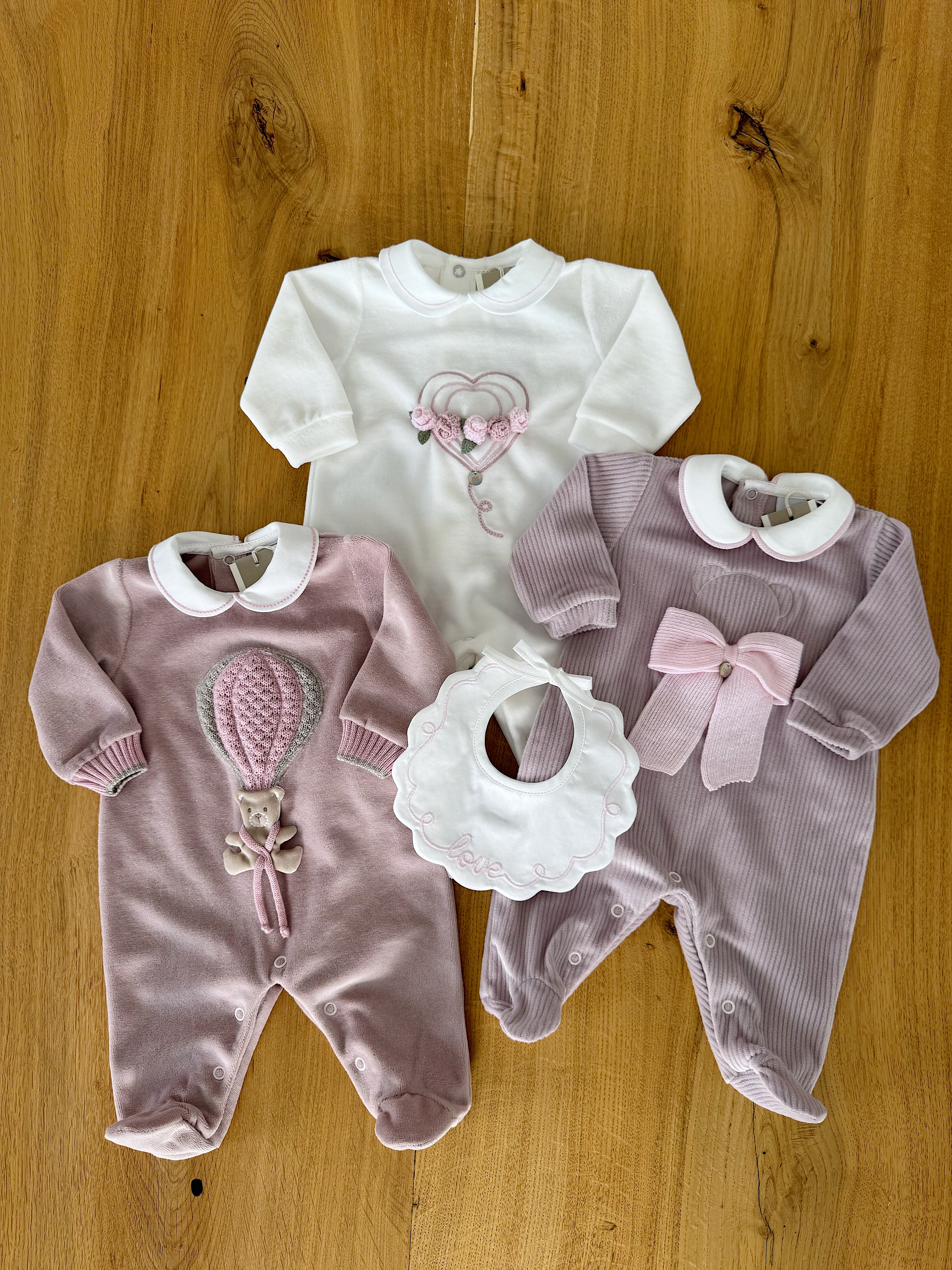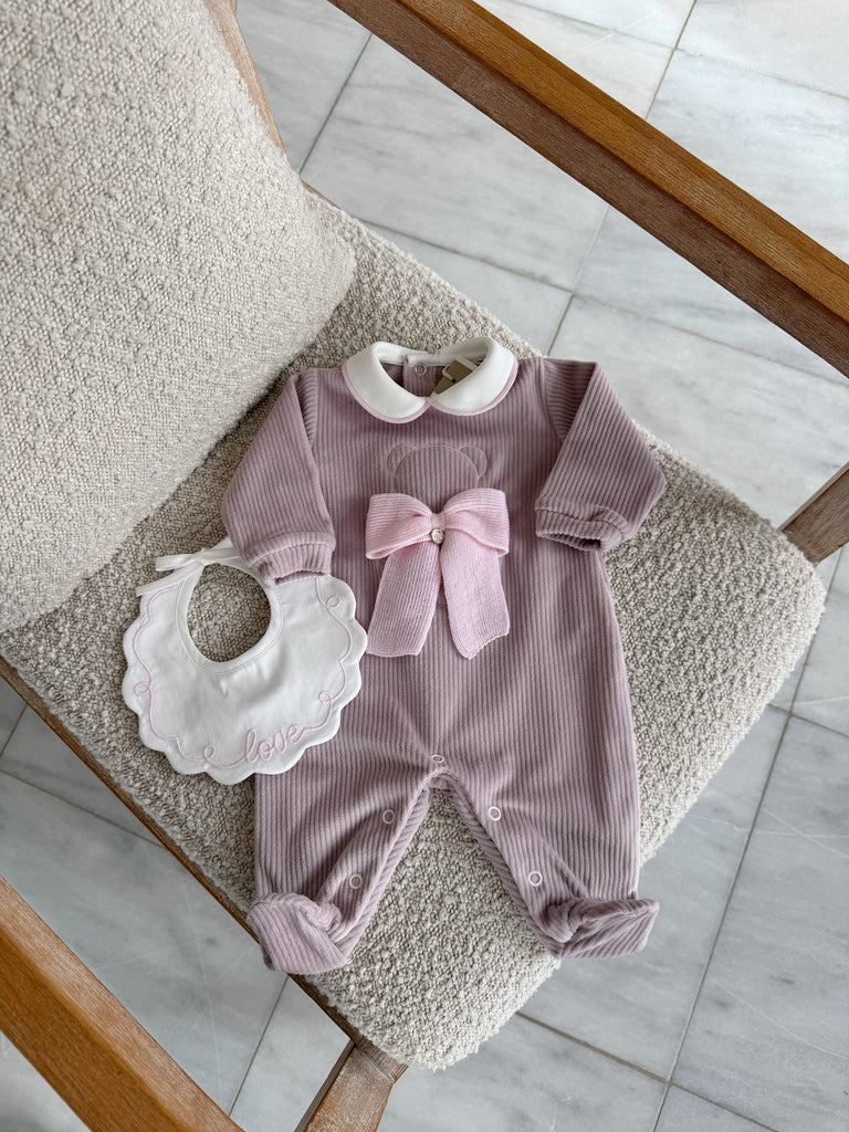 Beautiful Pink Velure Baby grow with Bear and Bow details.