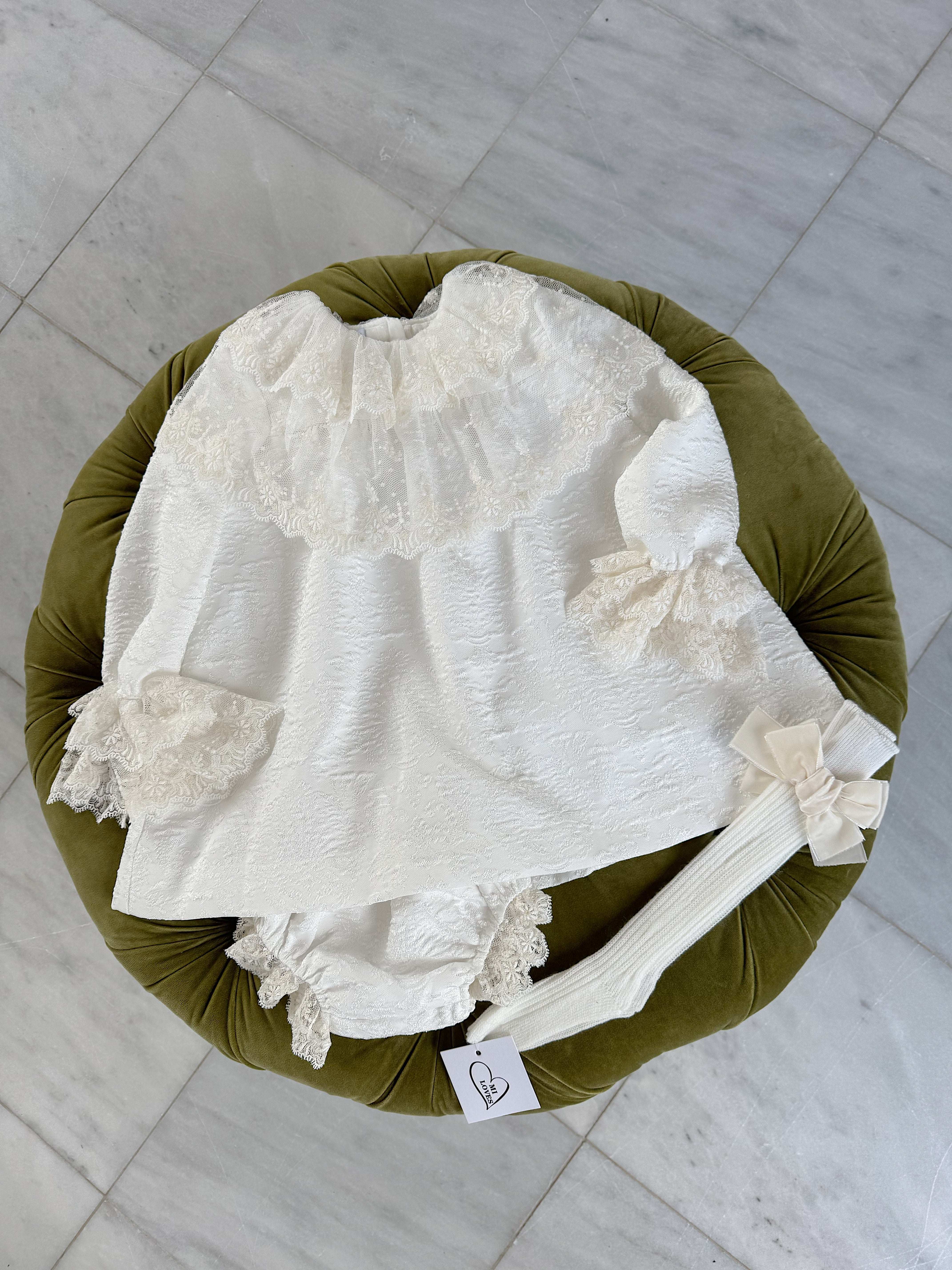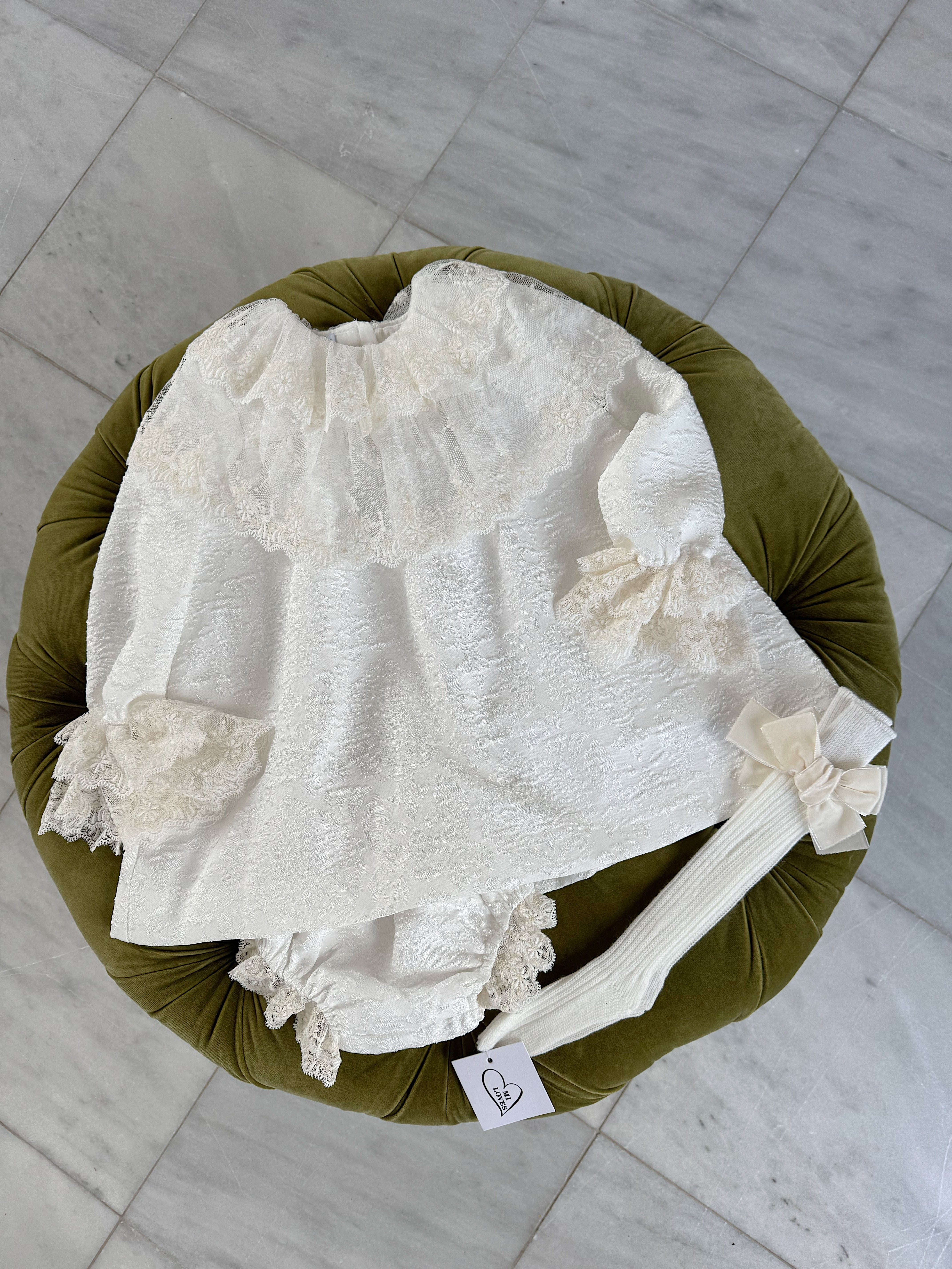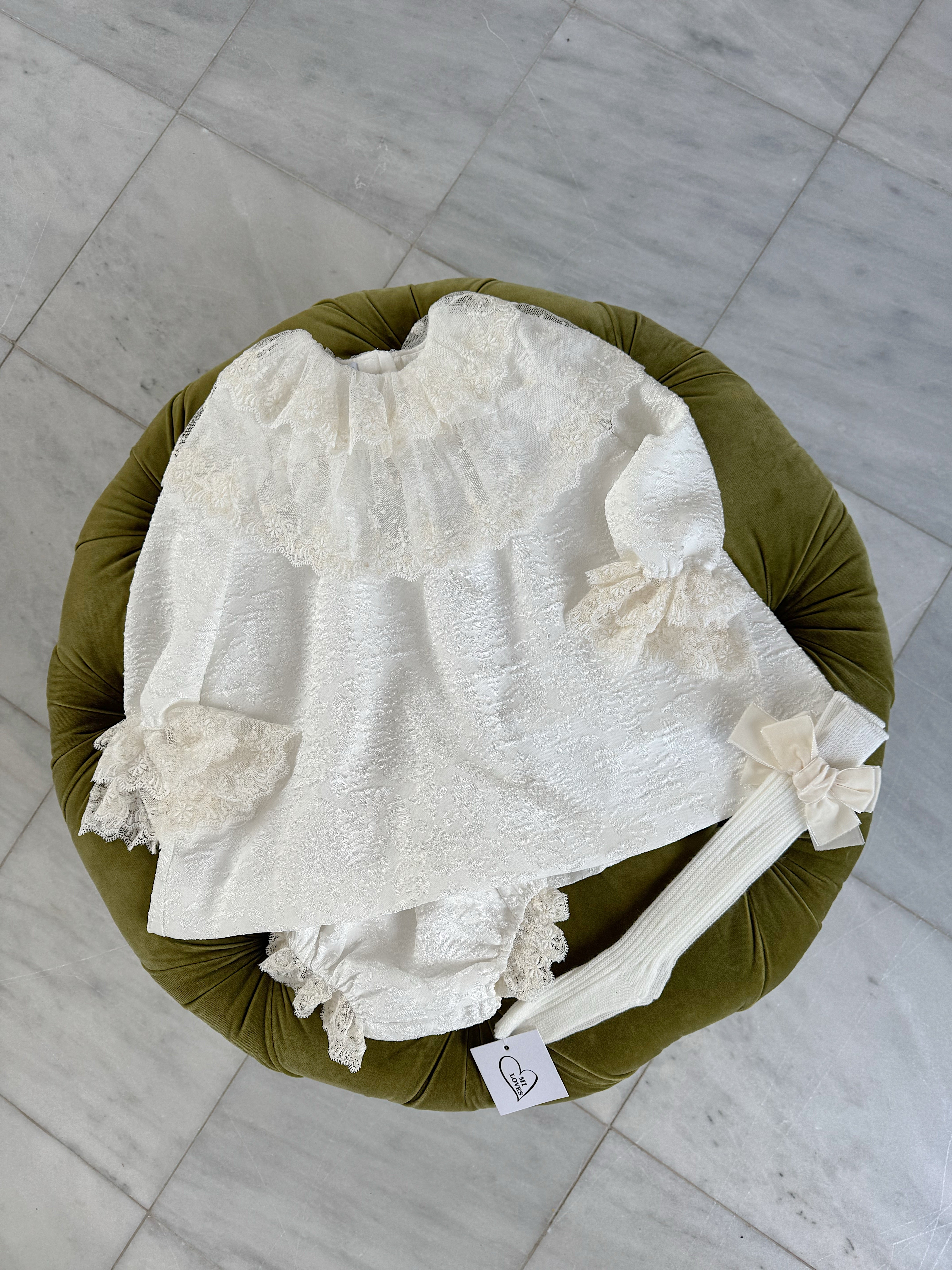 Beautiful White Dress/Bloomers set with Lace collar details.