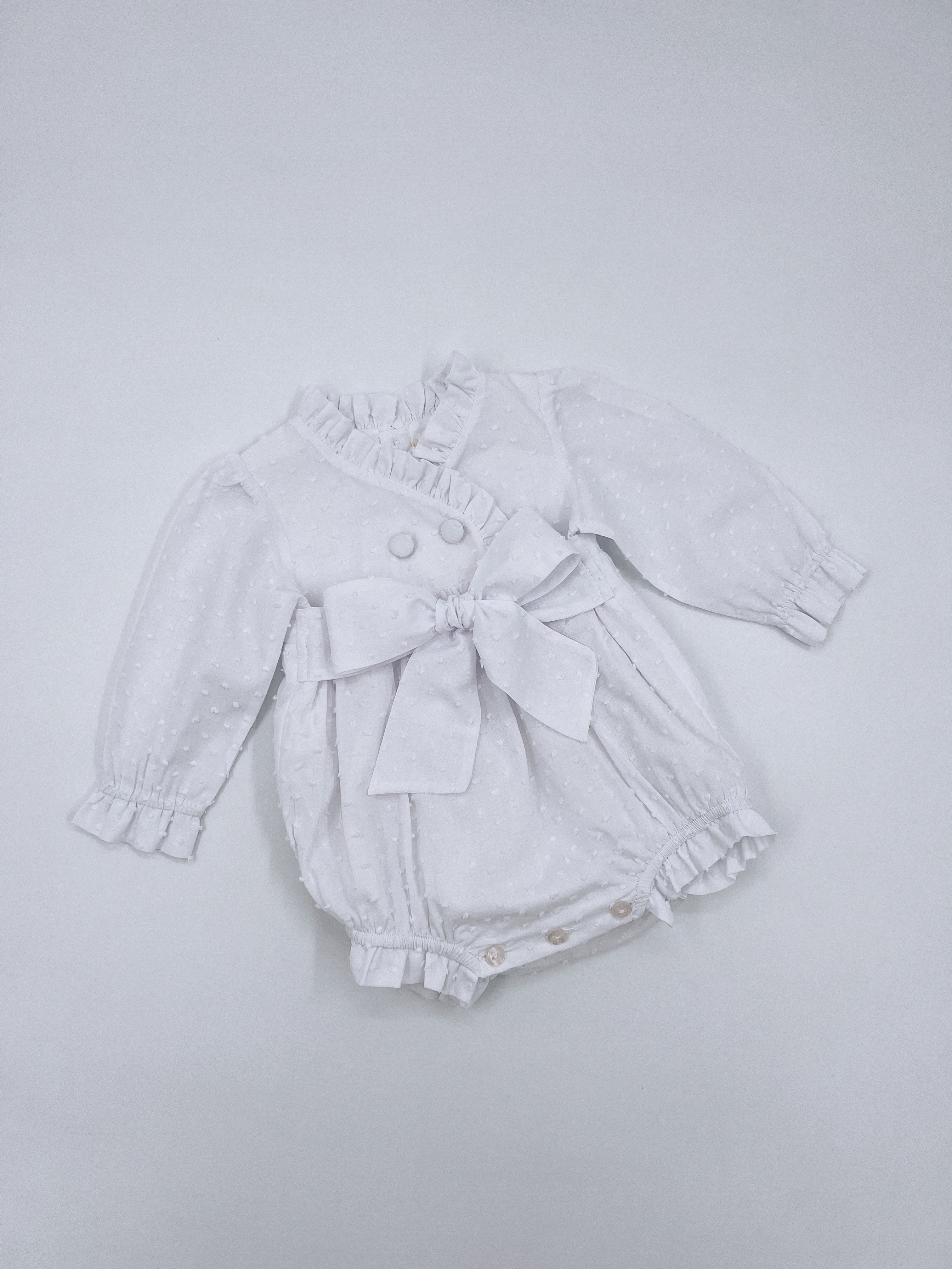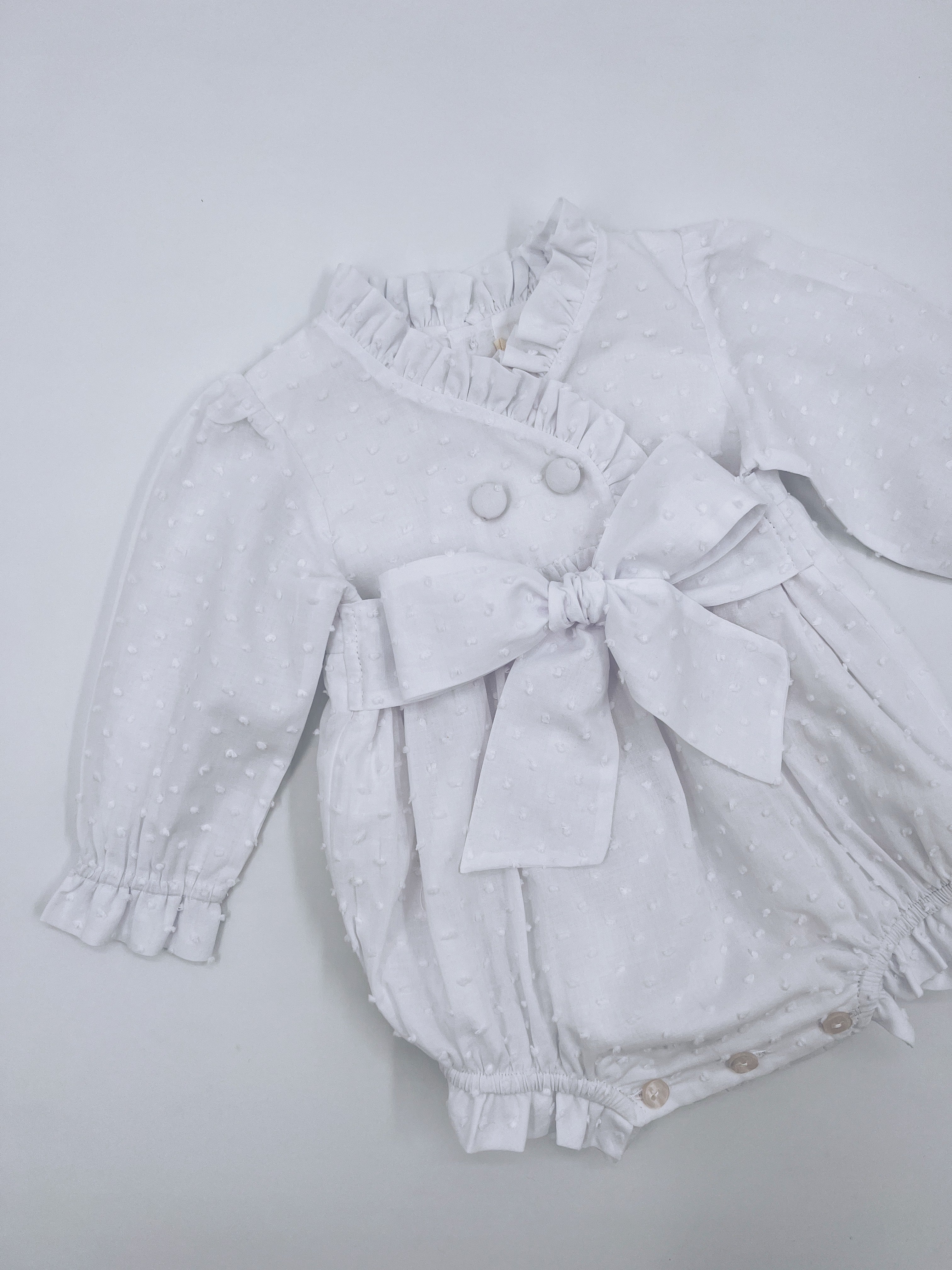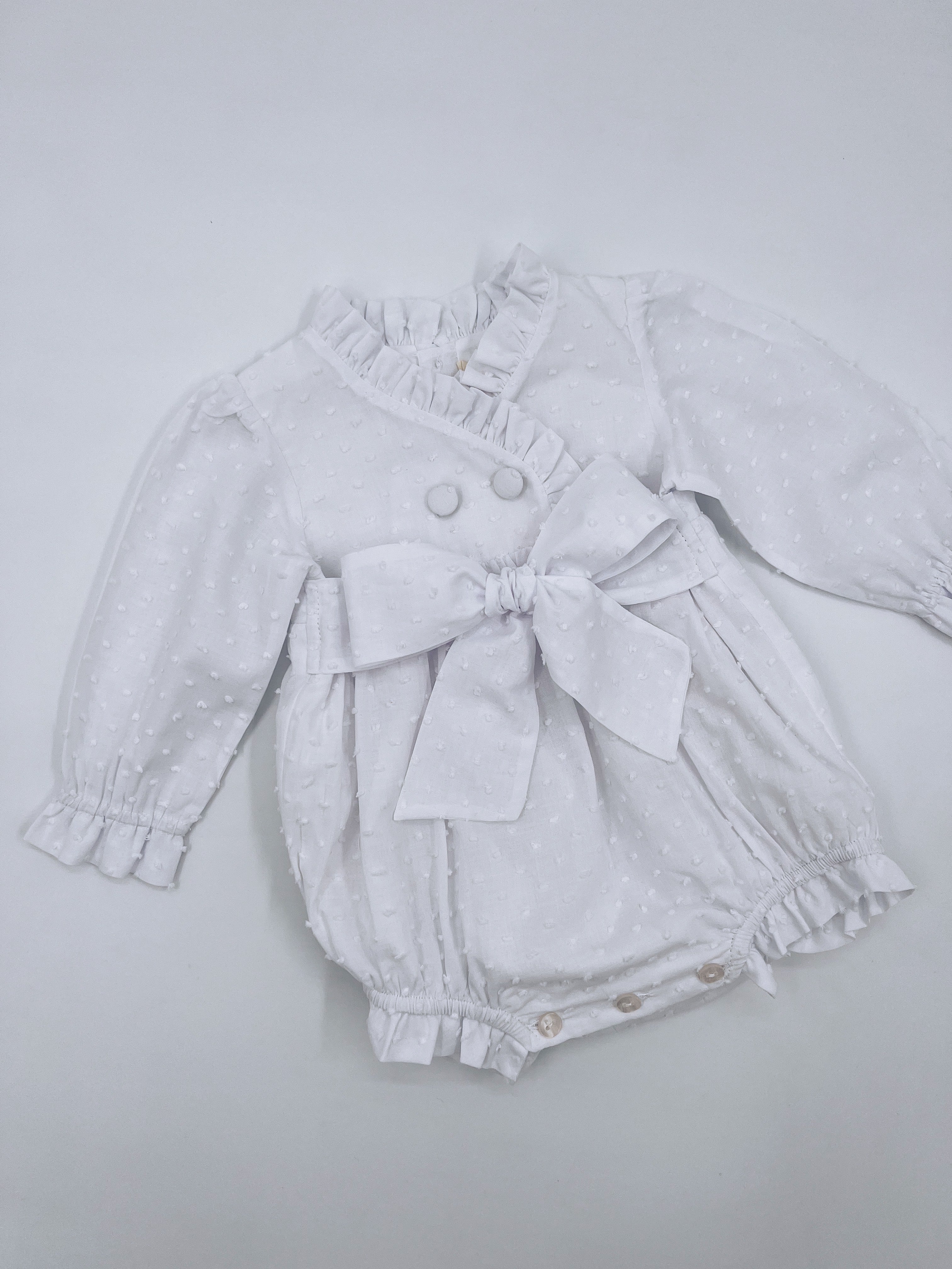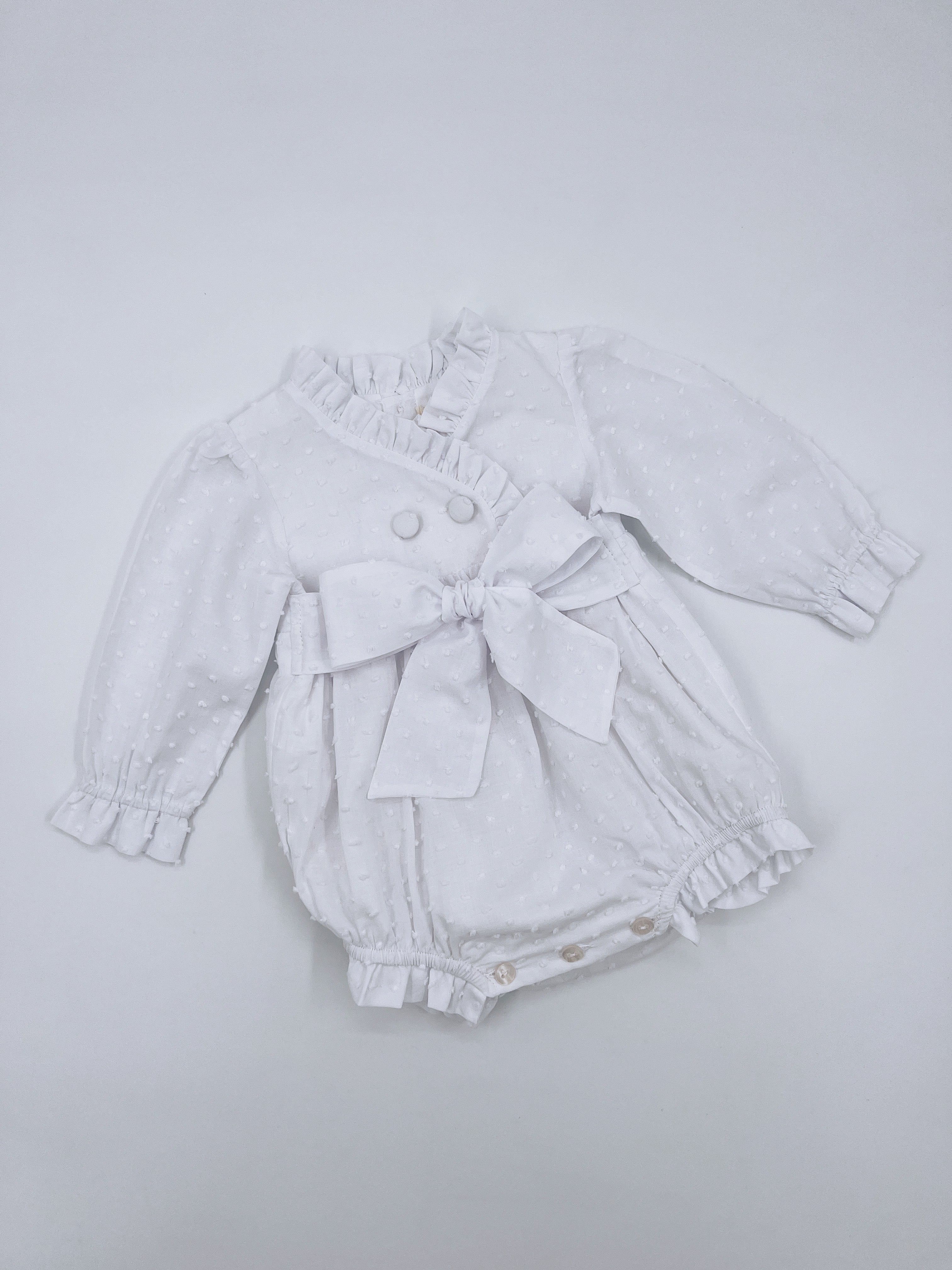 Beautiful White Plumetti Romper with Lovely Bow details.