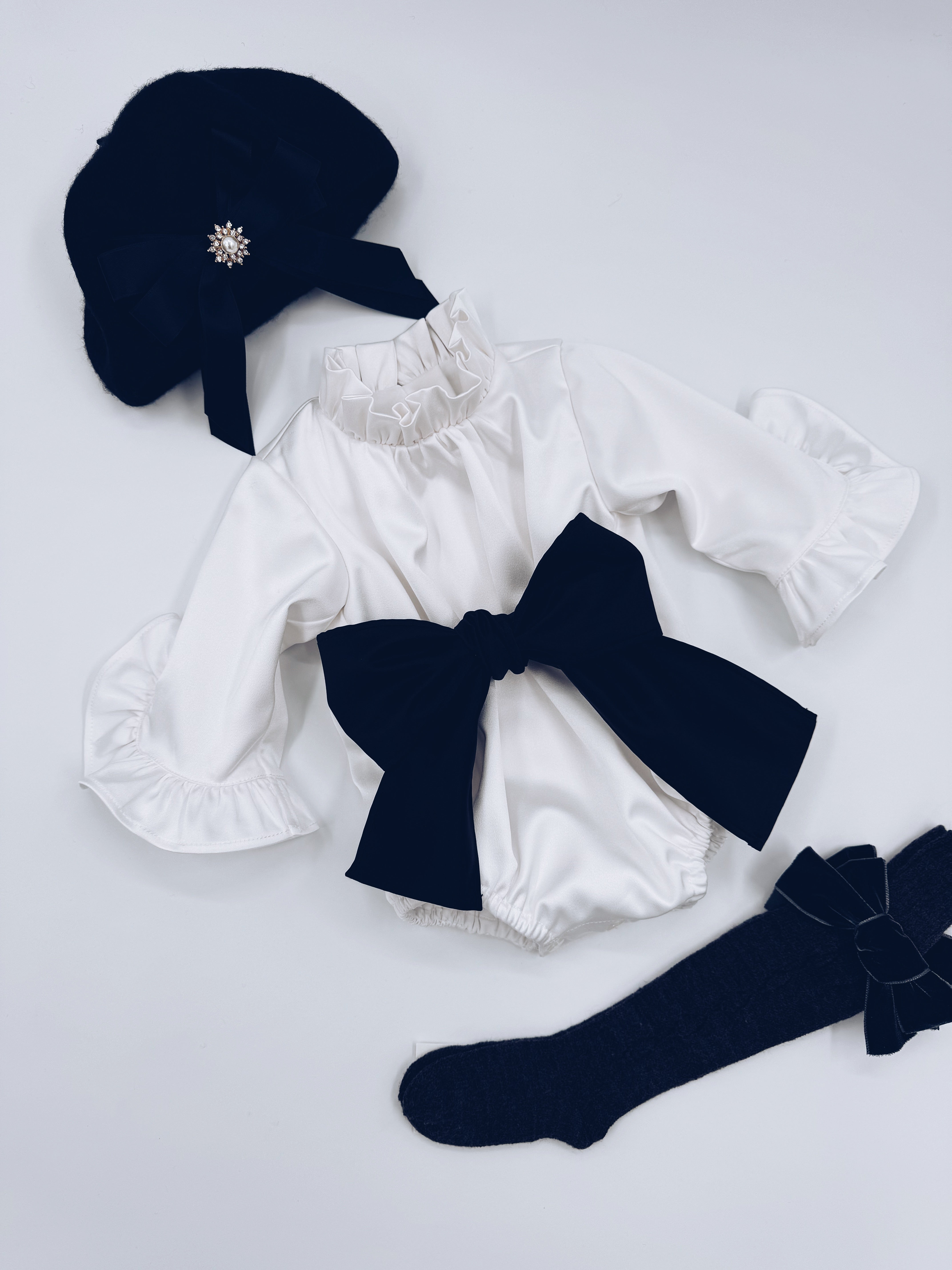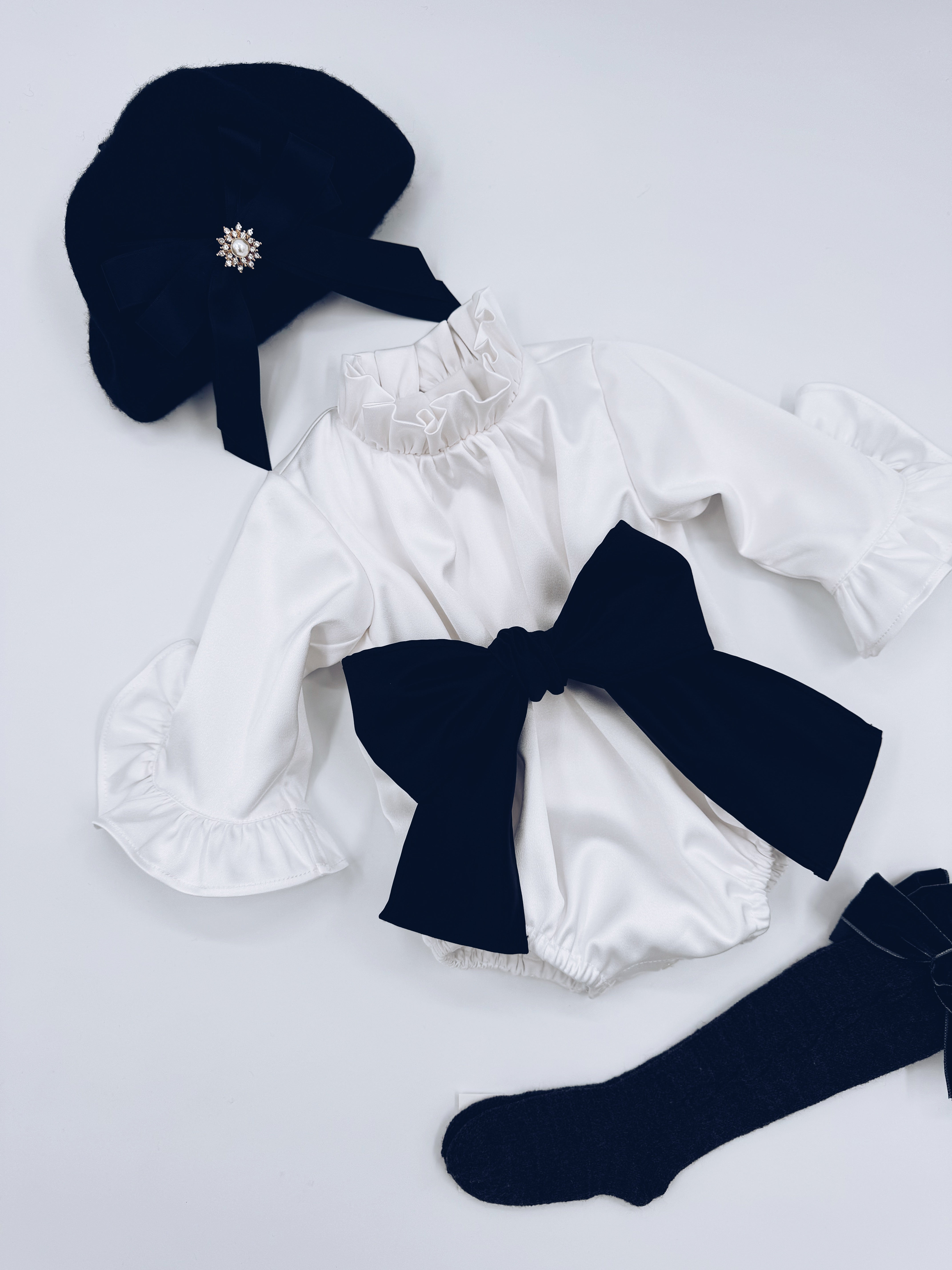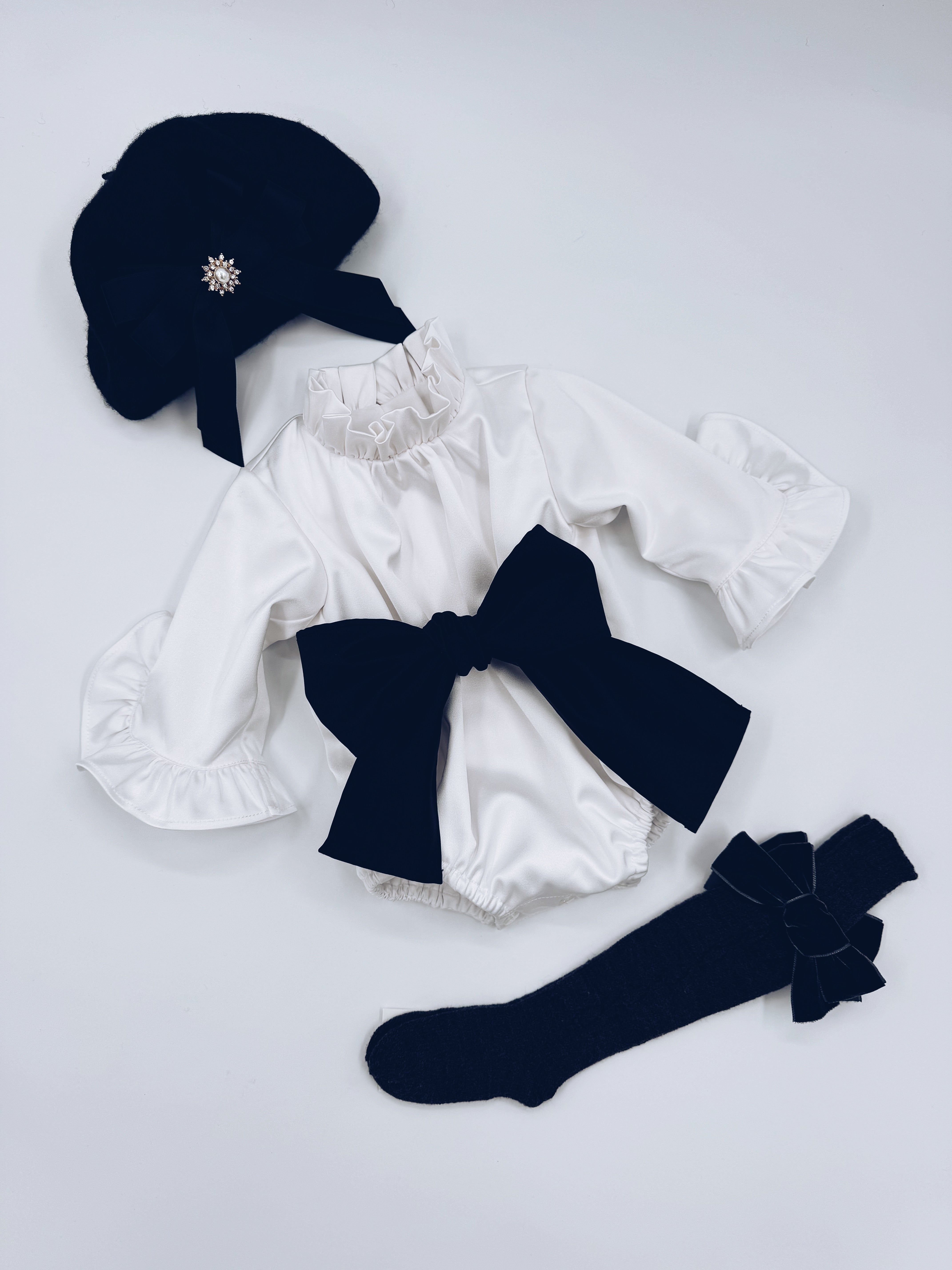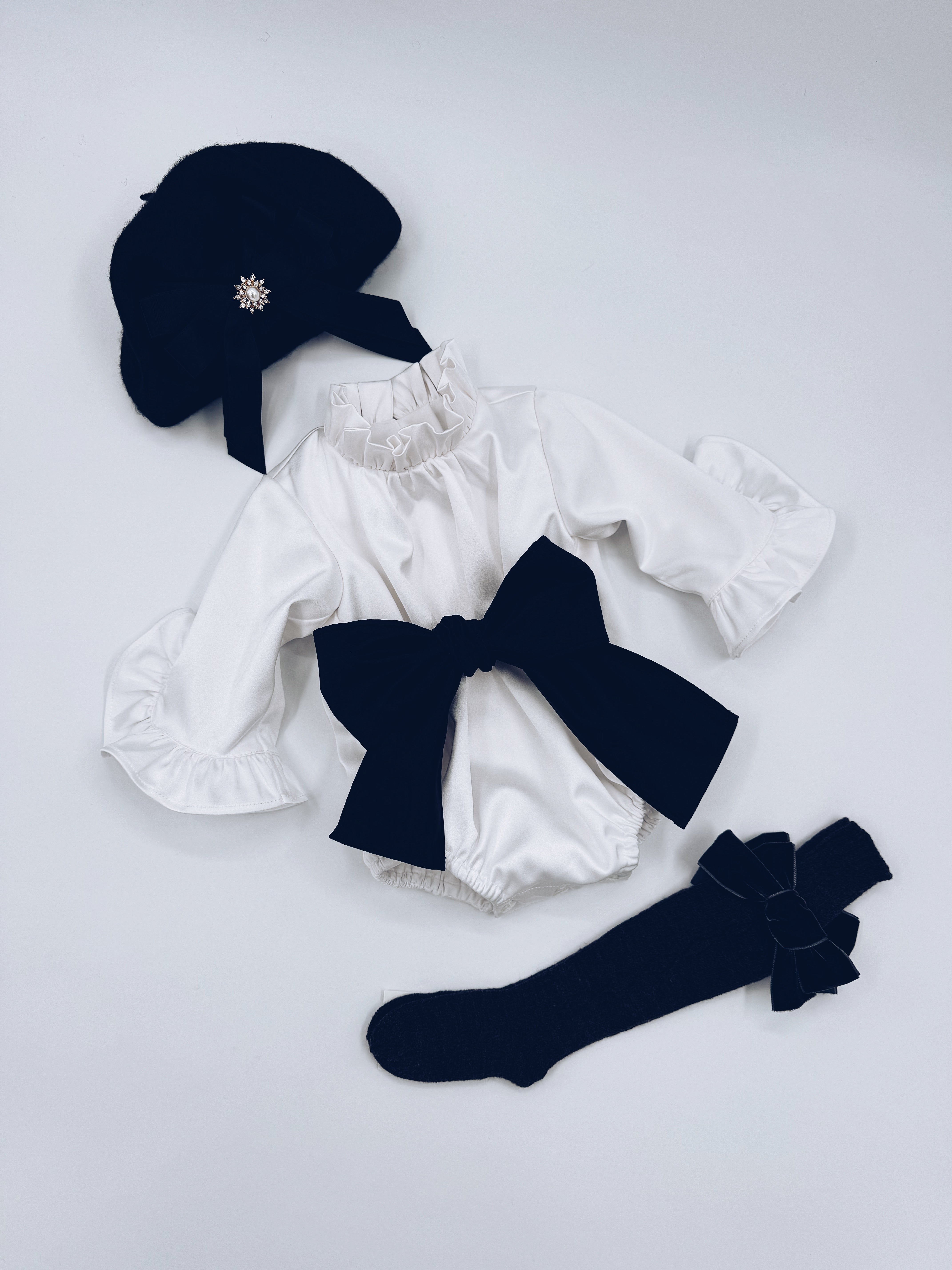 Beautiful WHITE Romper with Frill and Black statement bow details.