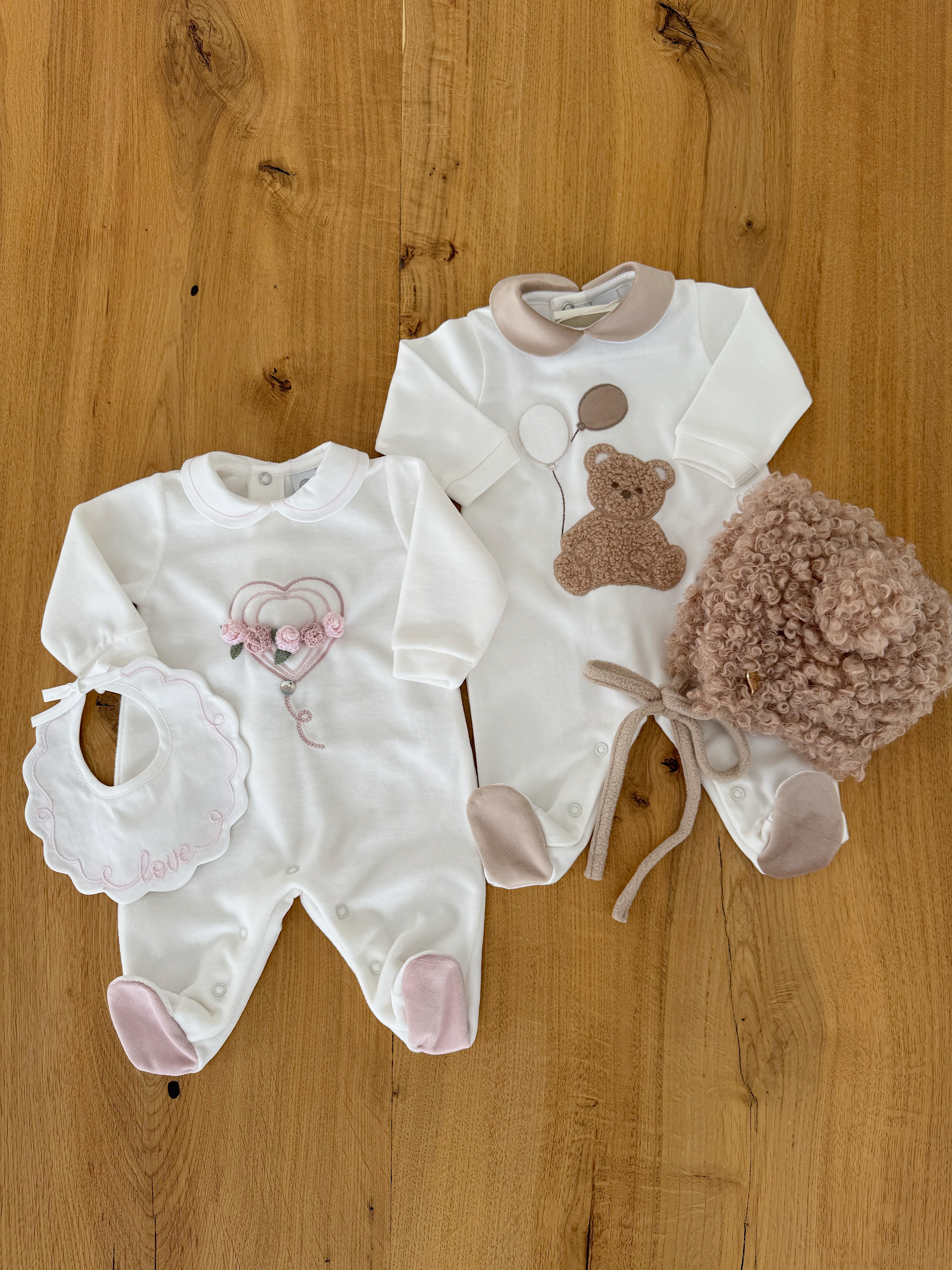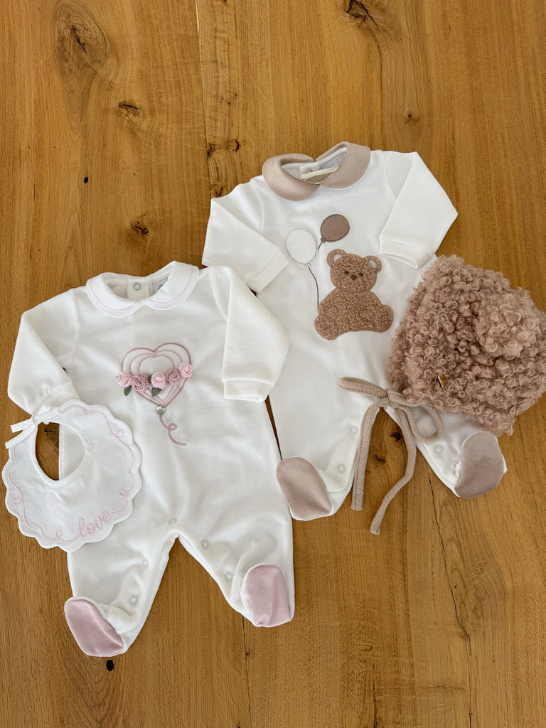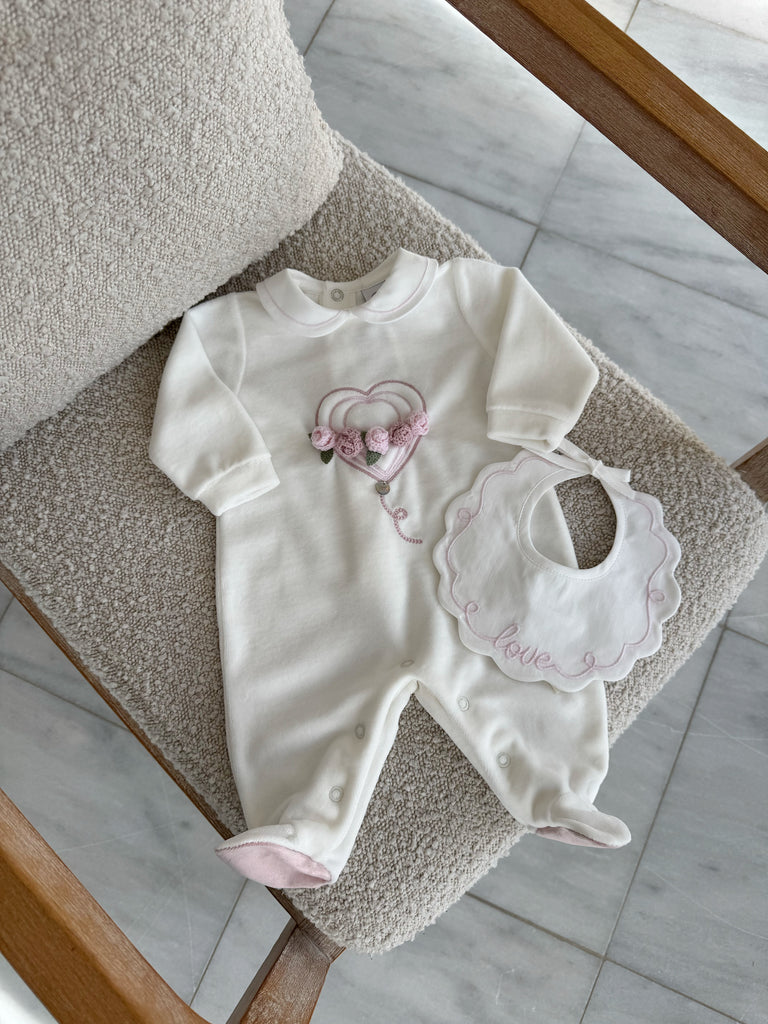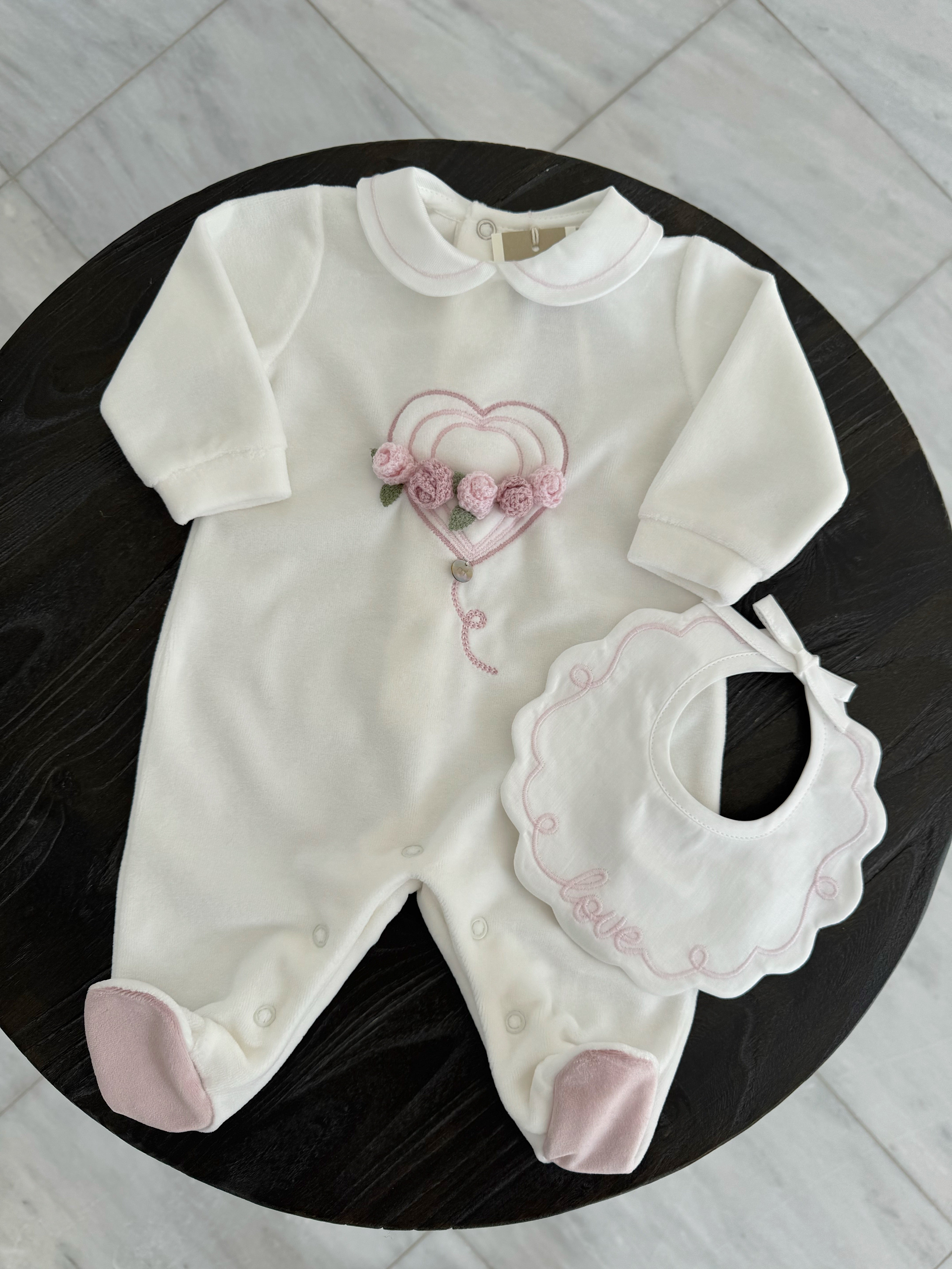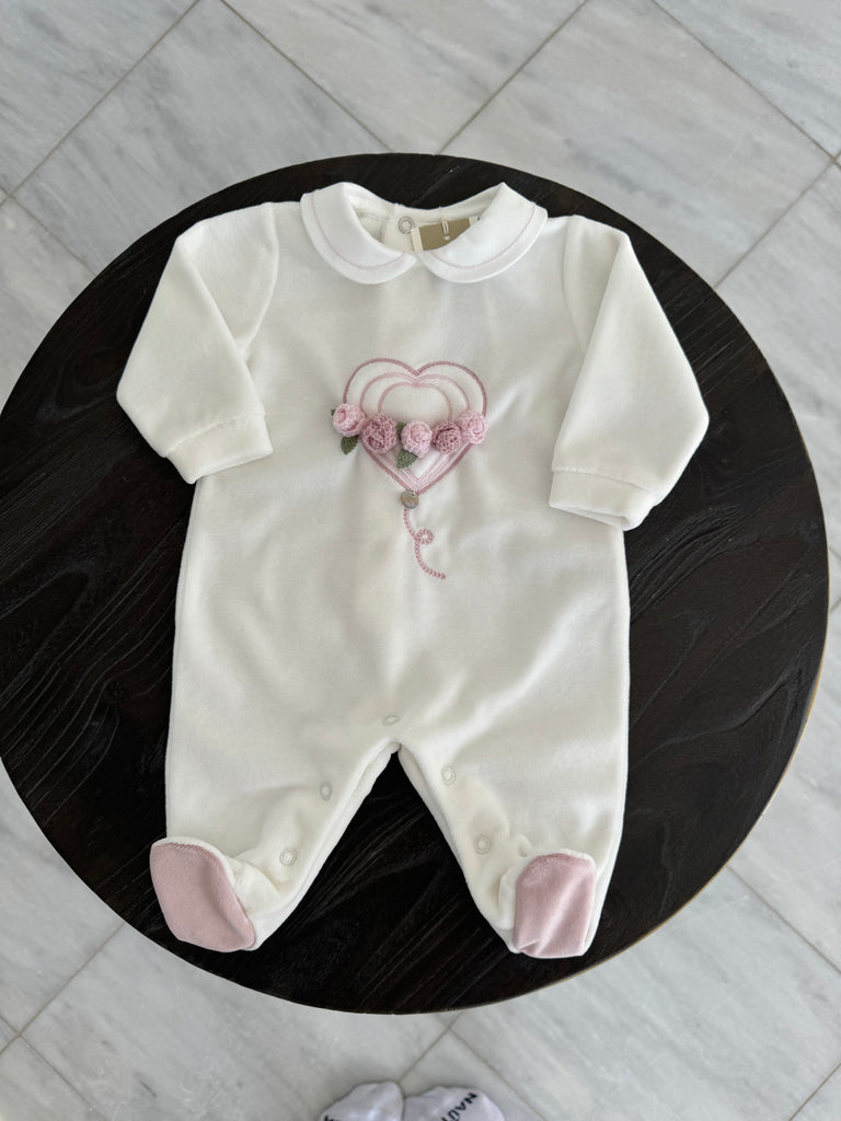 Beautiful White Velure Baby grow with Floral details.