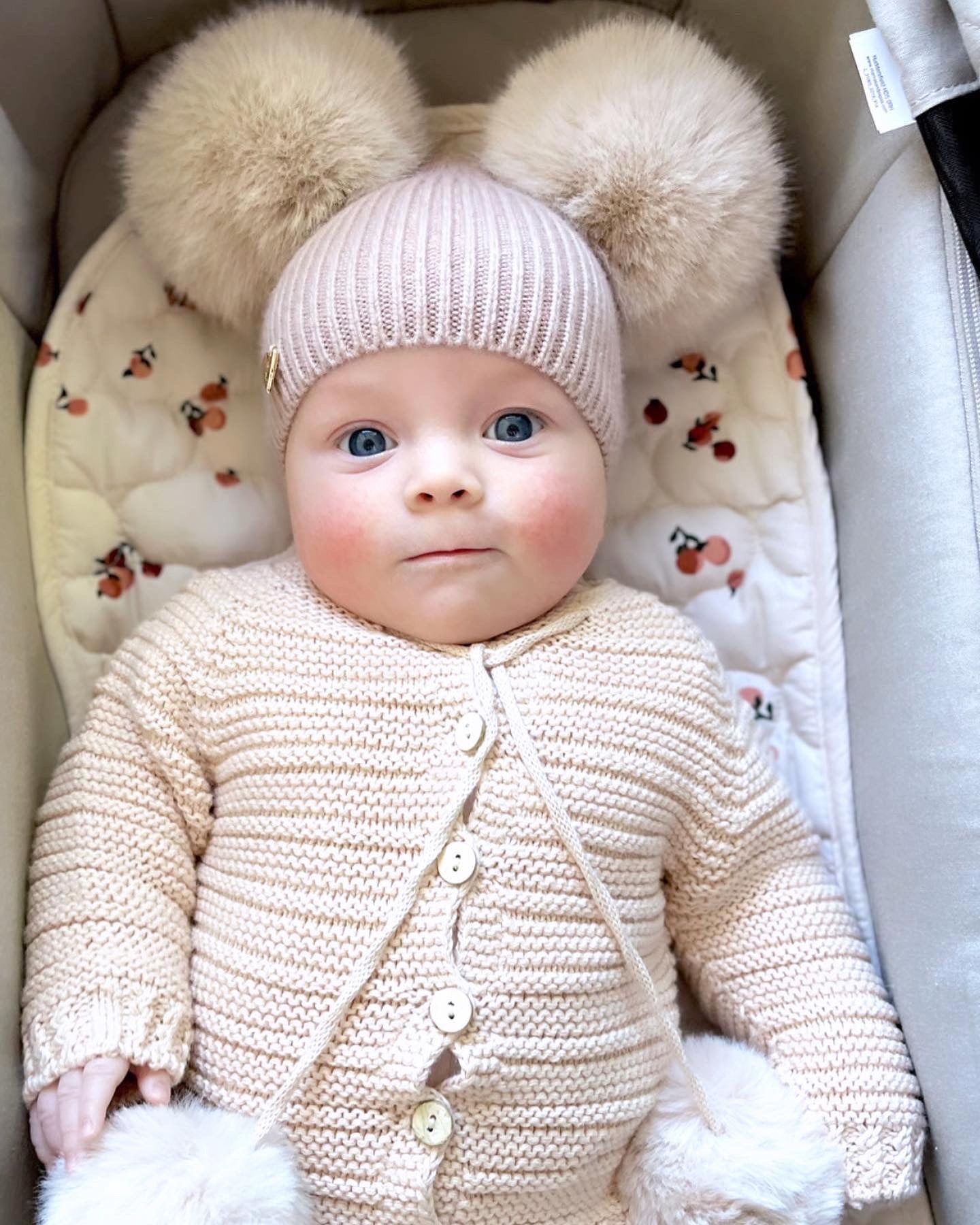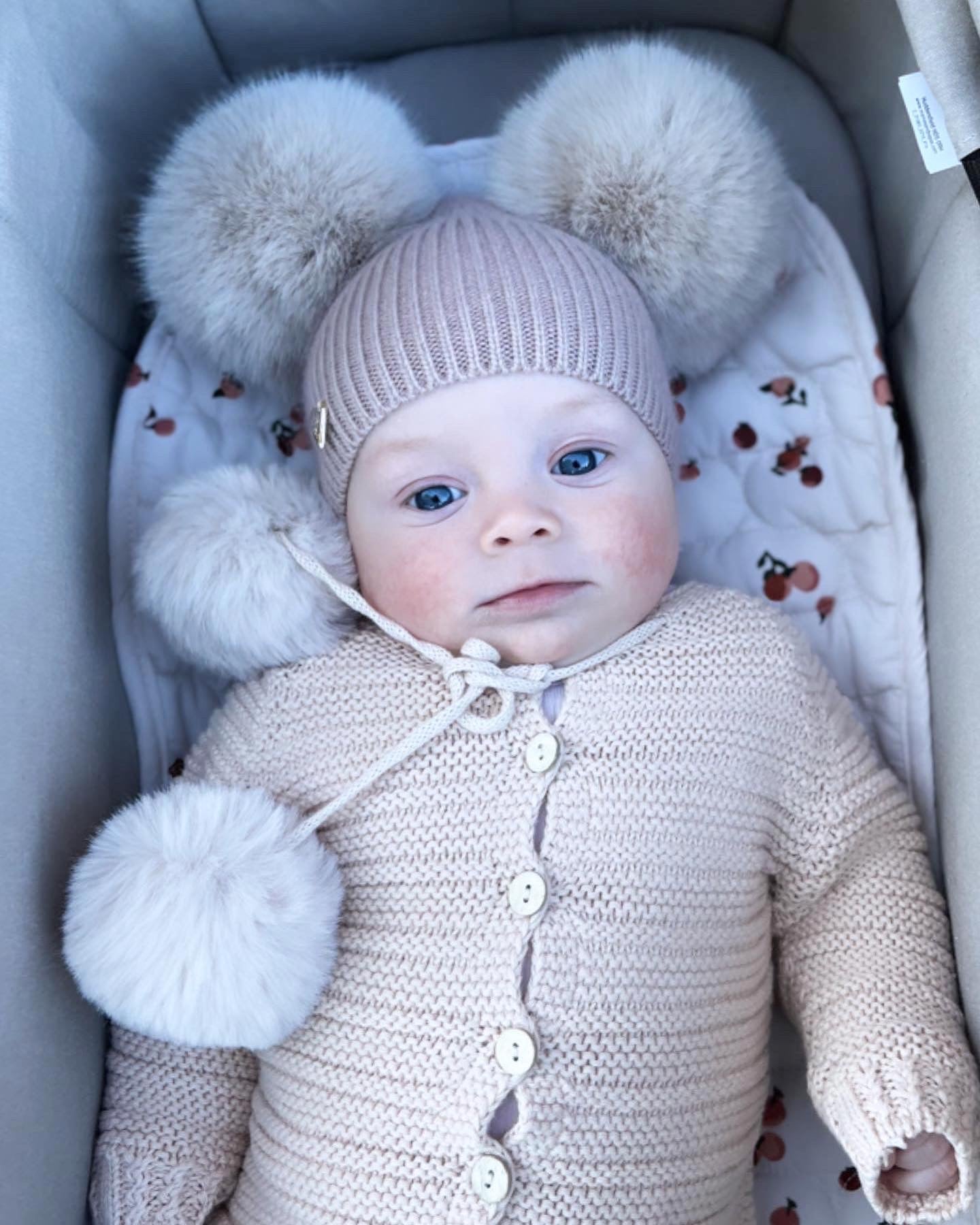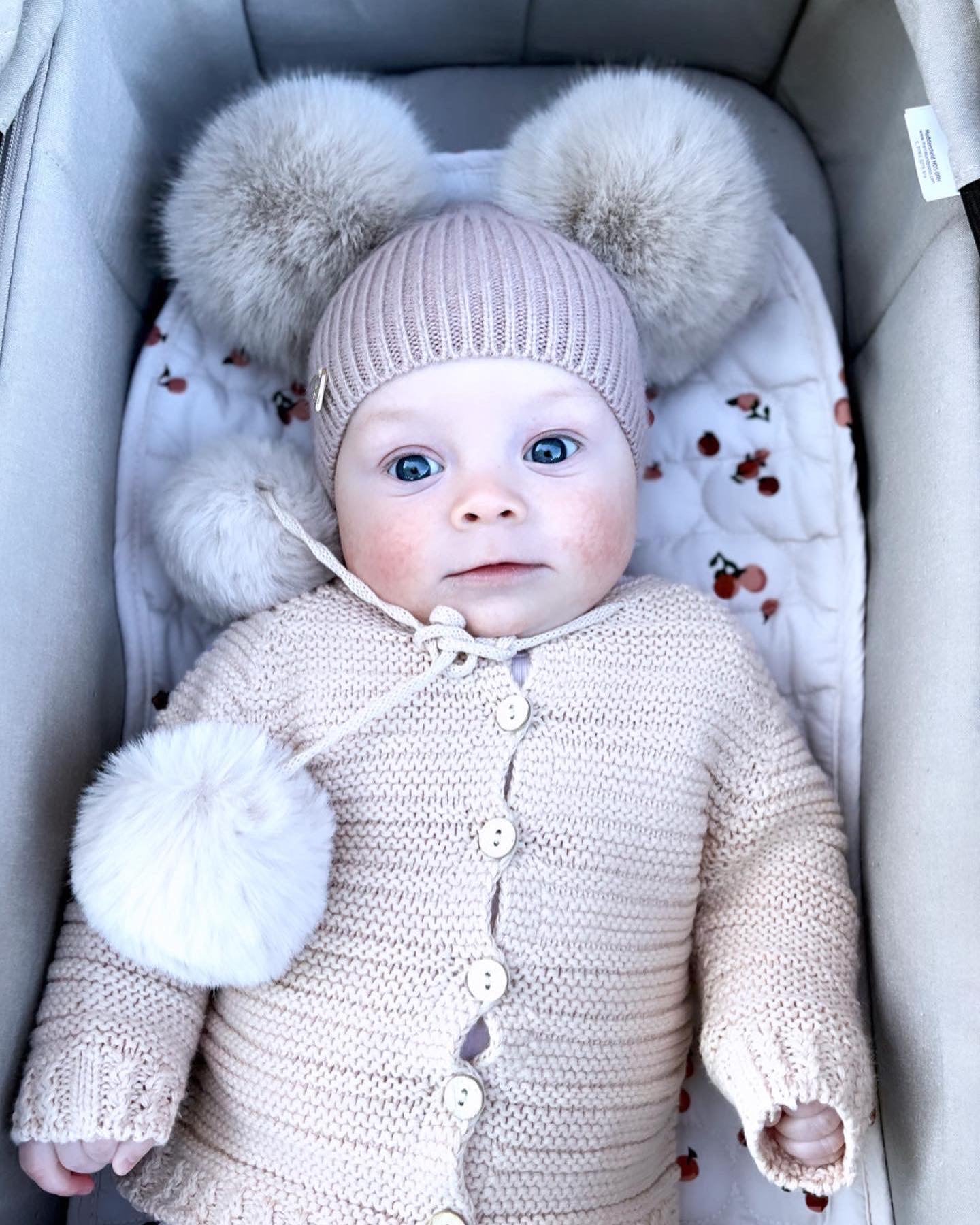 Light Beige knitted pompom 3 piece set(Cardigan,bodysuit,trousers)