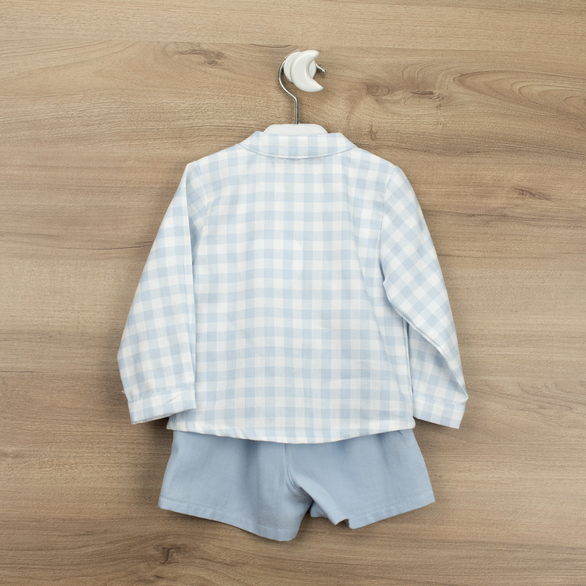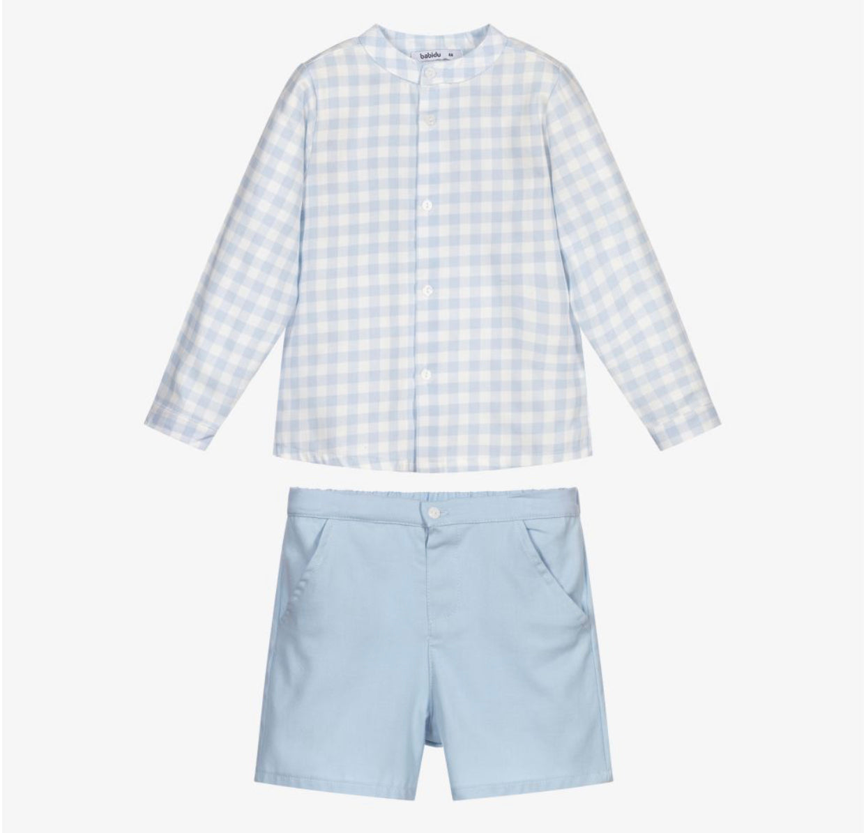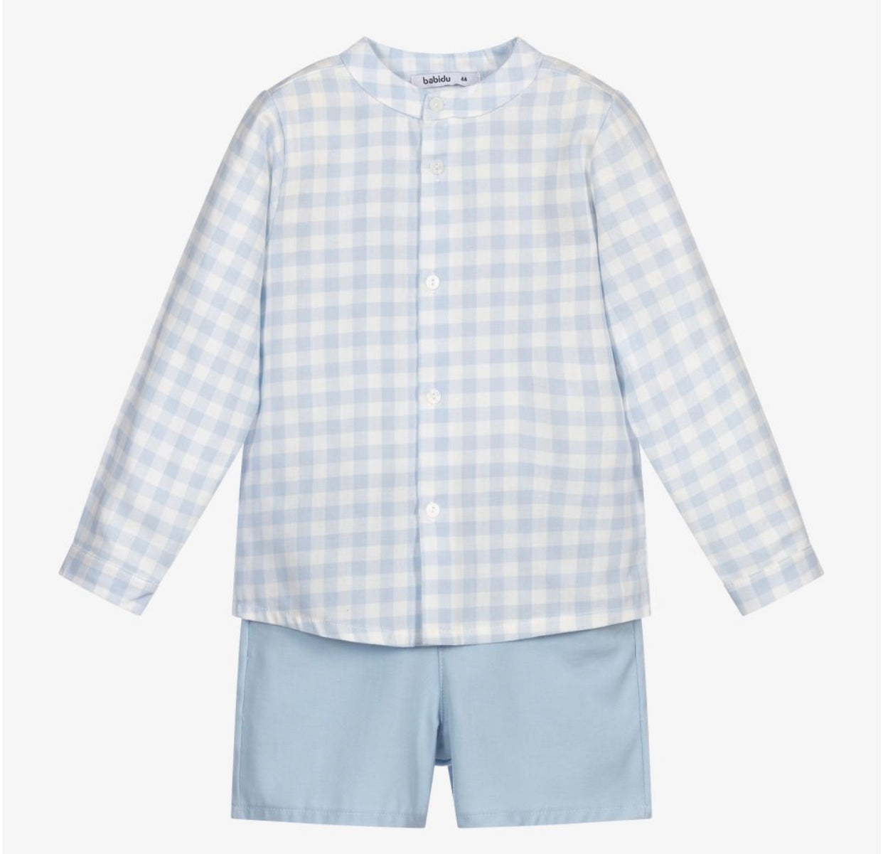 Pale blue shorts and shirt set for boys by Babidu, made in lightweight cotton twill. The shirt has a white and blue checked pattern and is in a collarless design. The shorts have a partly elasticated waistband, with slanted side pockets.