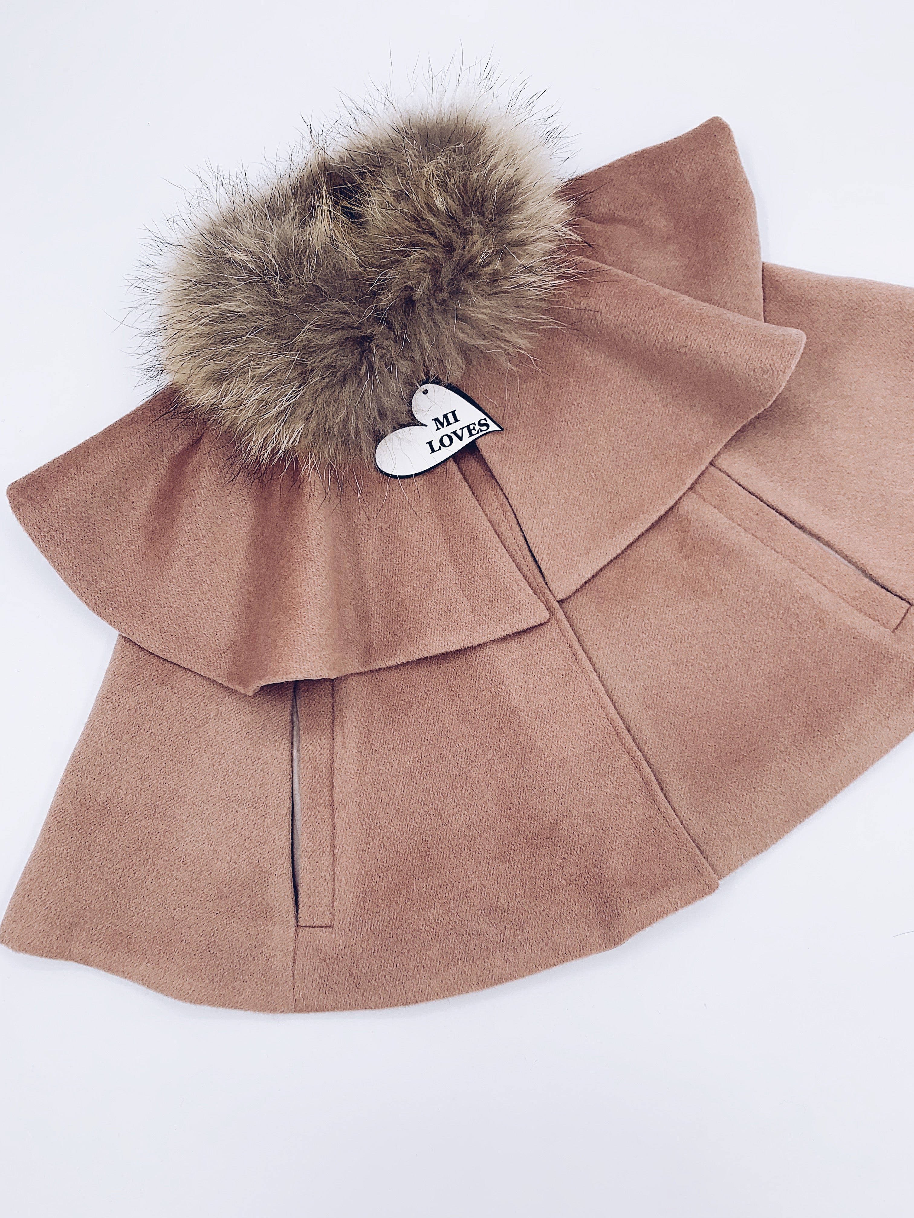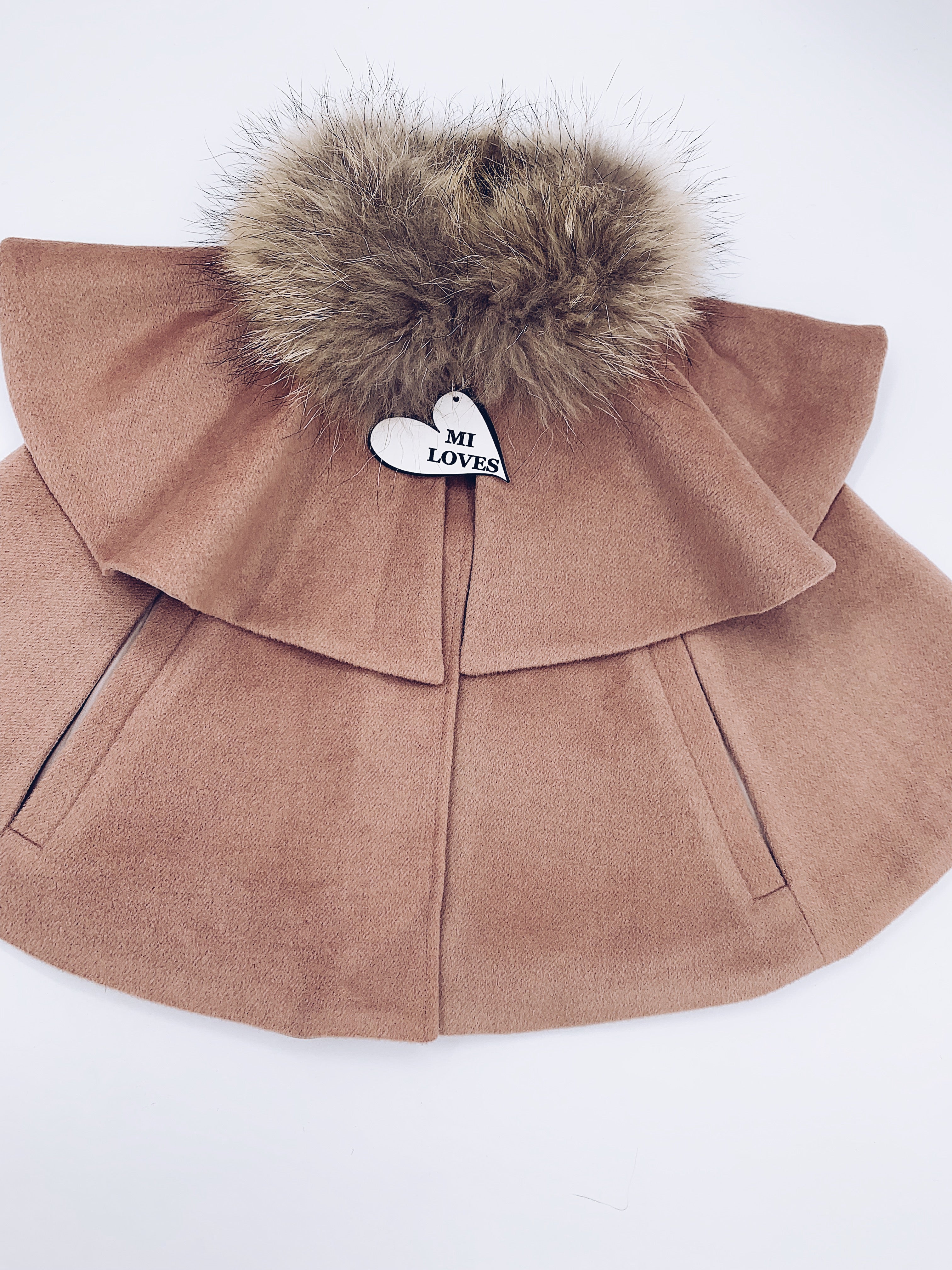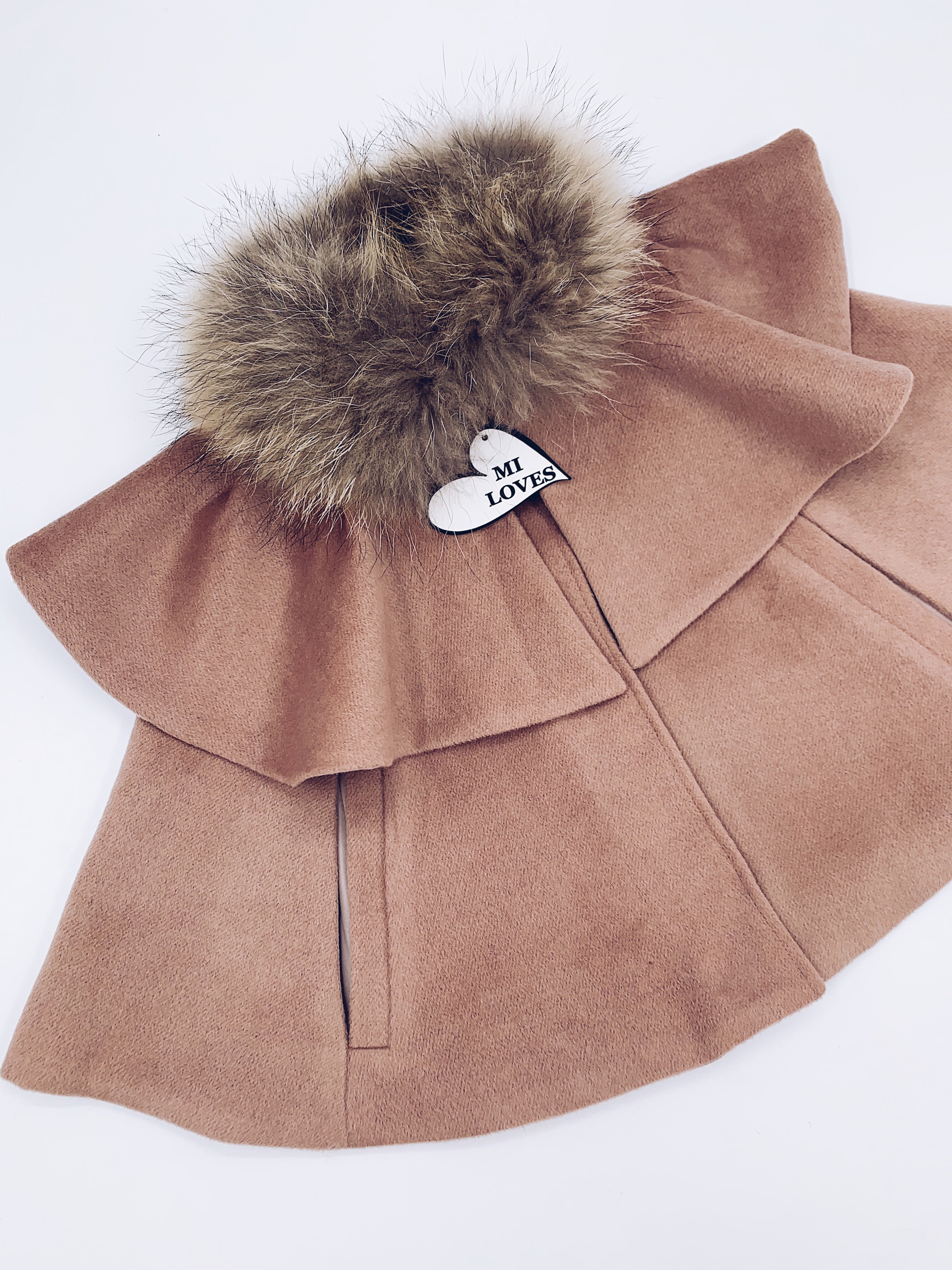 MI LOVES SIGNATURE LUXURIOUS CASHMERE CAPE WITH RACOON FUR TRIM in our Signature Cappuccino colour !!