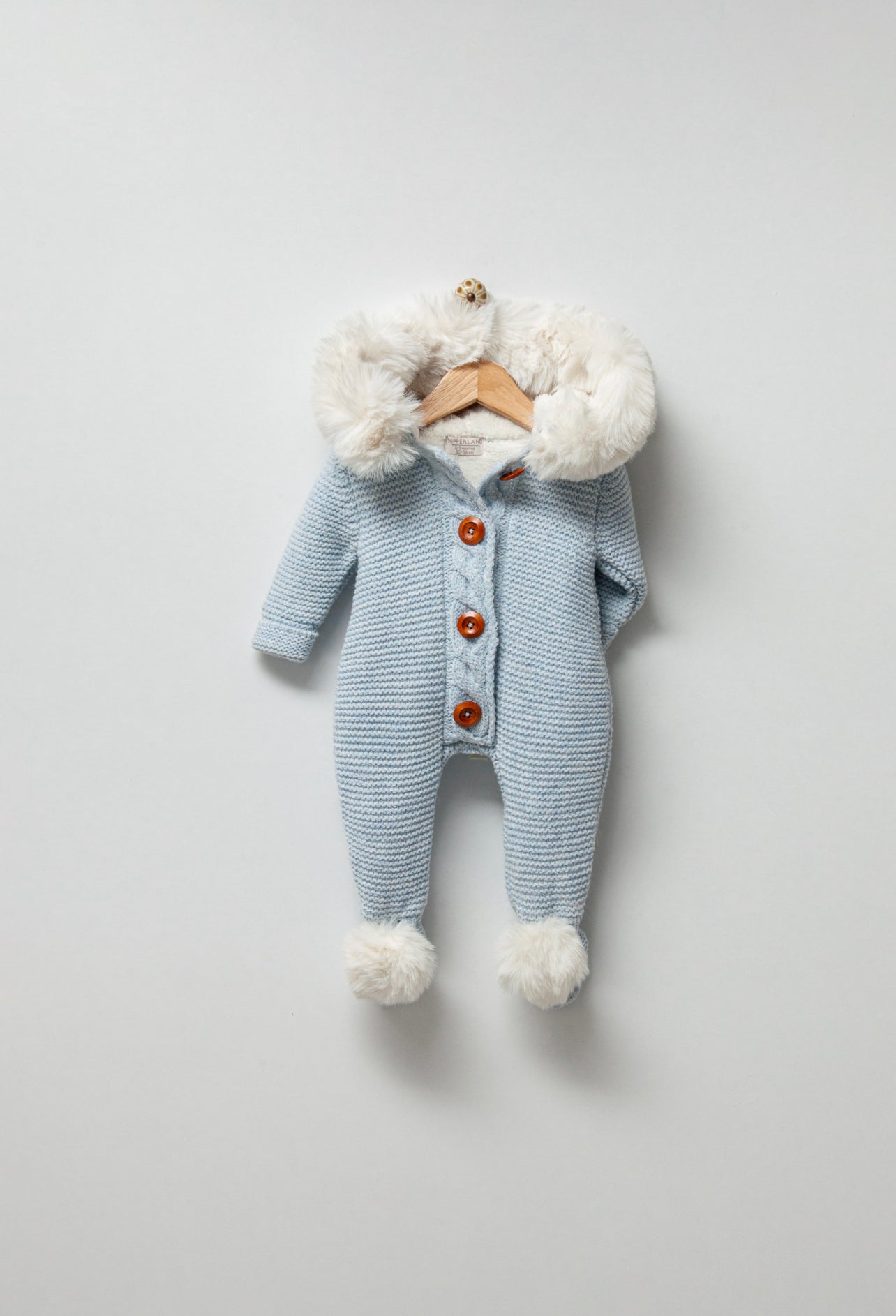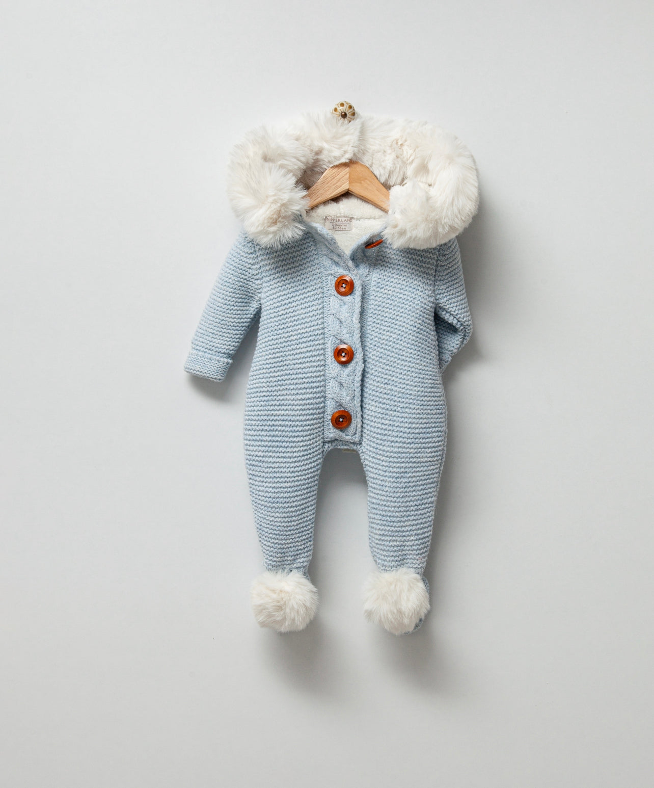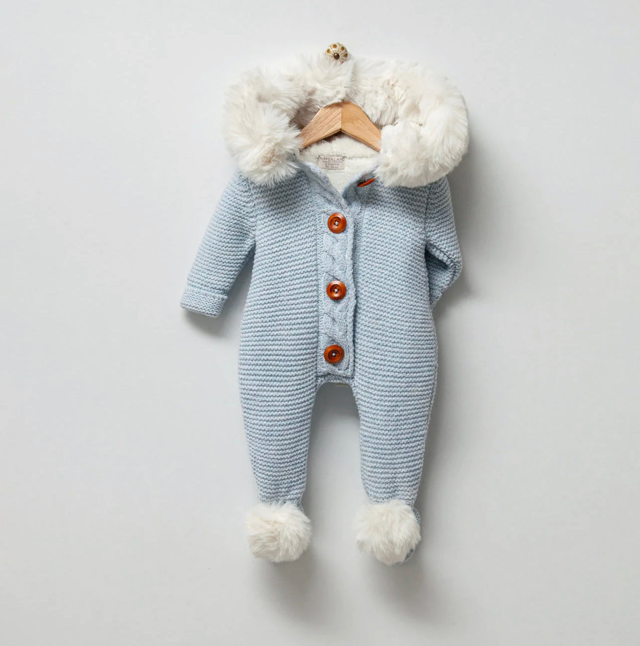 Blue Knitted Pramsuit with White Synthetic fur trim/pompoms.