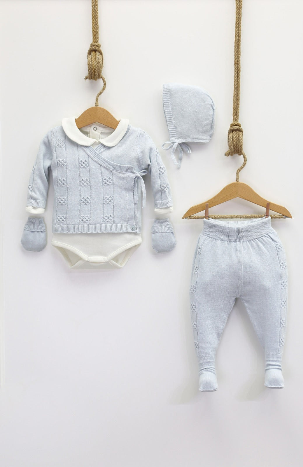 Beautiful Baby Blue Knitted Baby 5 piece set(Jumper/Trousers/Hat/Bodysuit/Mittens)