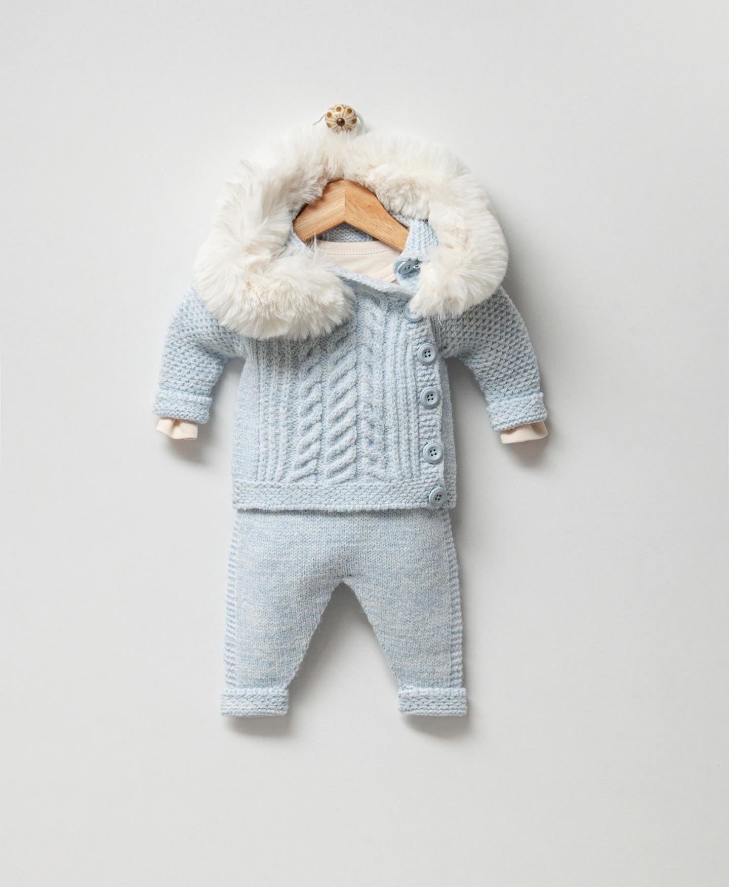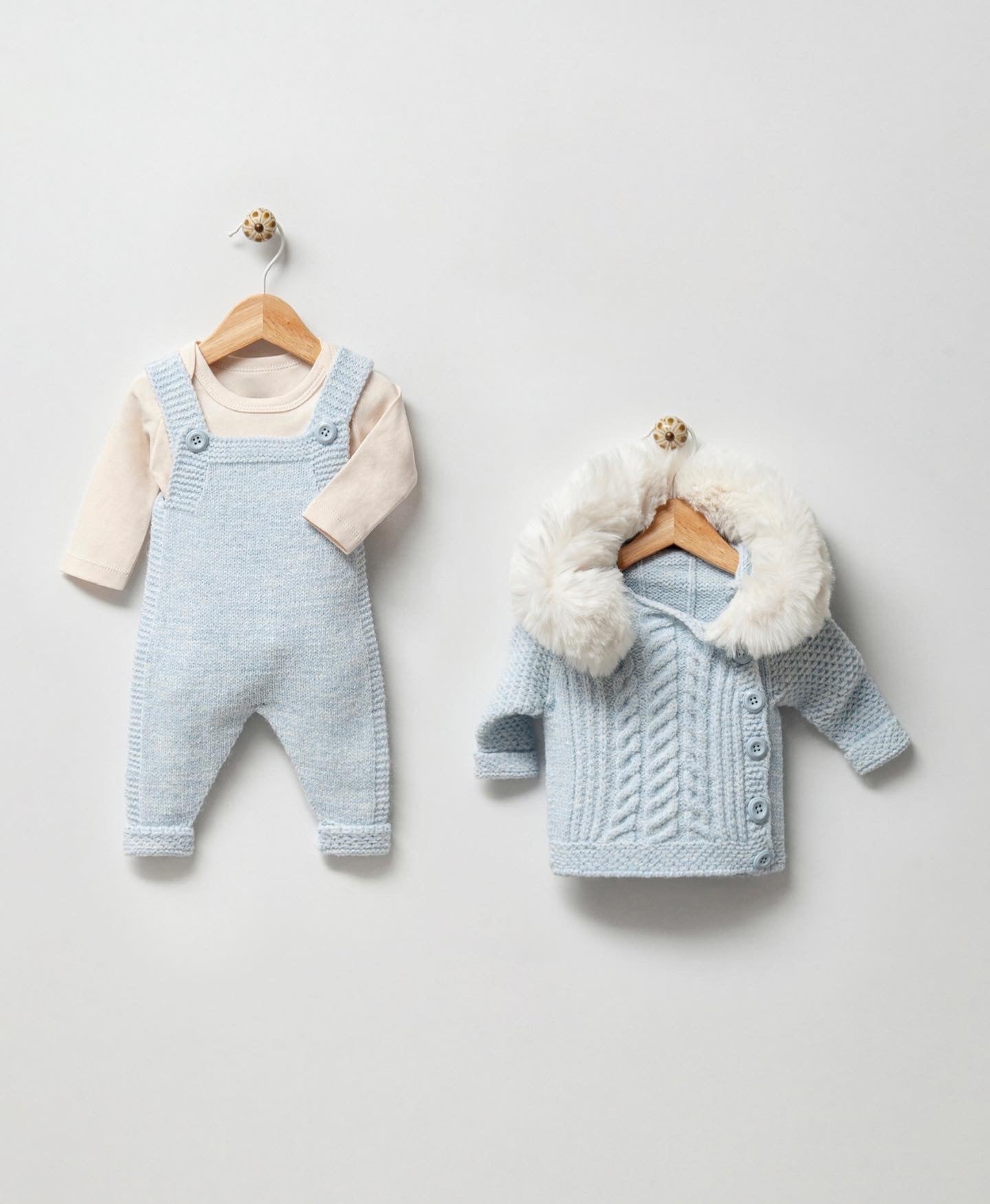 Beautiful Blue Knitted Cardigan/Dungarees/Bodysuit 3 piece set with White Synthetic fur trim.