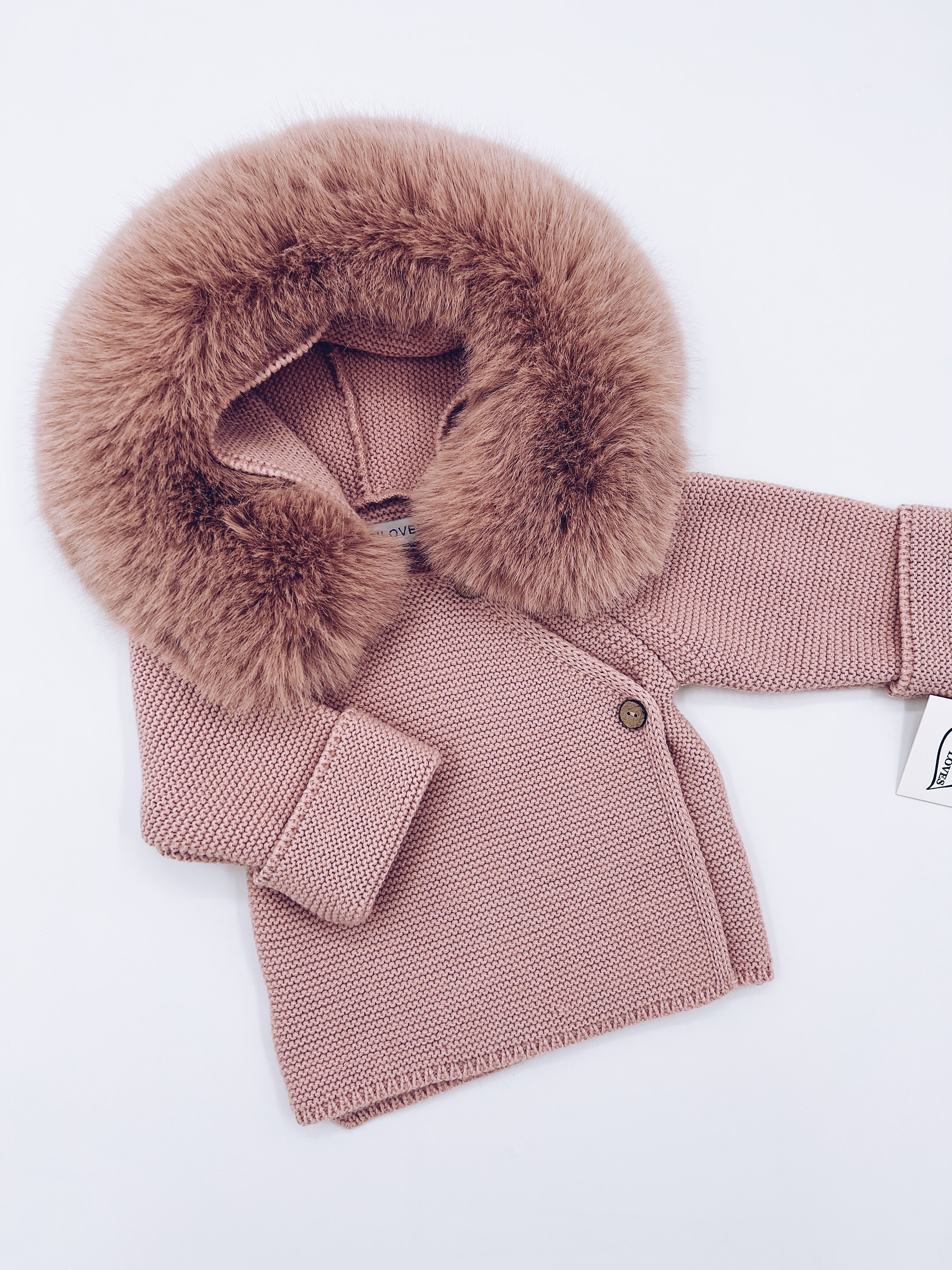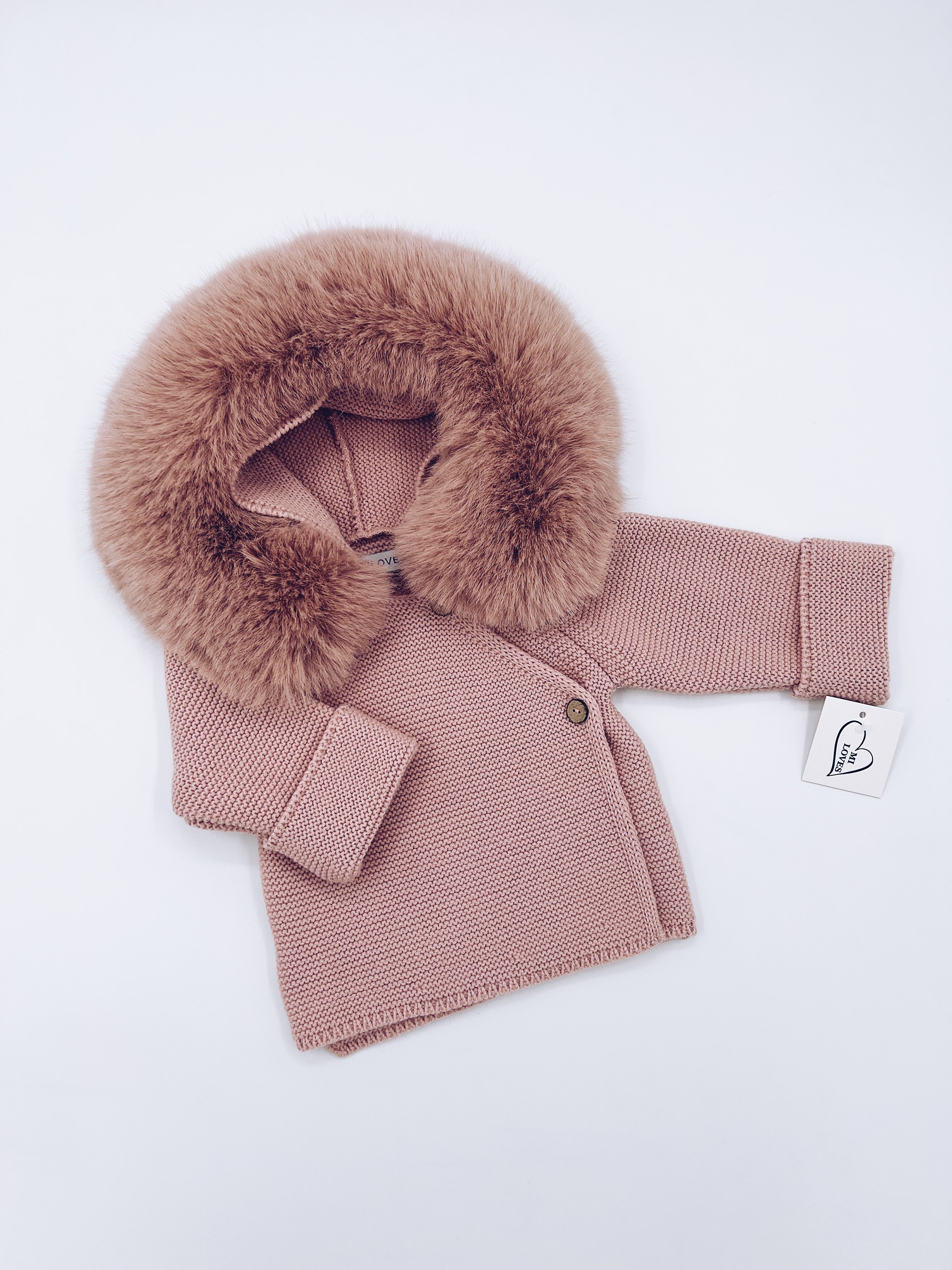 Beautiful Dusty Pink Knitted Cardigan with Synthetic fur trim.