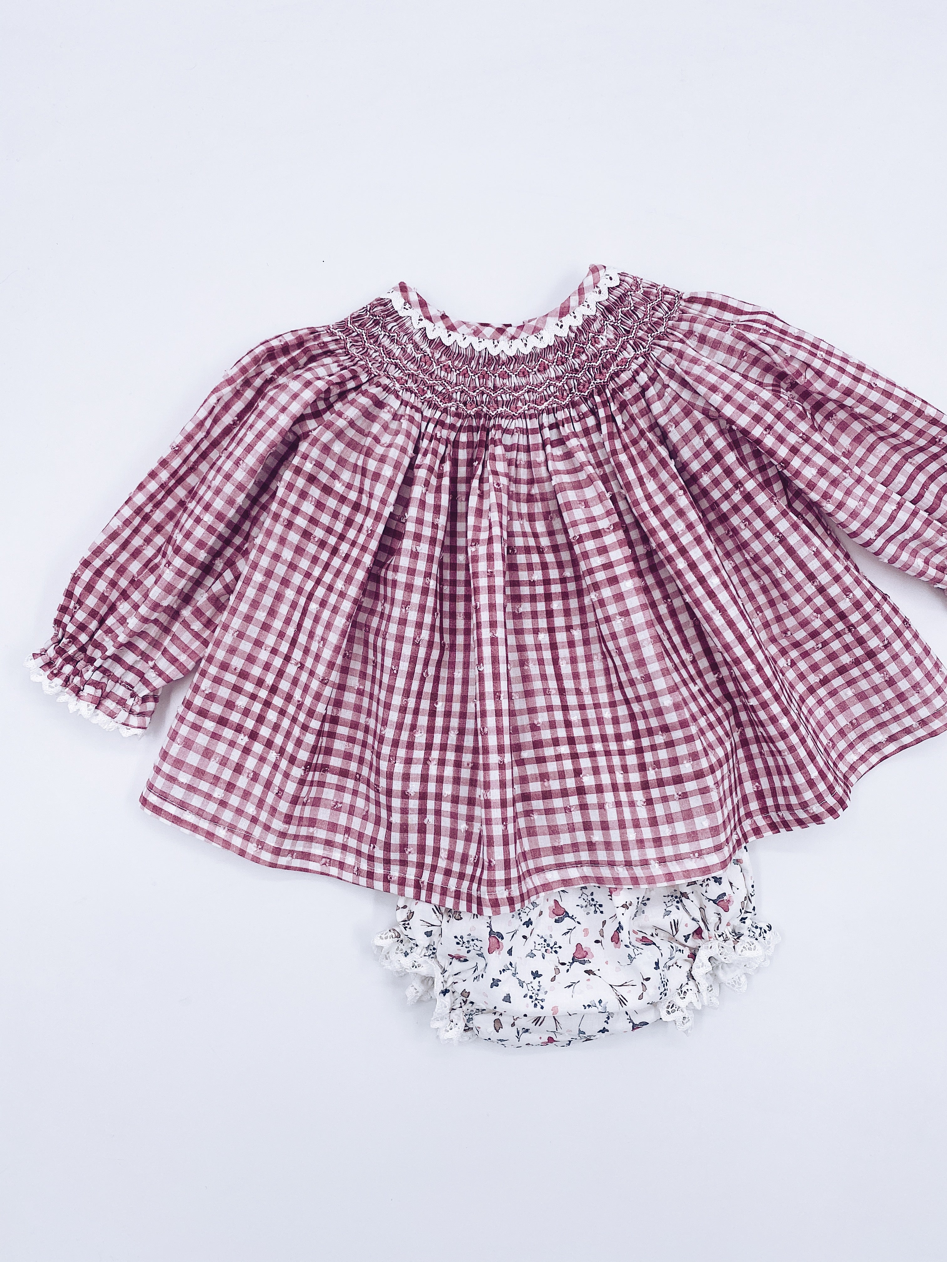 Beautiful floral dress/bloomers 2 piece set with hand smoking details.