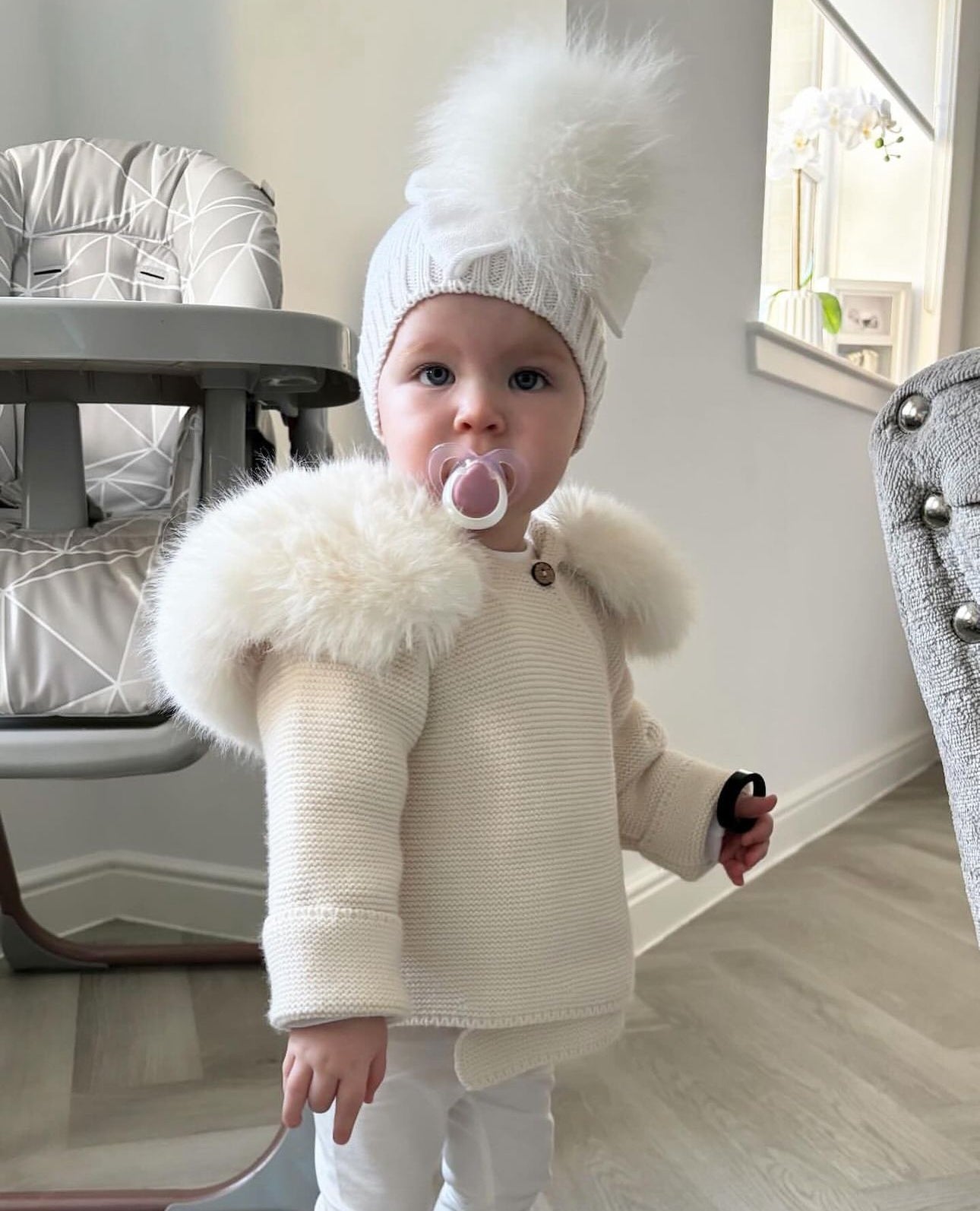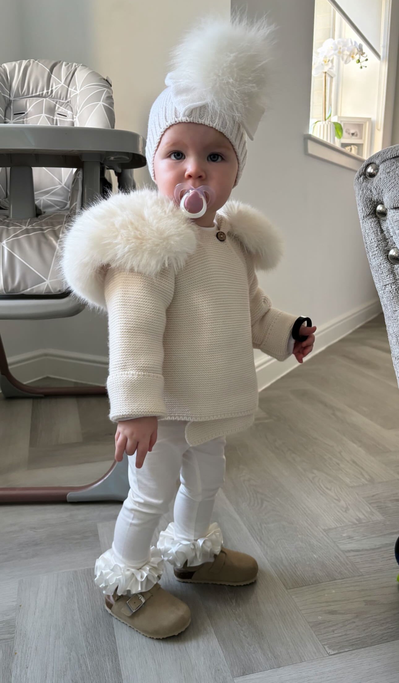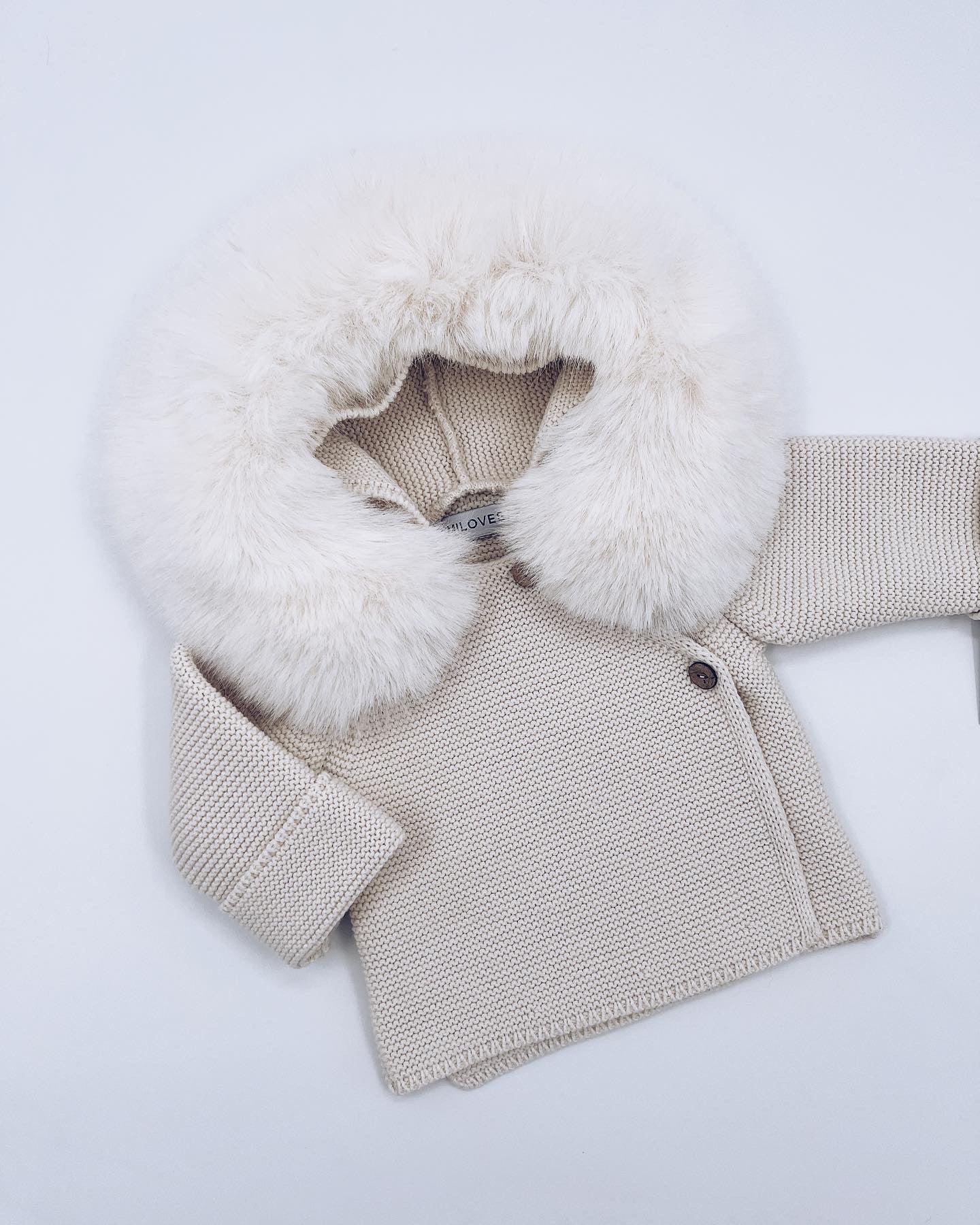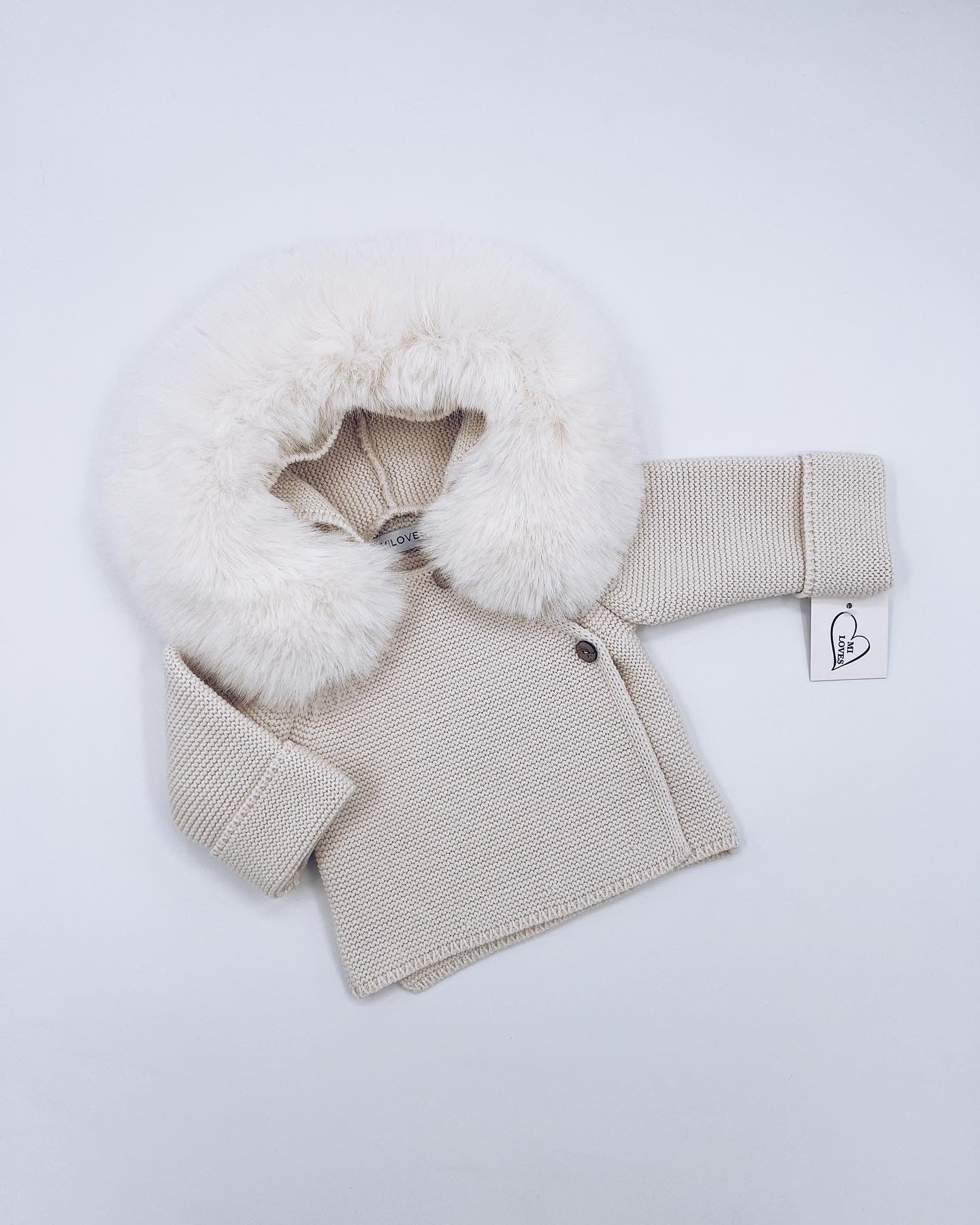 Beautiful Light Cream Knitted Cardigan with Synthetic fur trim.