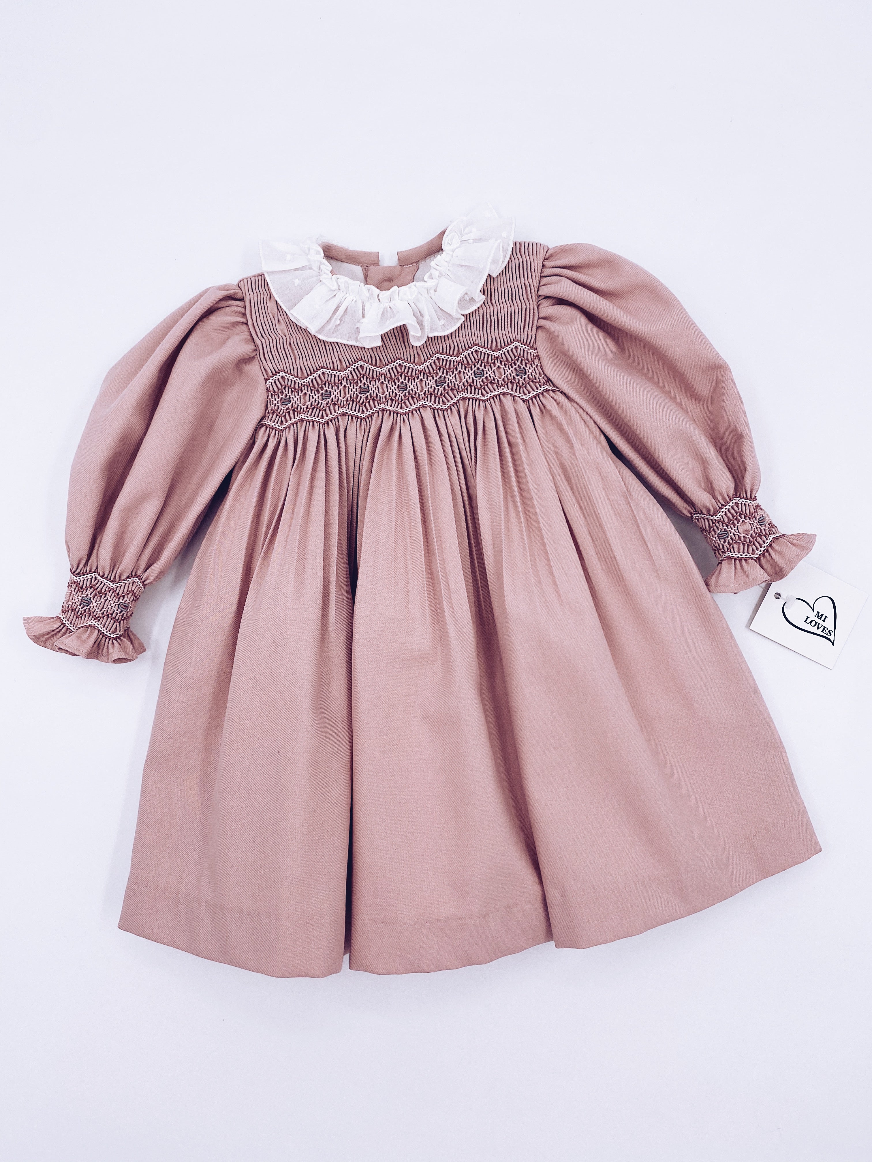 Beautiful ROYAL dusty pink dress with hand smoked details on the neck and sleeves.
