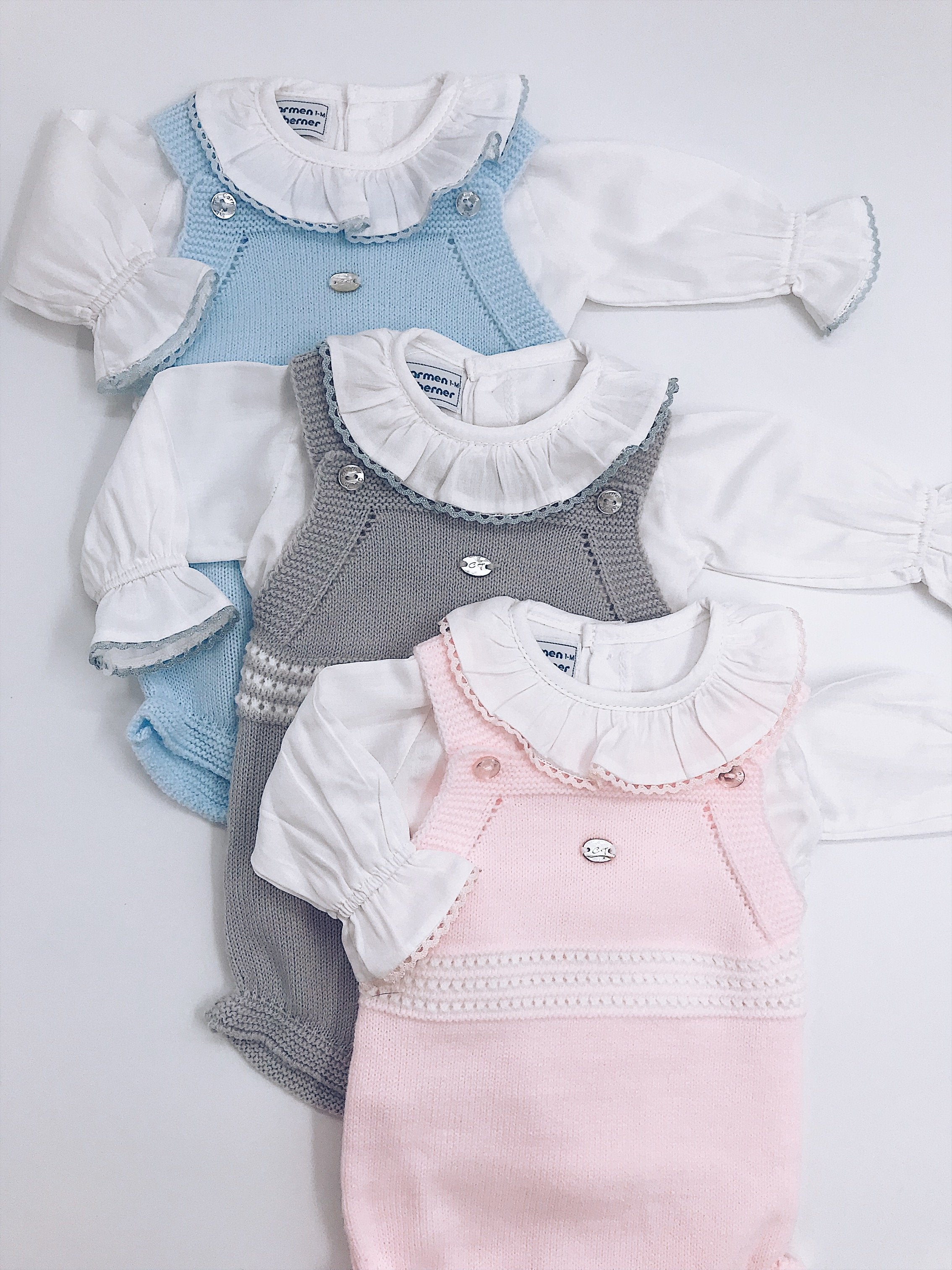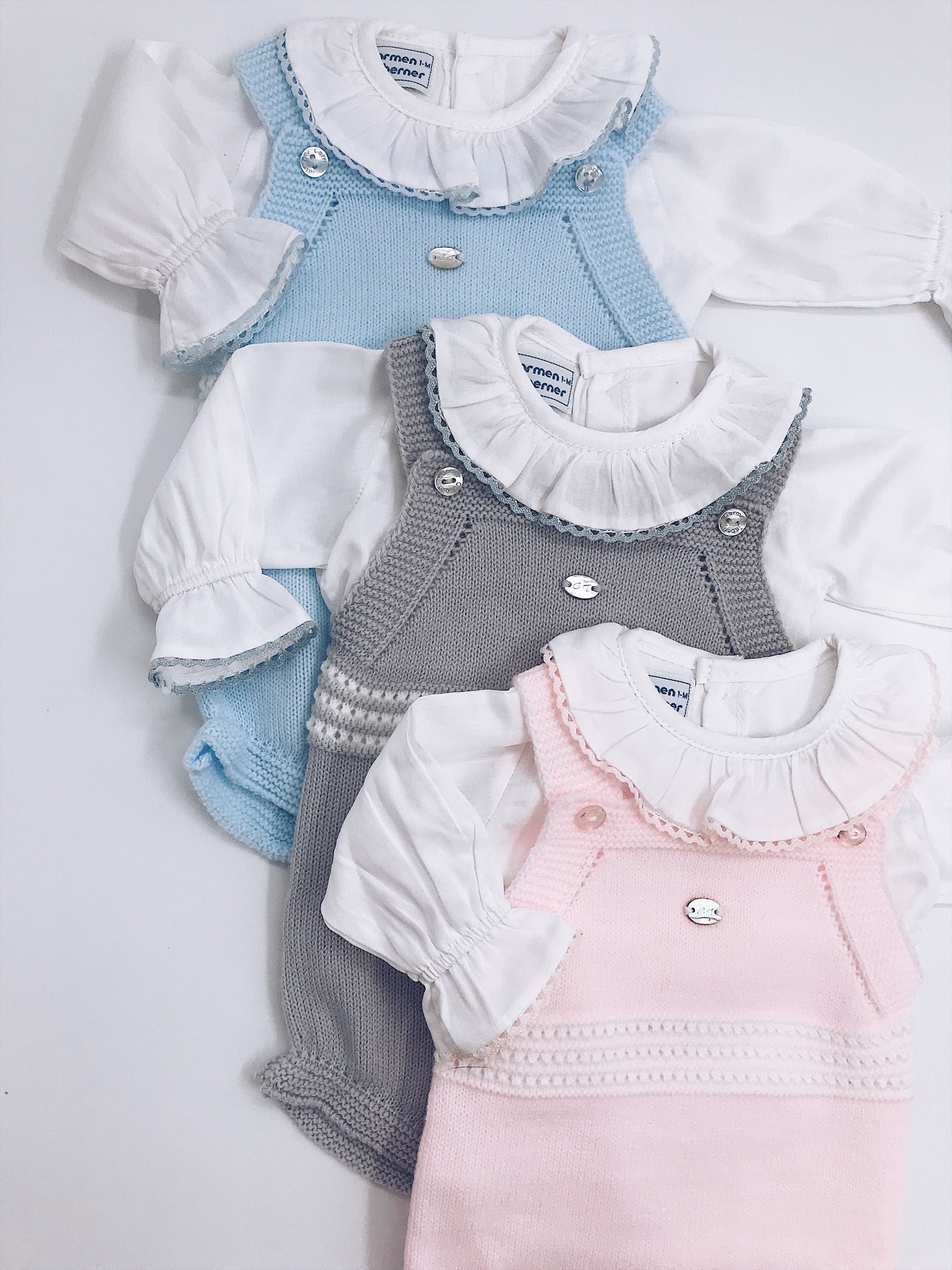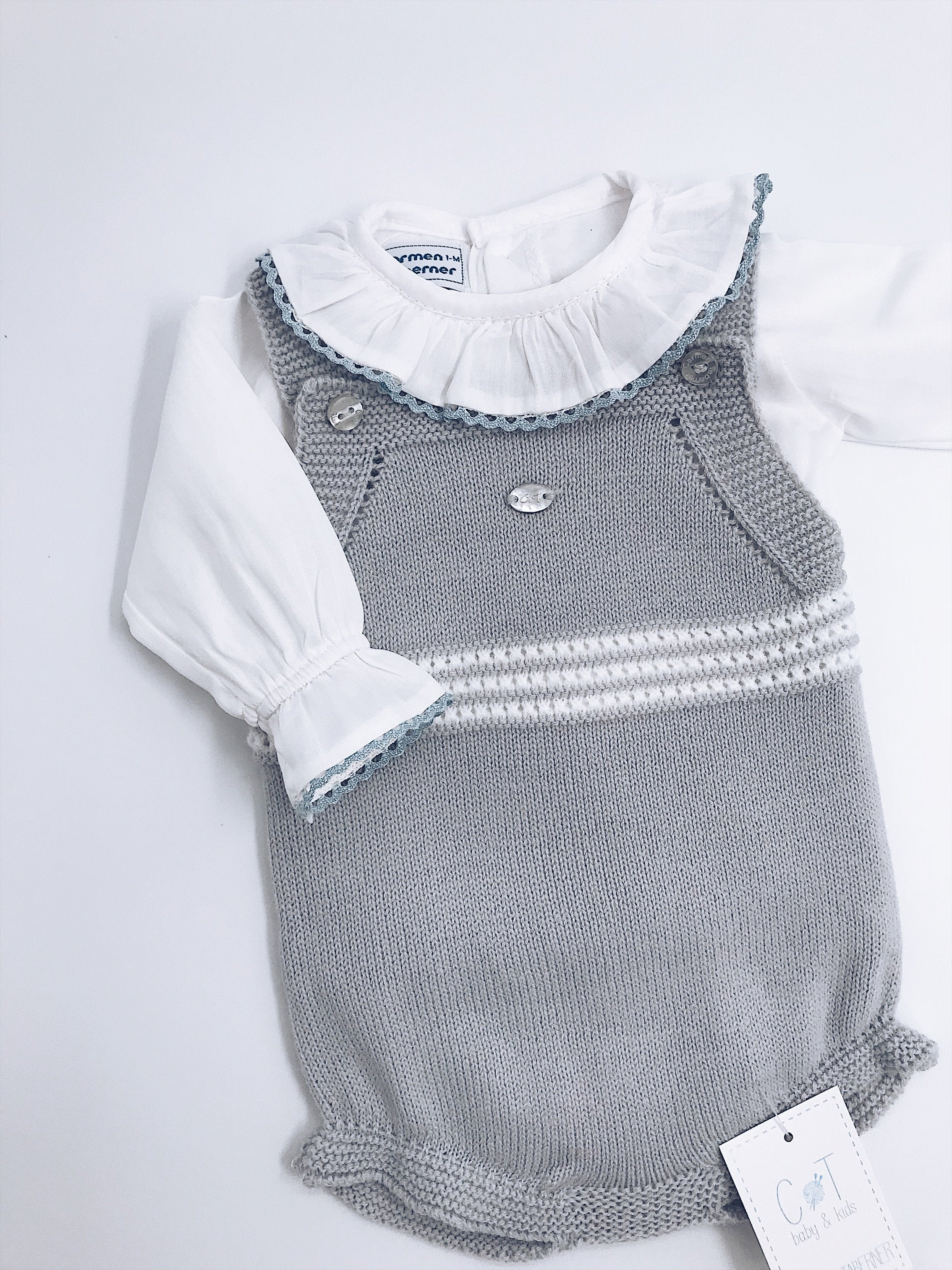 Carmen Taberner Knitted romper and Bodysuit/Blouse set.Beautiful ,silky smooth and soft set from one of the Best Spanish brands Carmen Taberner,if you are looking the Best quality items for your little bundle of joy look no further.
