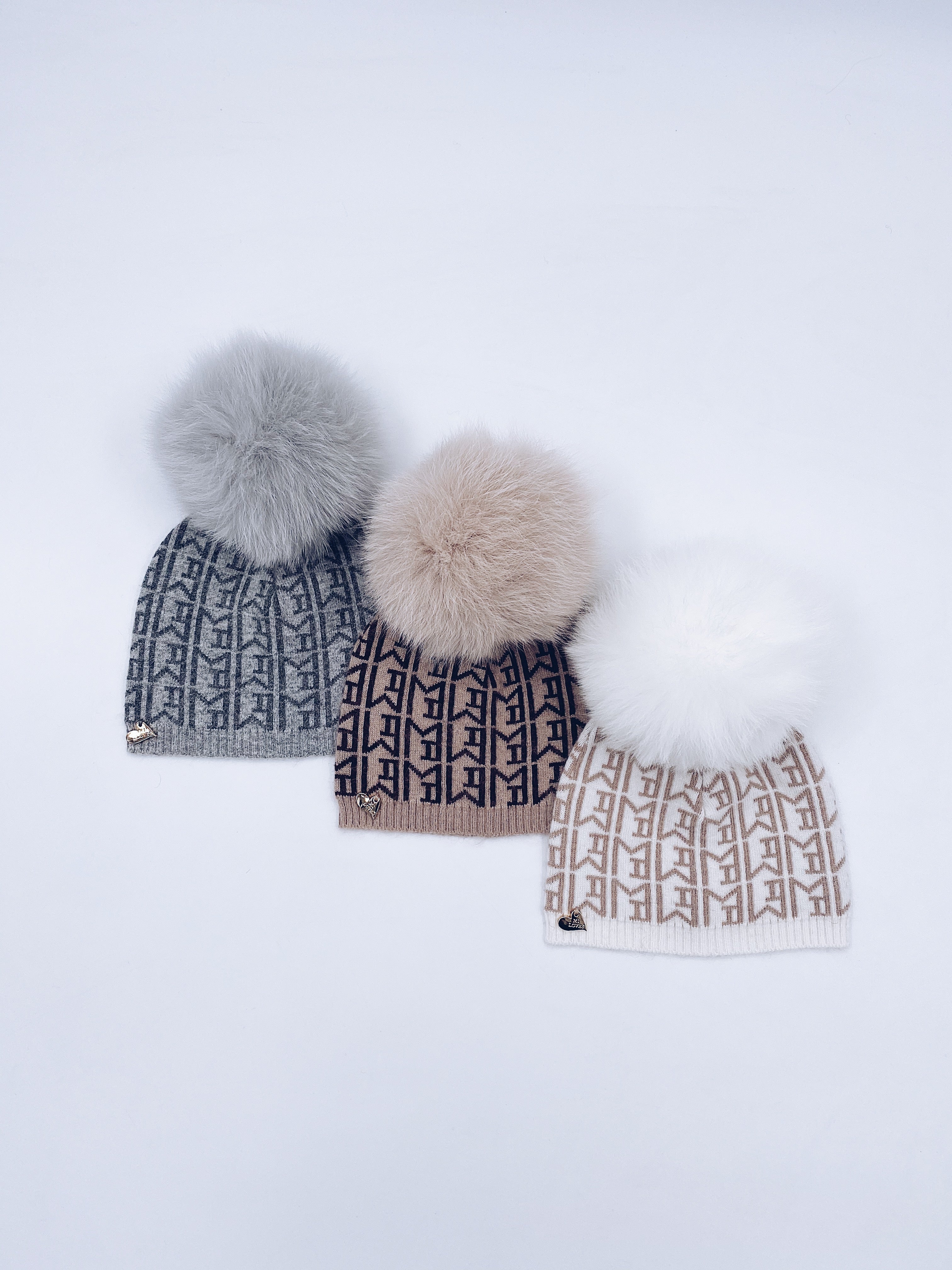 MI LOVES SIGNATURE MONOGRAM Kids hat with Fox fur pompom.