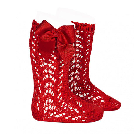 Cotton open work Knee high socks with bow Red(550)