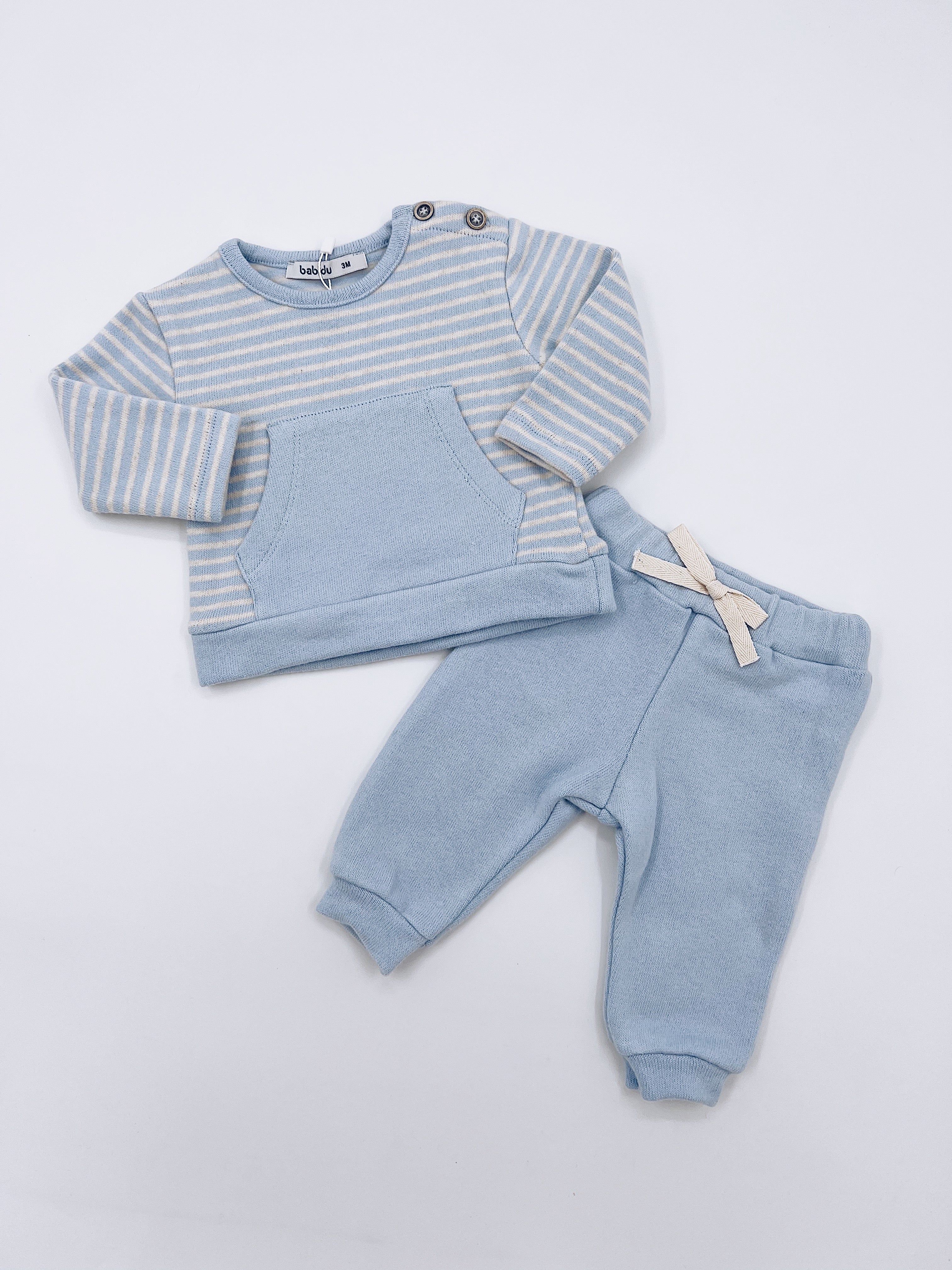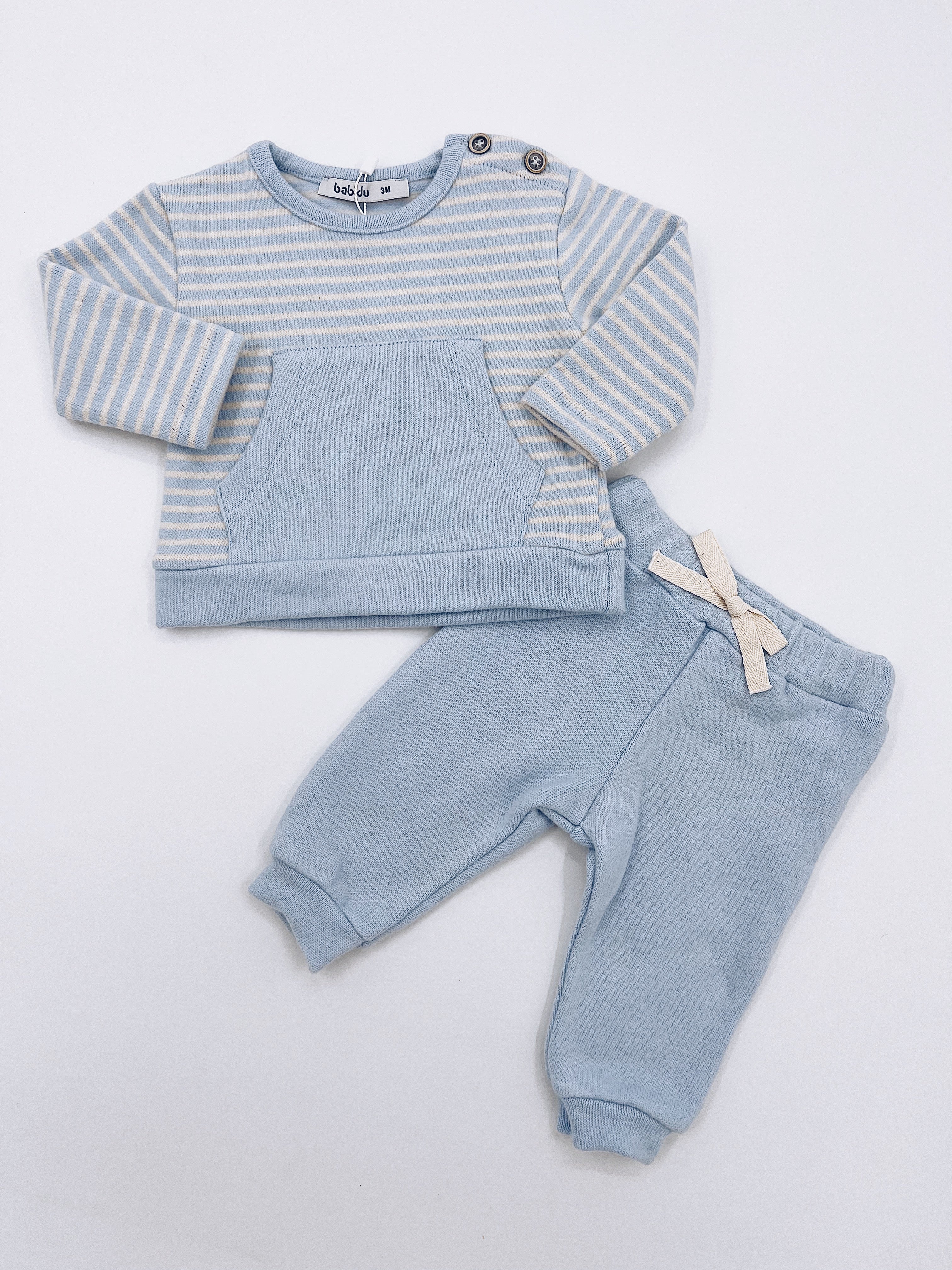 Comfortable blue trouser set for younger boys from Babidu, made in knitted cotton jersey with a cosy brushed feel.