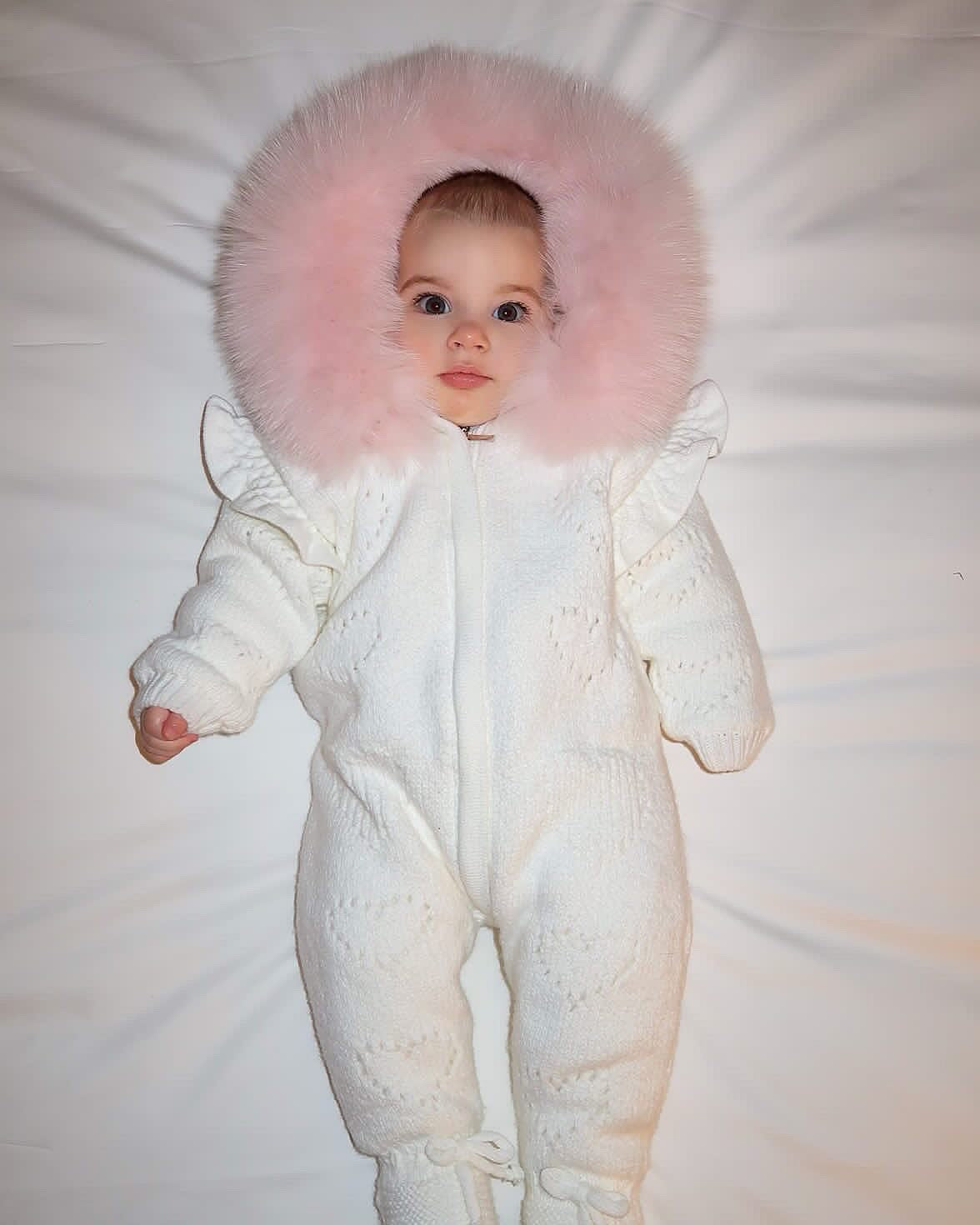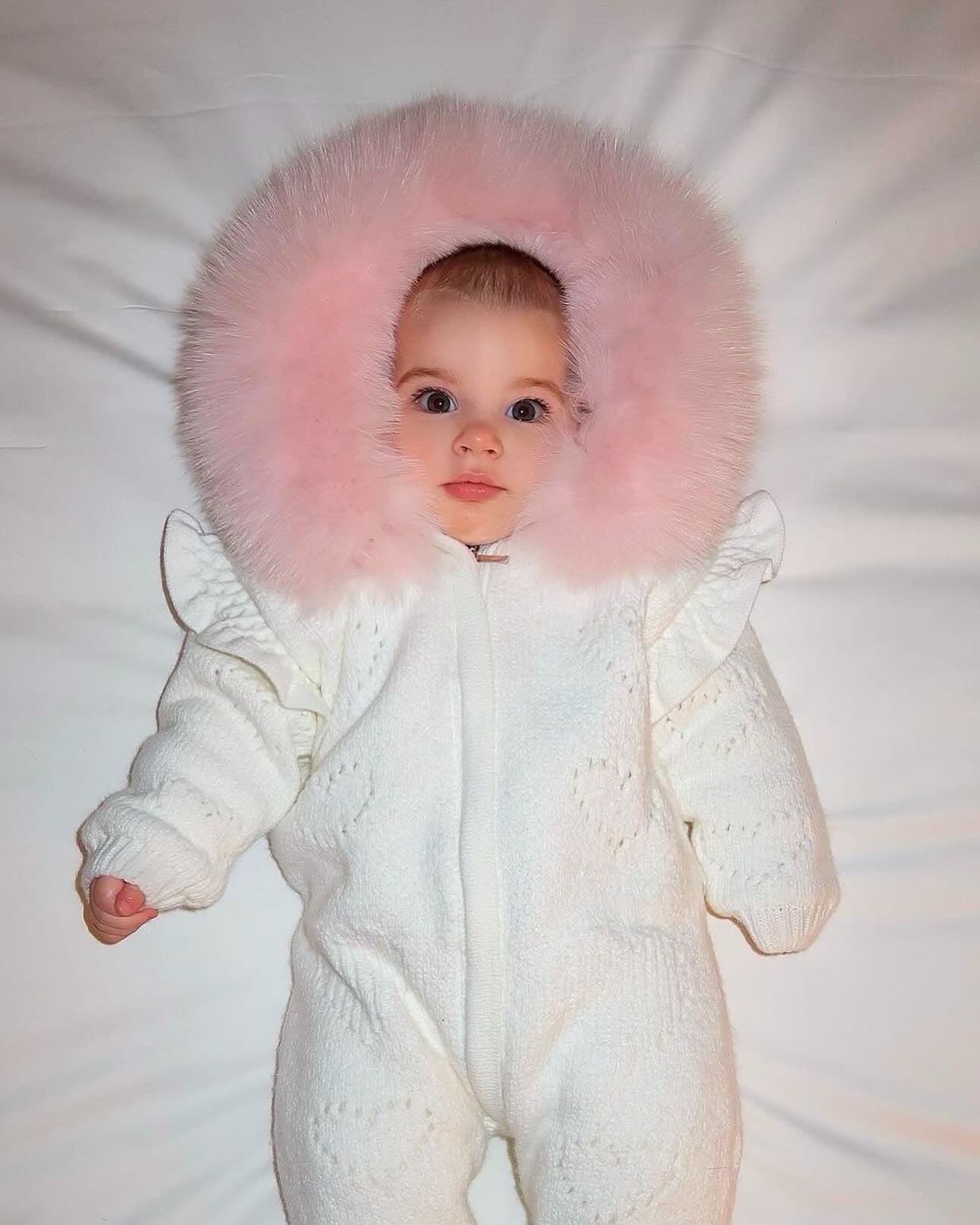 Ivory MI LOVES SIGNATURE Little Hearts Pramsuit with Pink Fox fur trim. Beautiful and Luxurious Baby Pramsuit featuring detachable Fox fur trim on the hood. Zip fastening.