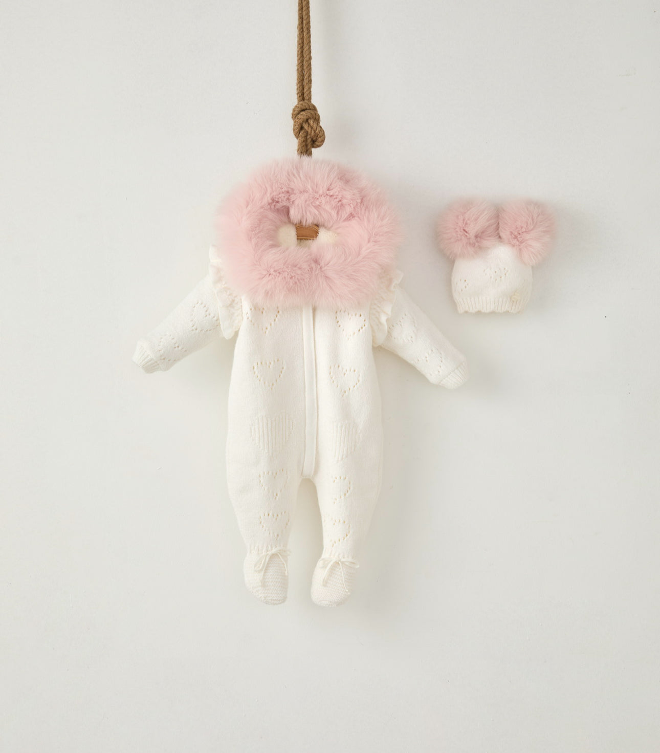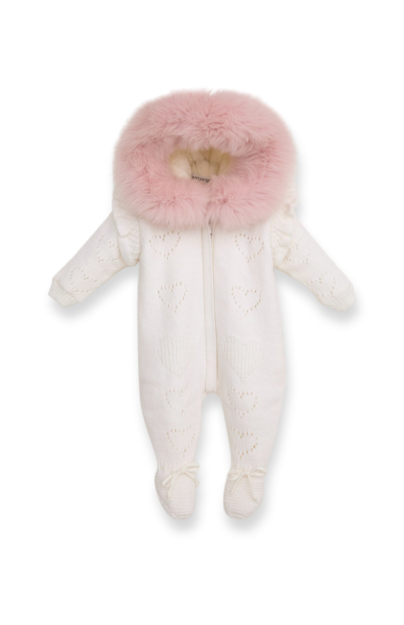 Ivory MI LOVES SIGNATURE Little Hearts Pramsuit with Pink Fox fur trim.